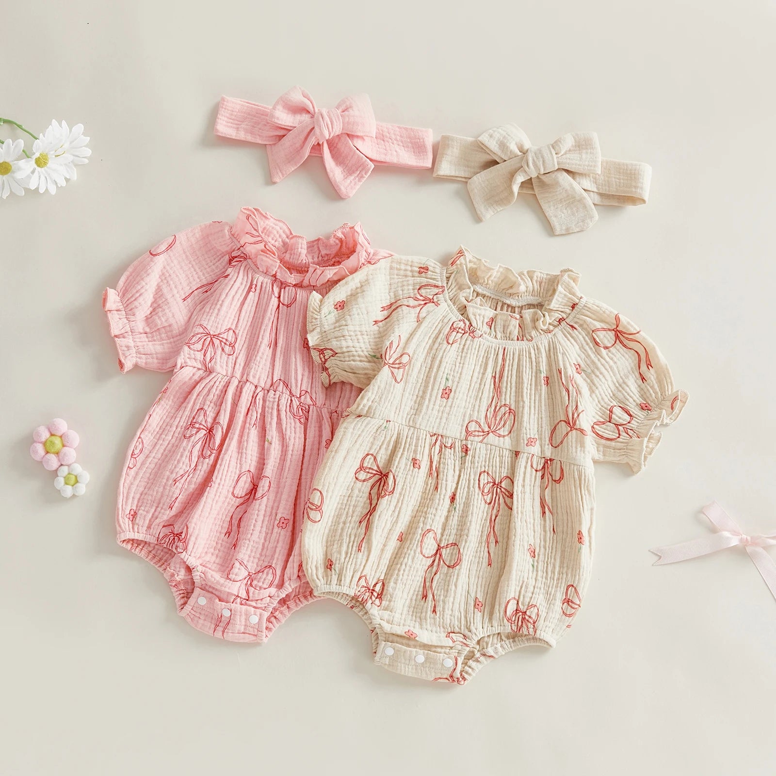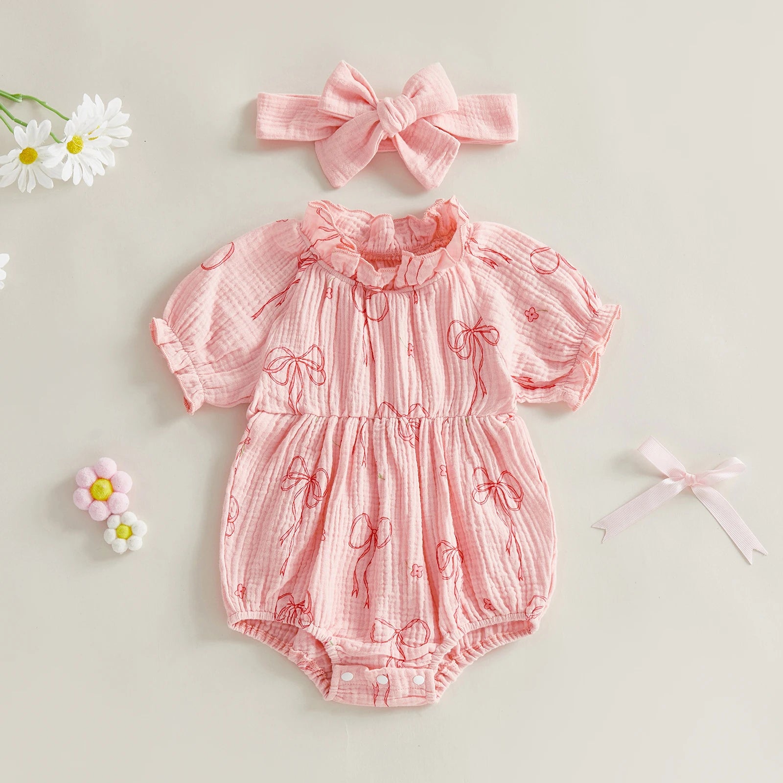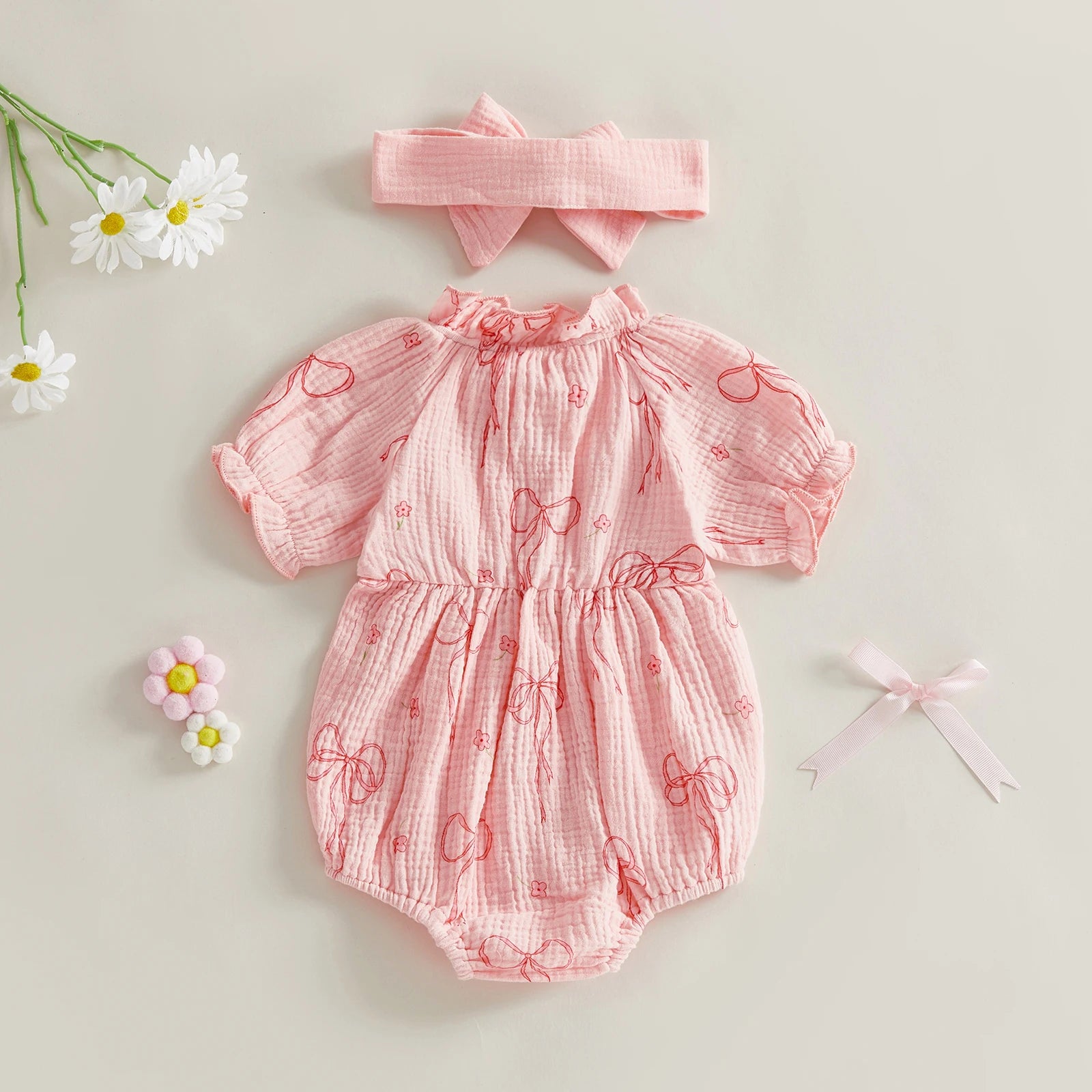 Baby Girls 2Pcs Outfit Cute Short Sleeve Round Neck Bow Flower Print Jumpsuit with Headband Set
