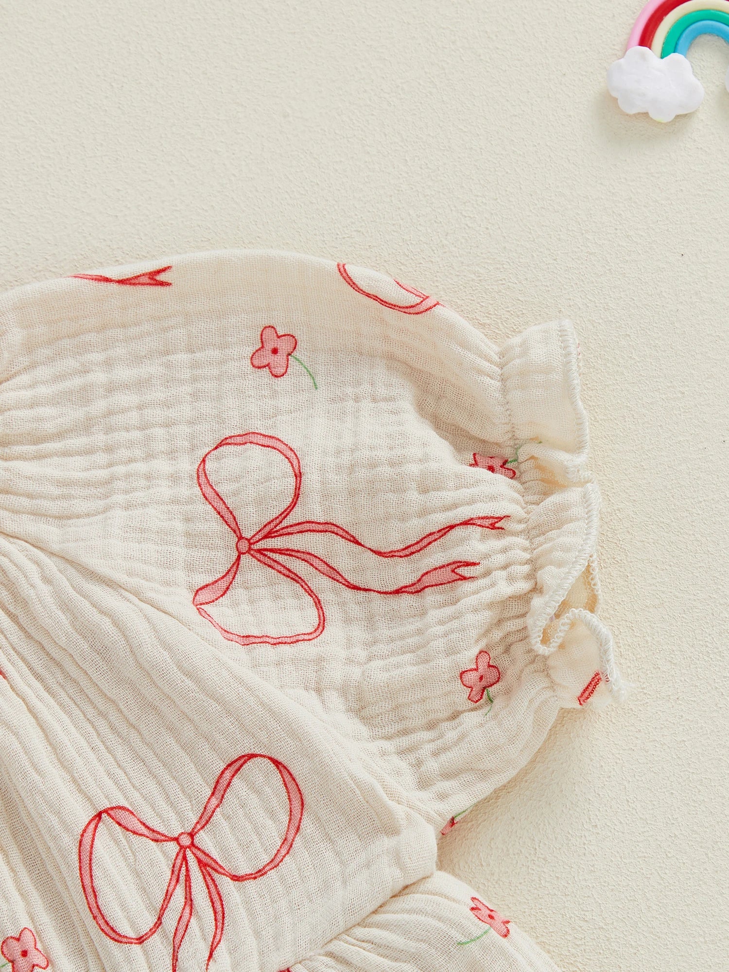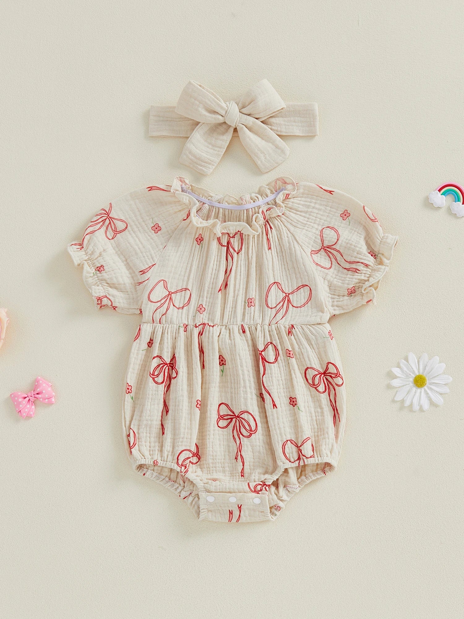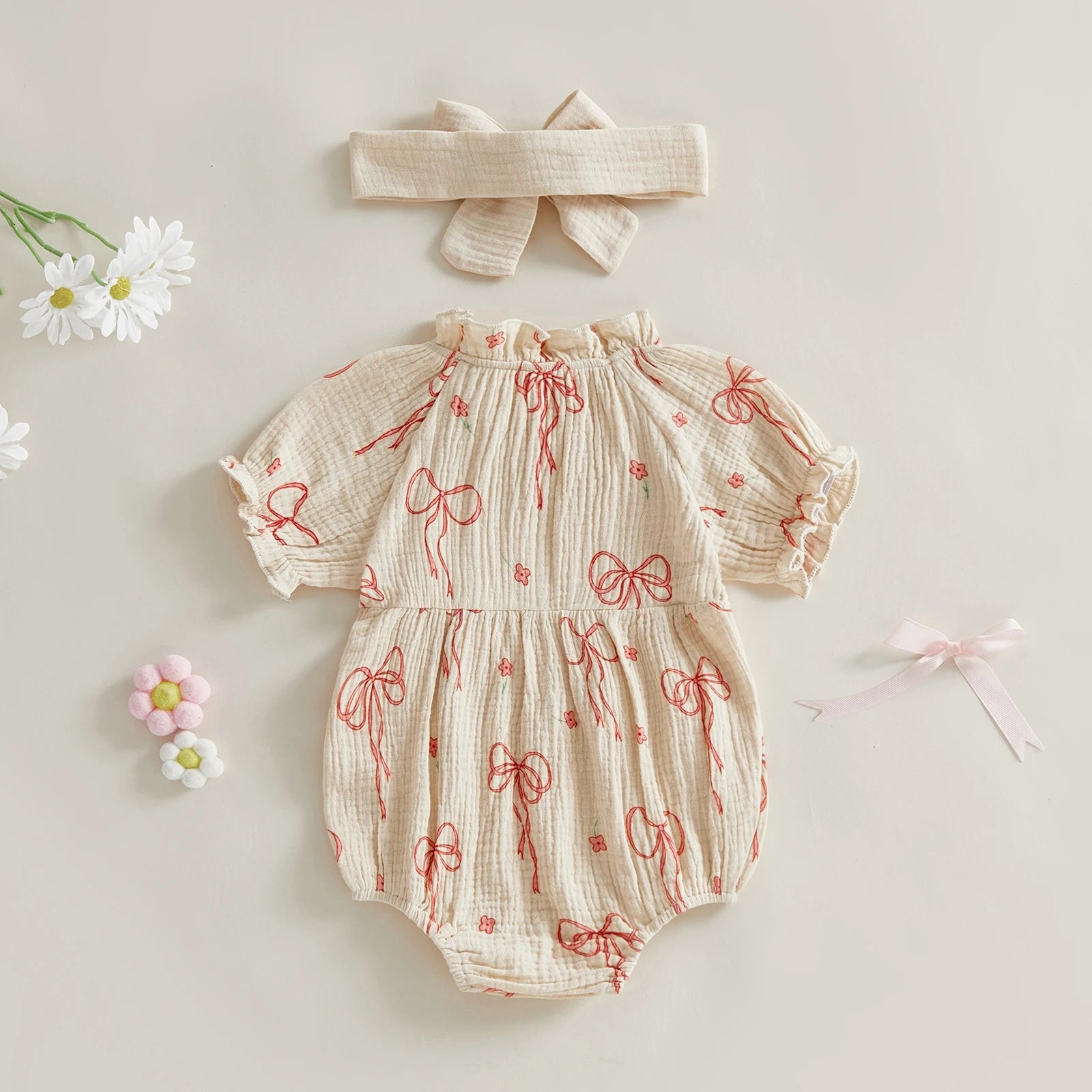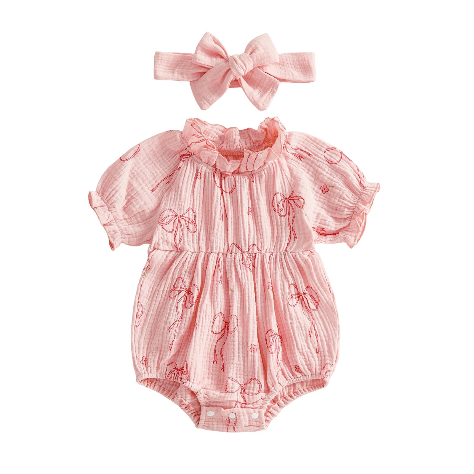 Baby Girls 2Pcs Outfit Cute Short Sleeve Round Neck Bow Flower Print Jumpsuit with Headband Set
