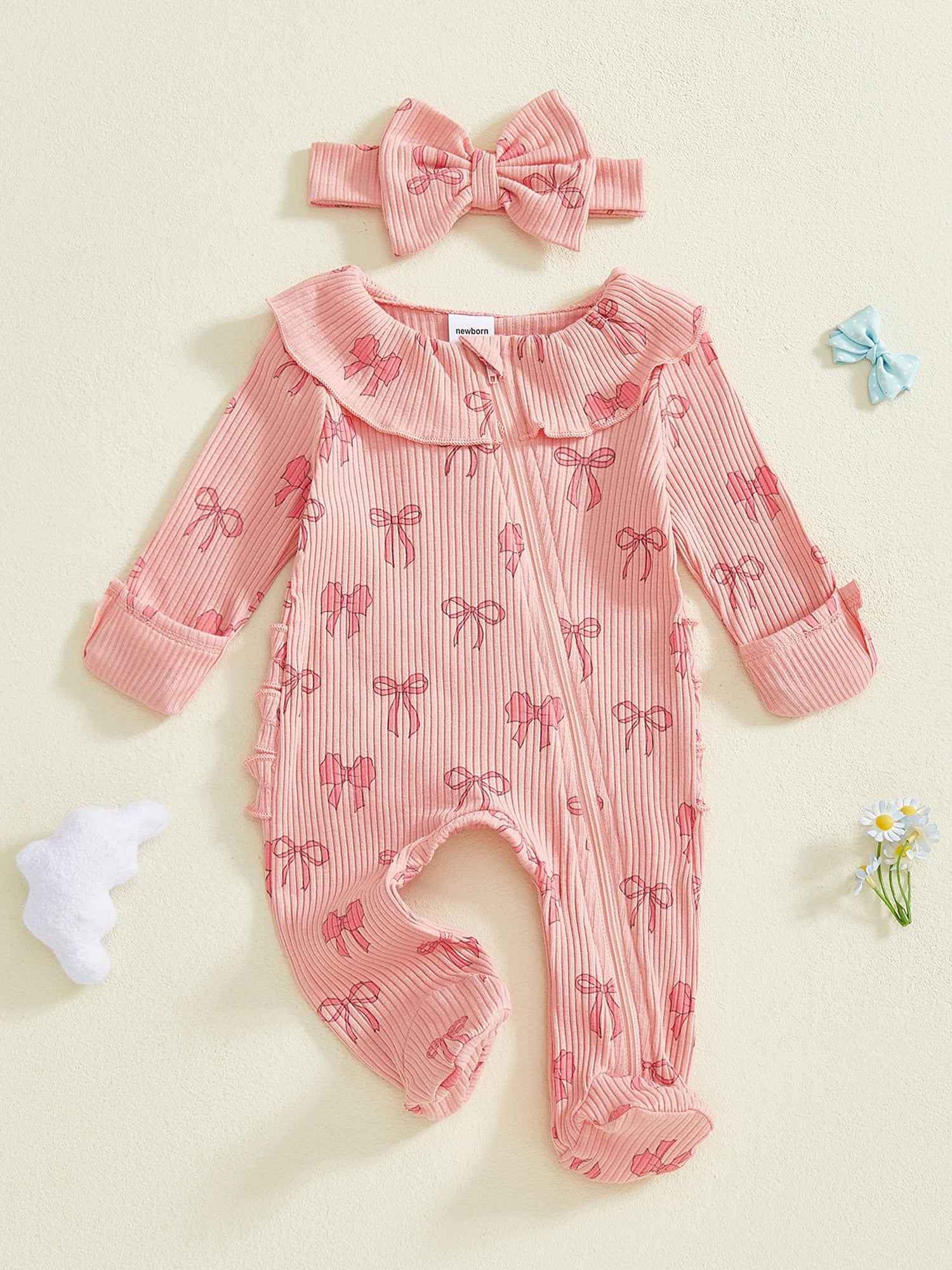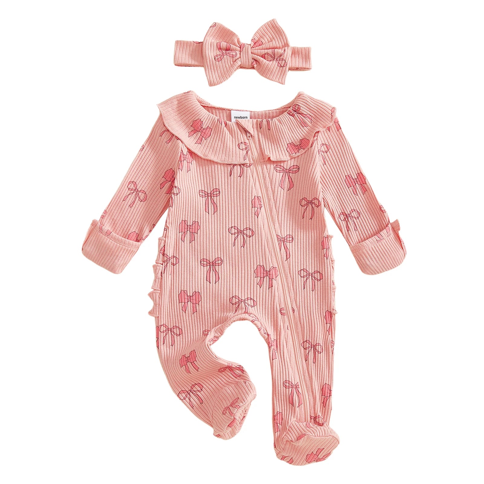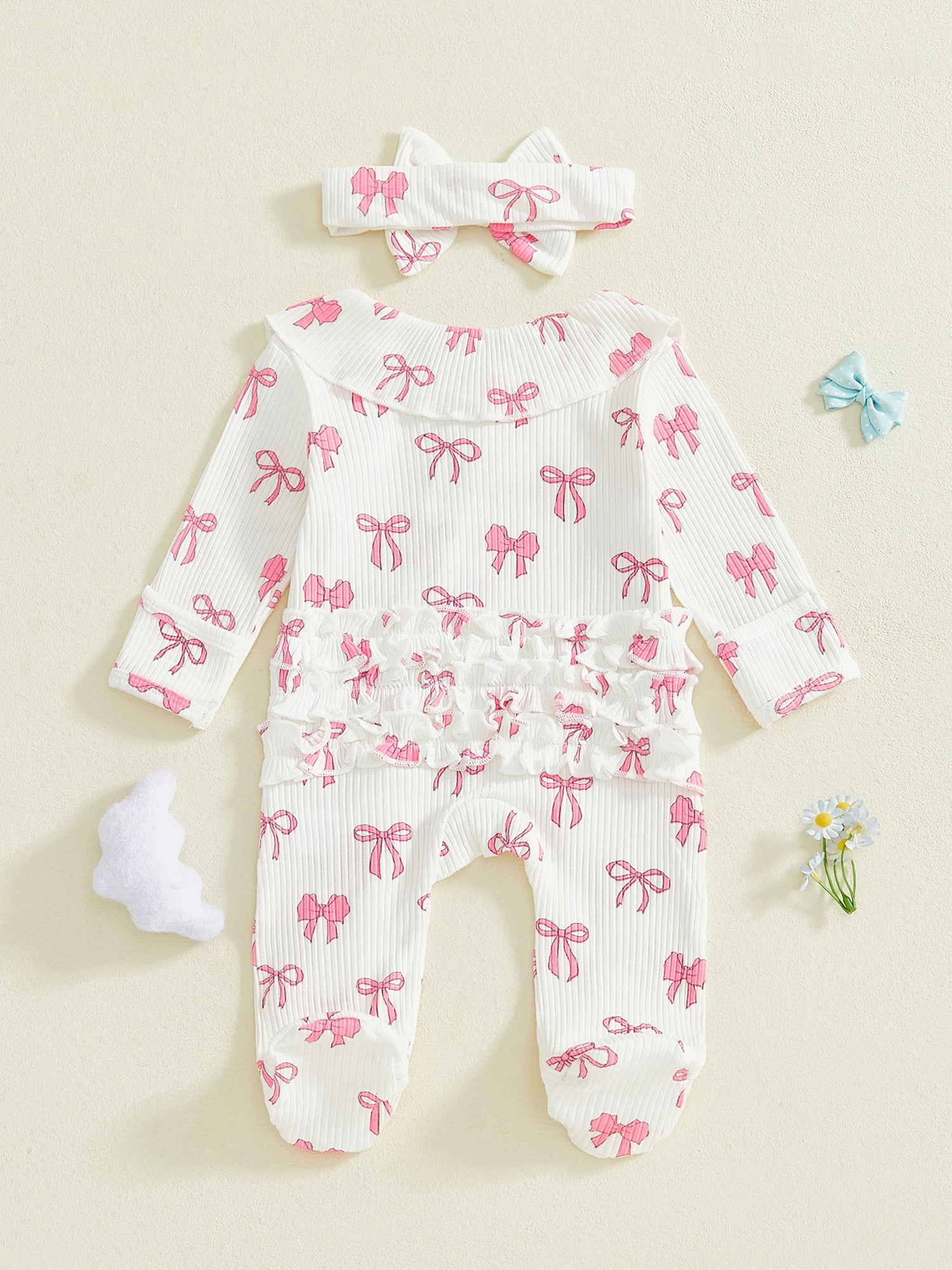 Baby Girls 2Pcs Outfits Cute Long Sleeve Round Neck Bow Print Full Length Footed Jumpsuit with Bow Headband Set