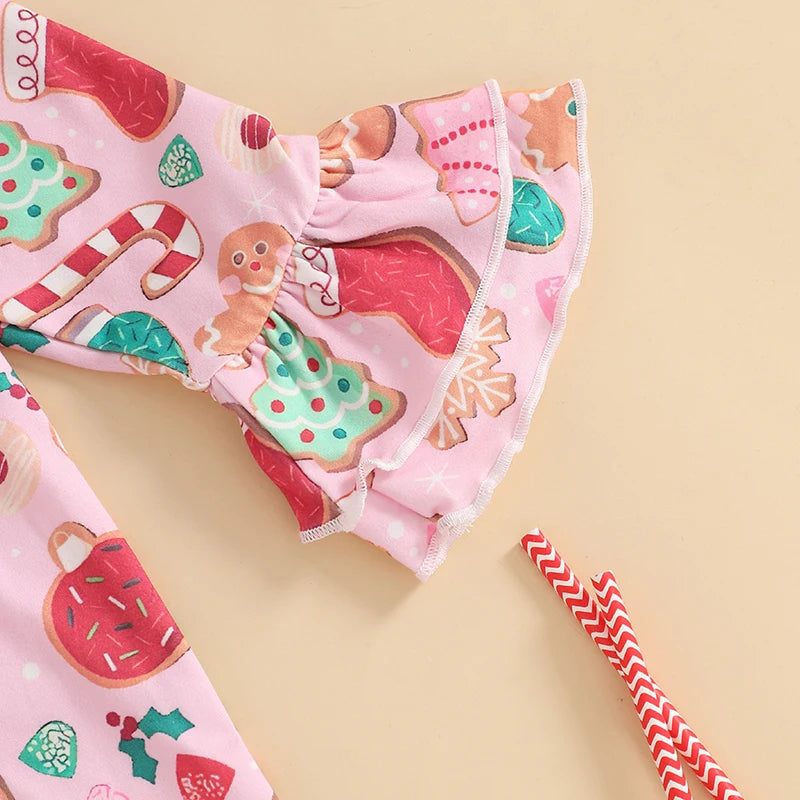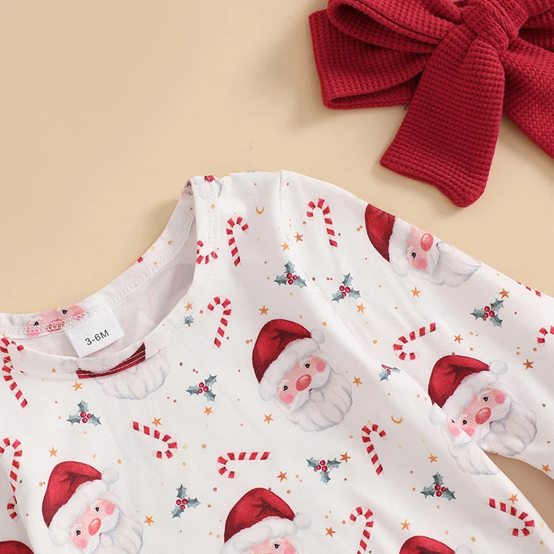 Baby Girls 2Pcs Romper Christmas Print Long Sleeve Jumpsuits Flare Sleeve and Pant and Cute Headband Set Infant Outfits