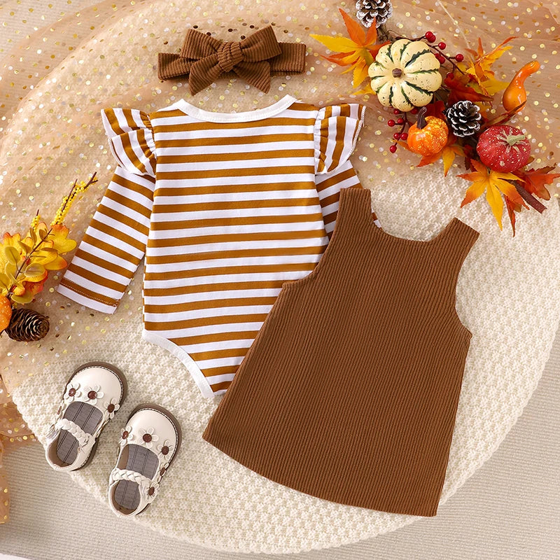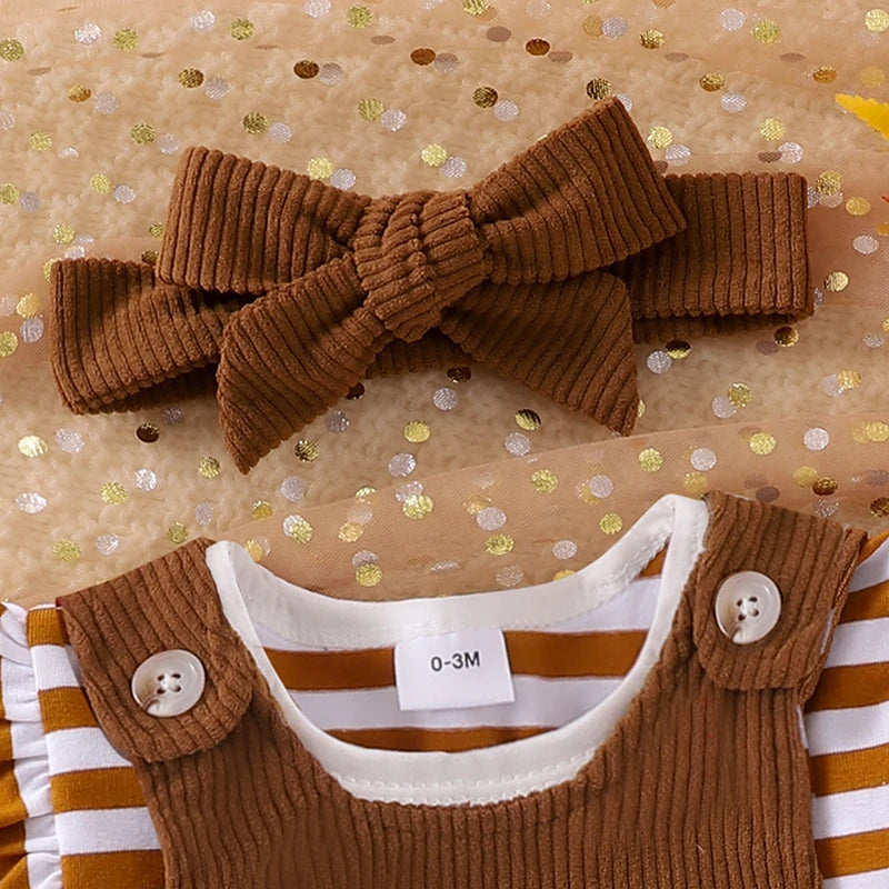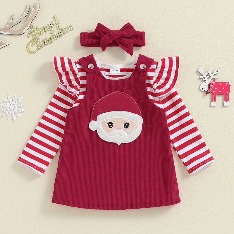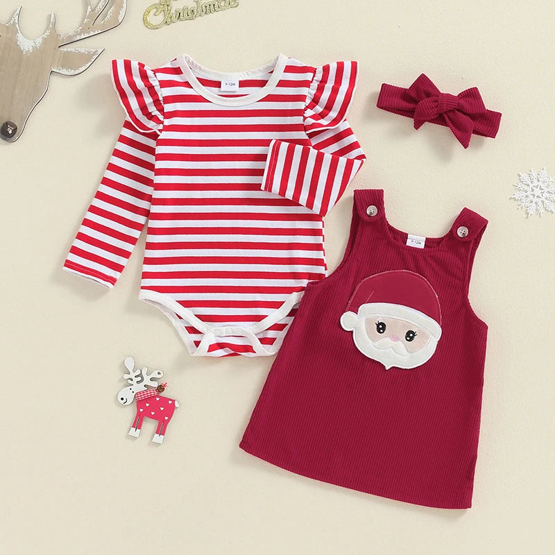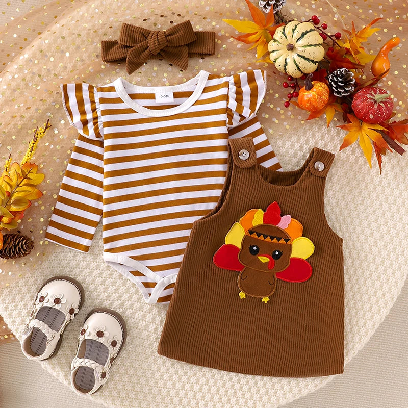 Baby Girls 2Pcs Thanksgiving Christmas Outfits Stripe Long Sleeve Romper Turkey / Santa Embroidery Overalls Dress Headband Set