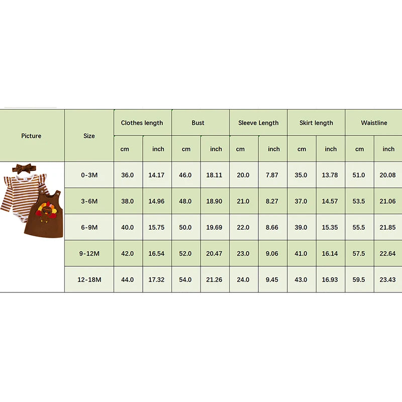 0-3M Tops Length: 14.17 Bust: 18.11 Shoulder: 7.87 Dress Length: 13.78 Waist: 18.9 Advised Age: 0-3 Months