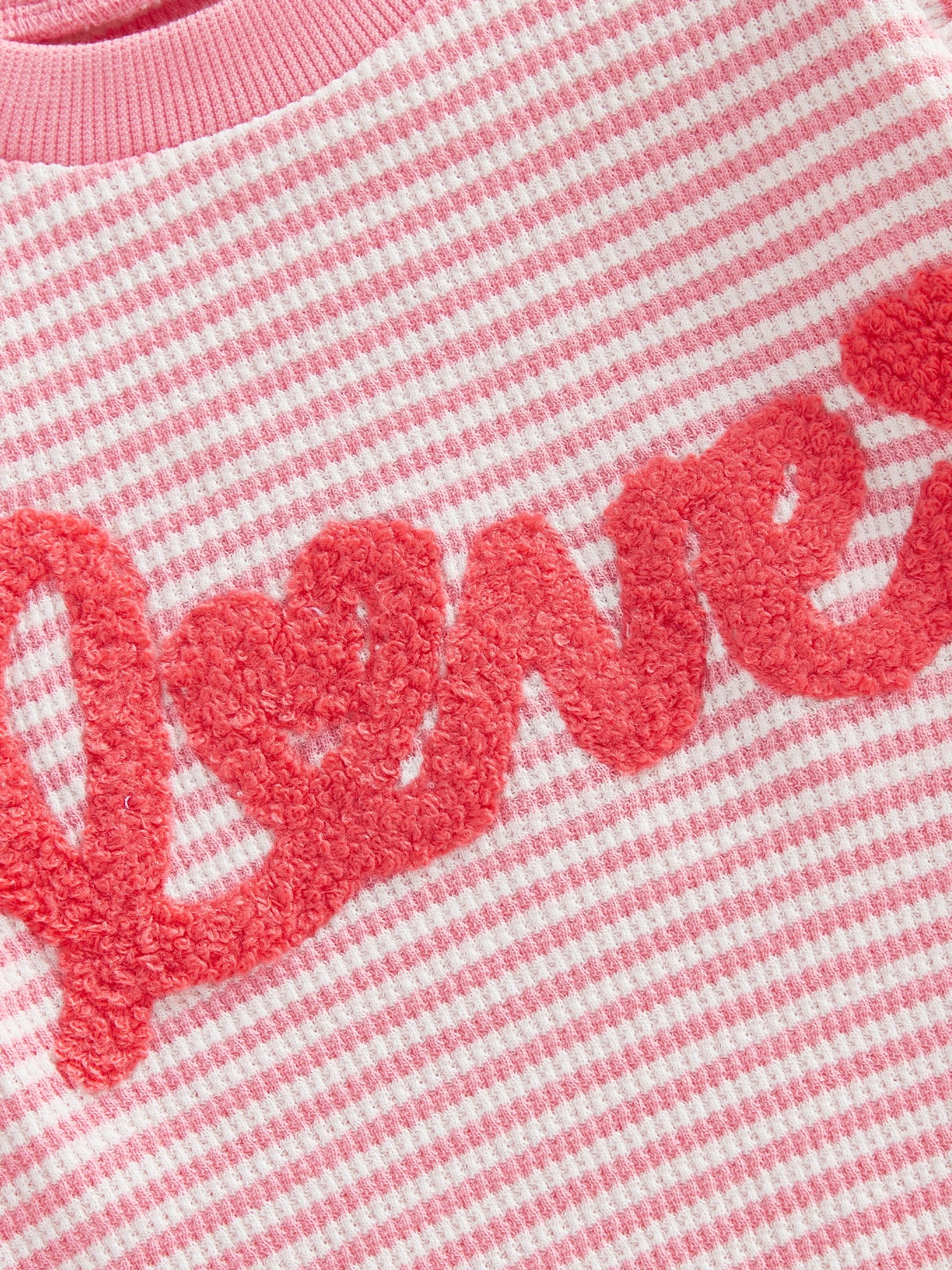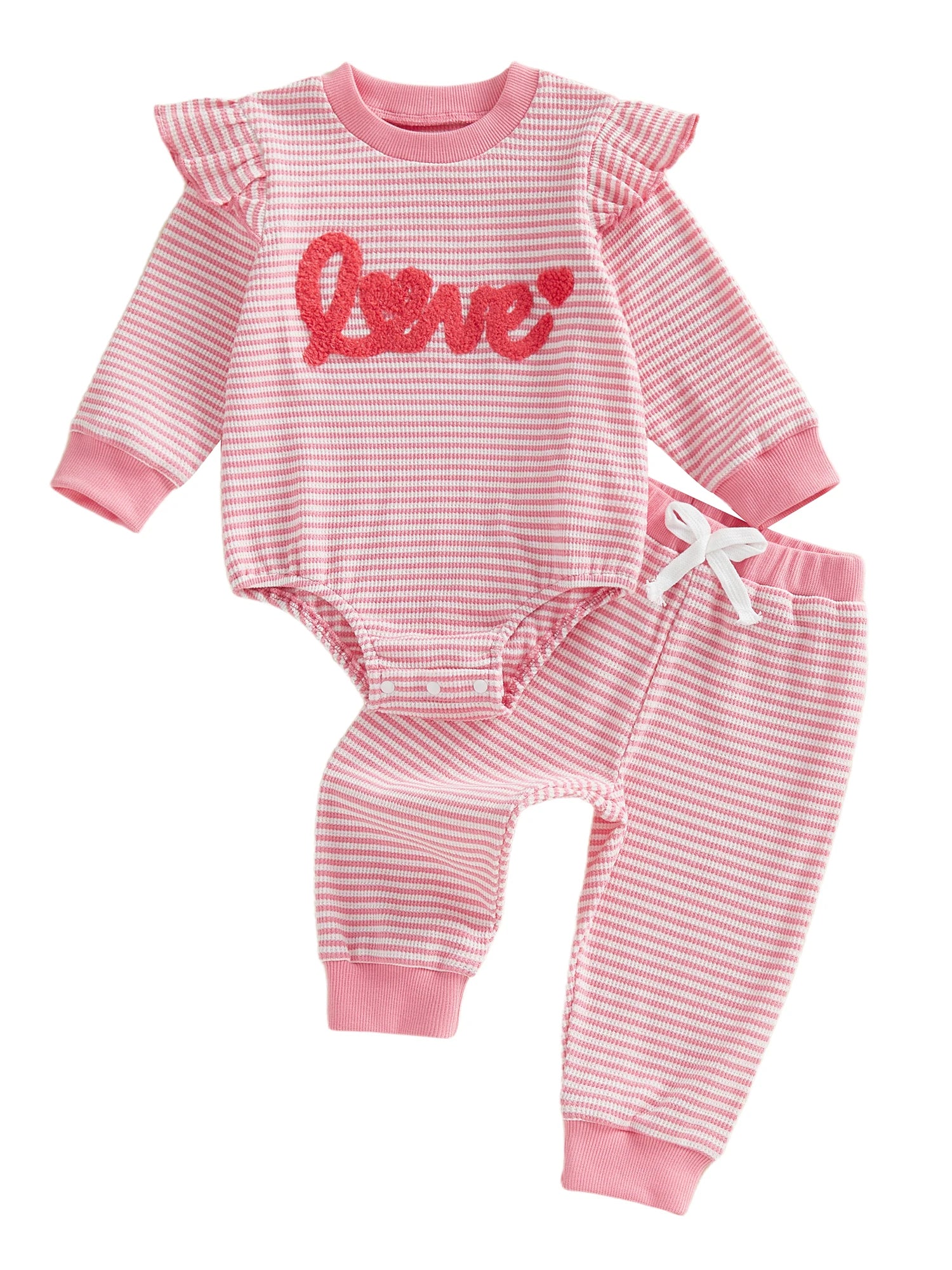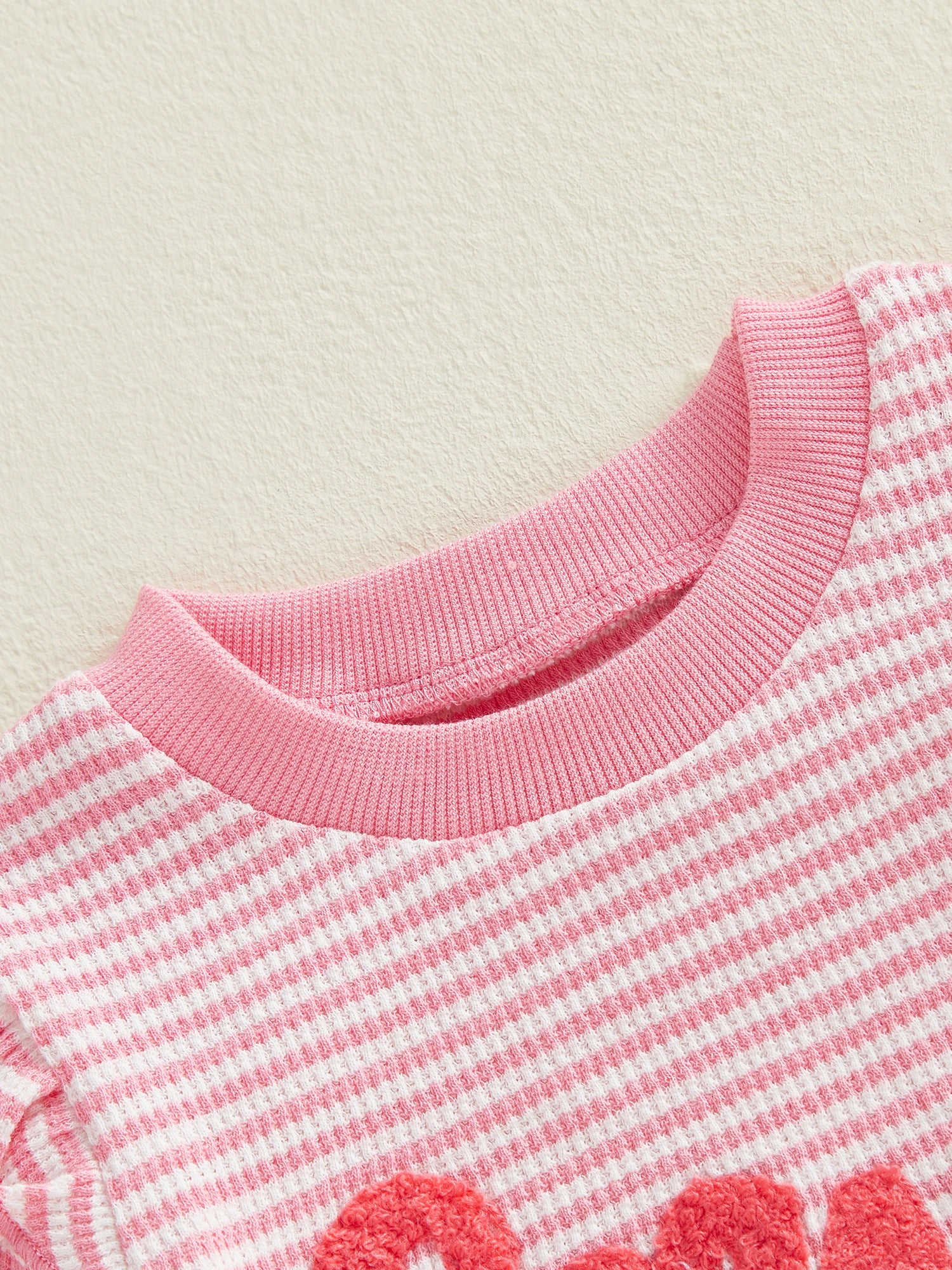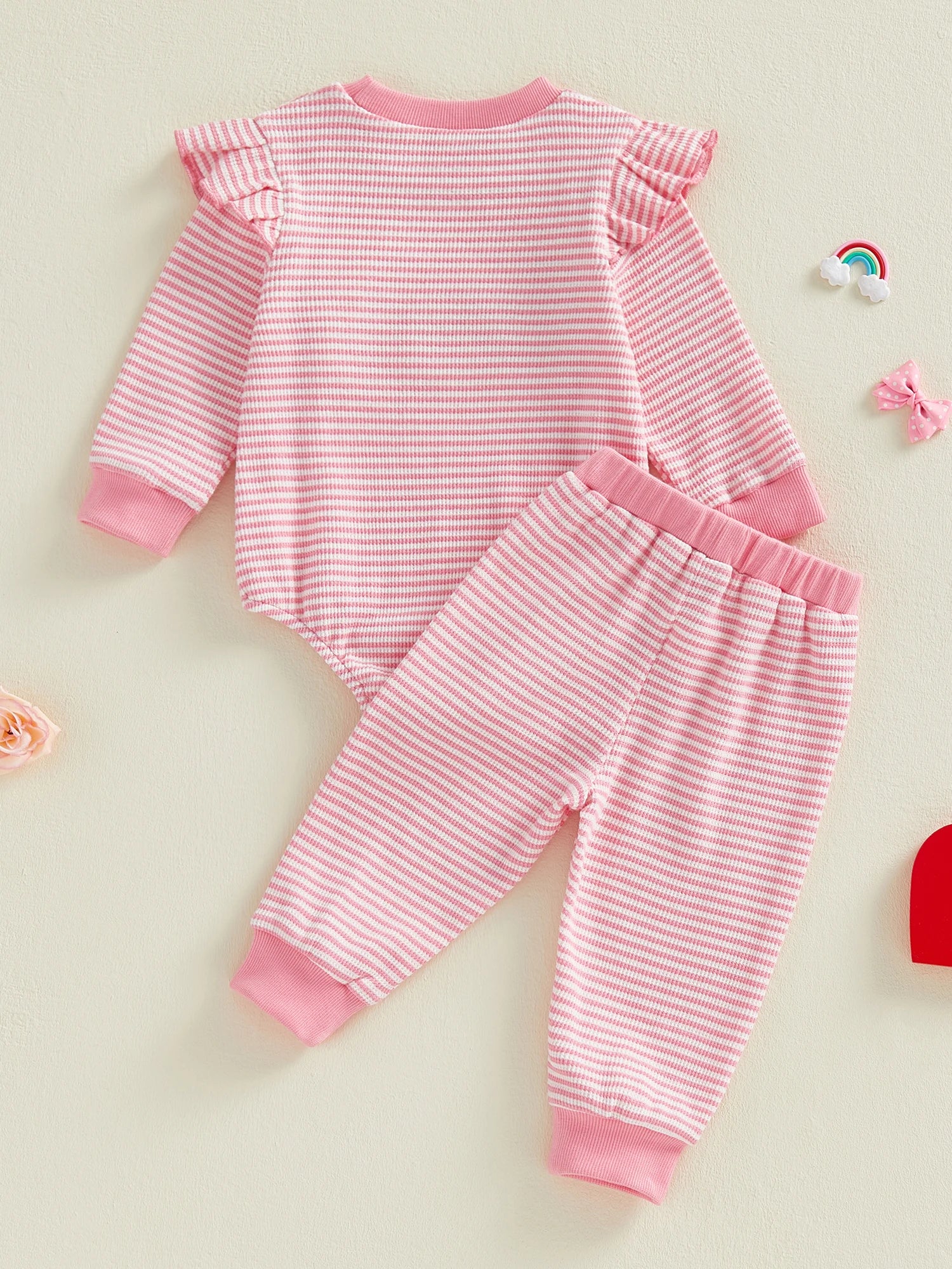 Baby Girls 2Pcs Valentine's Day Clothes Sets Letters Embroidery Love Stripe Long Sleeve Romper with Pants 2Pcs Set