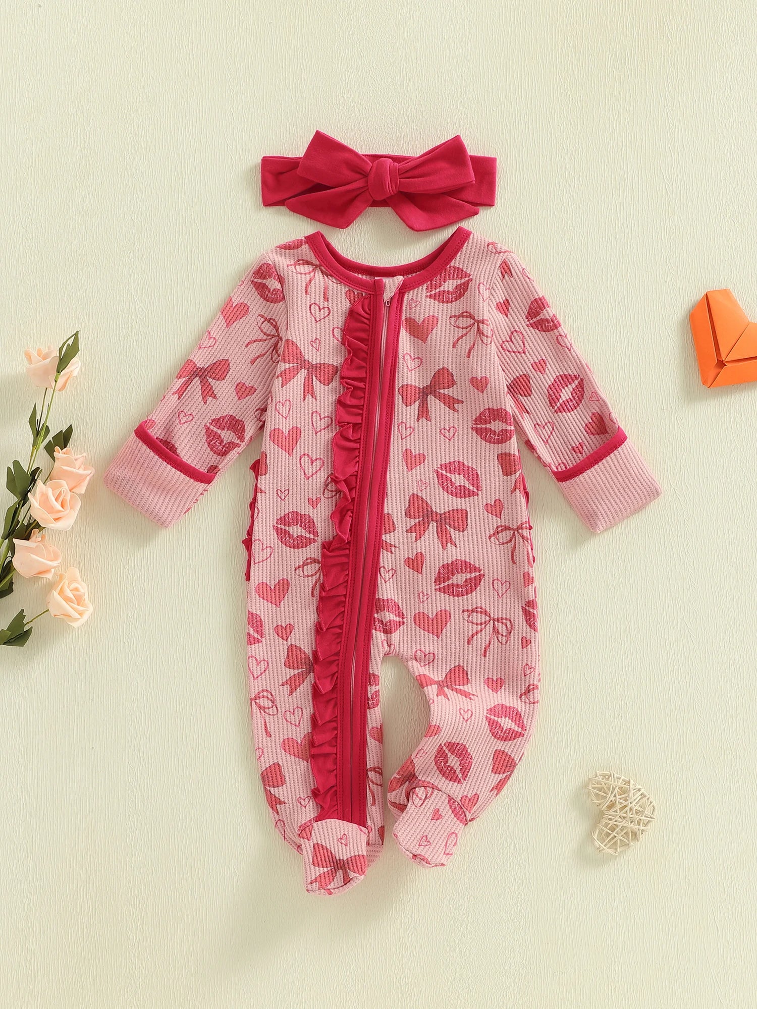 Baby Girls 2Pcs Valentine's Day Outfits Heart Lip Print Long Sleeve Round Neck Ruffled Zipper Romper Footed Jumpsuit with Bow Headband Set