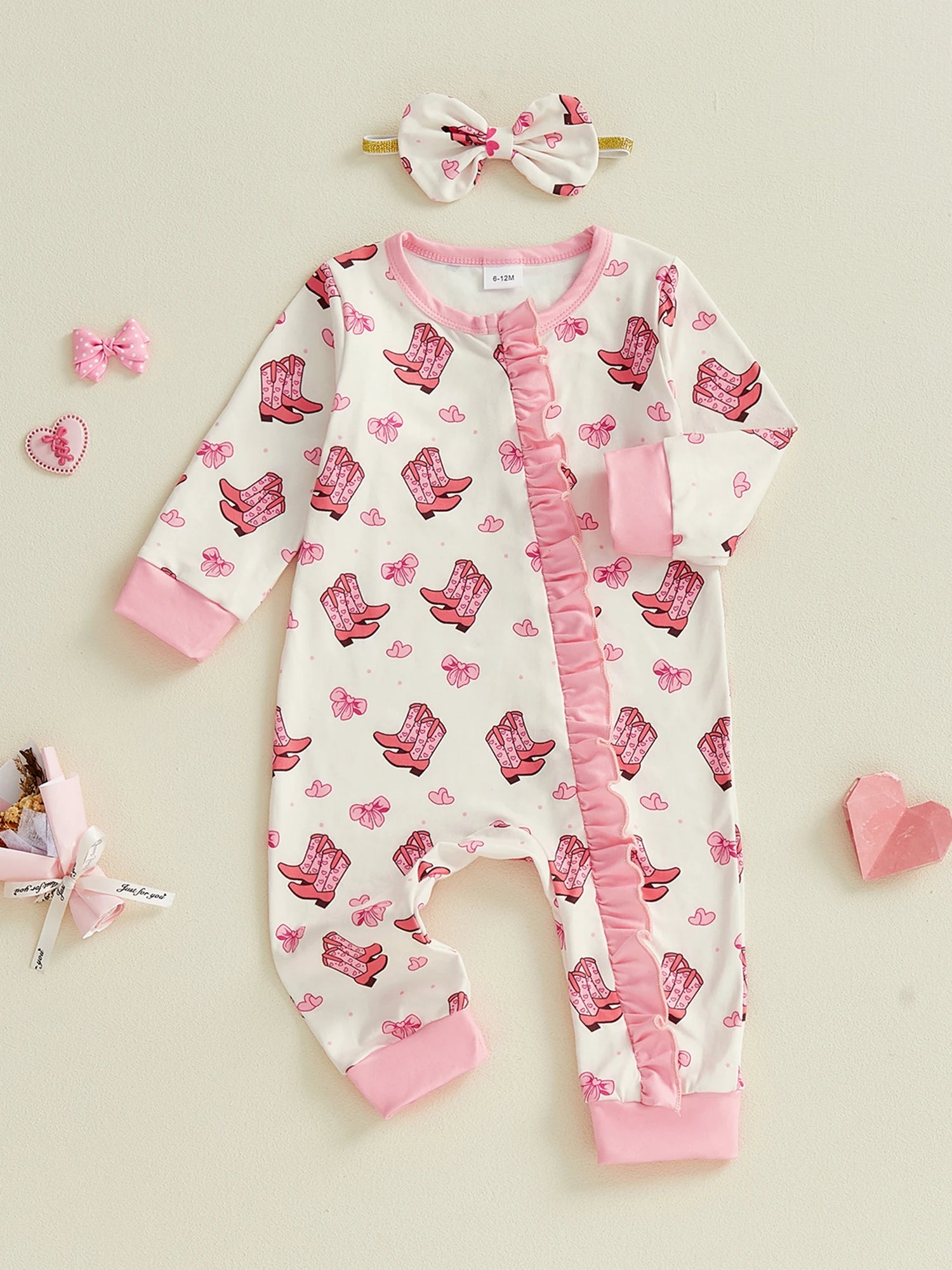 Baby Girls 2Pcs Western Bow Boot Print Long Sleeve Round Neck Zipper Romper Jumpsuit with Bow Headband Set