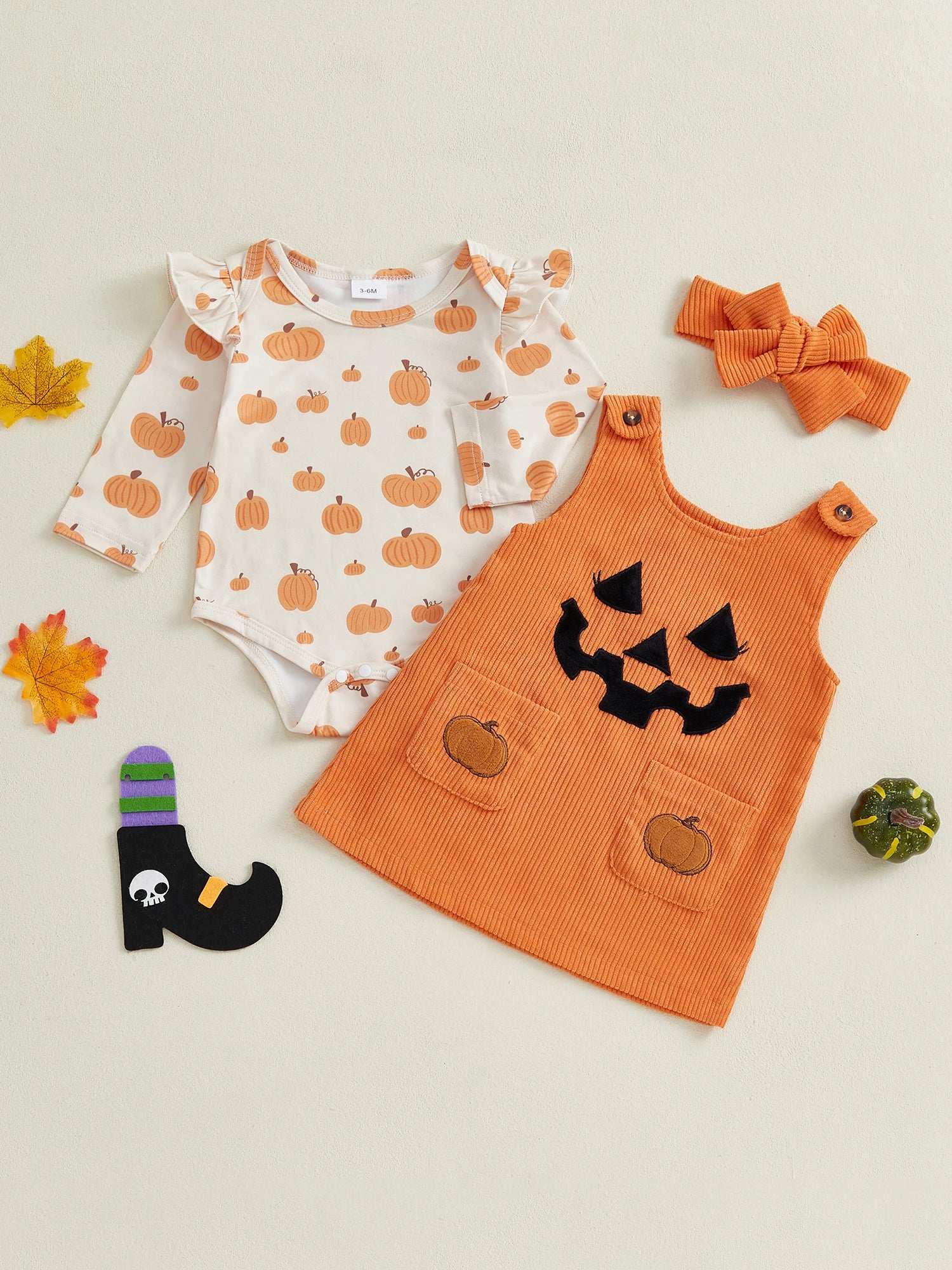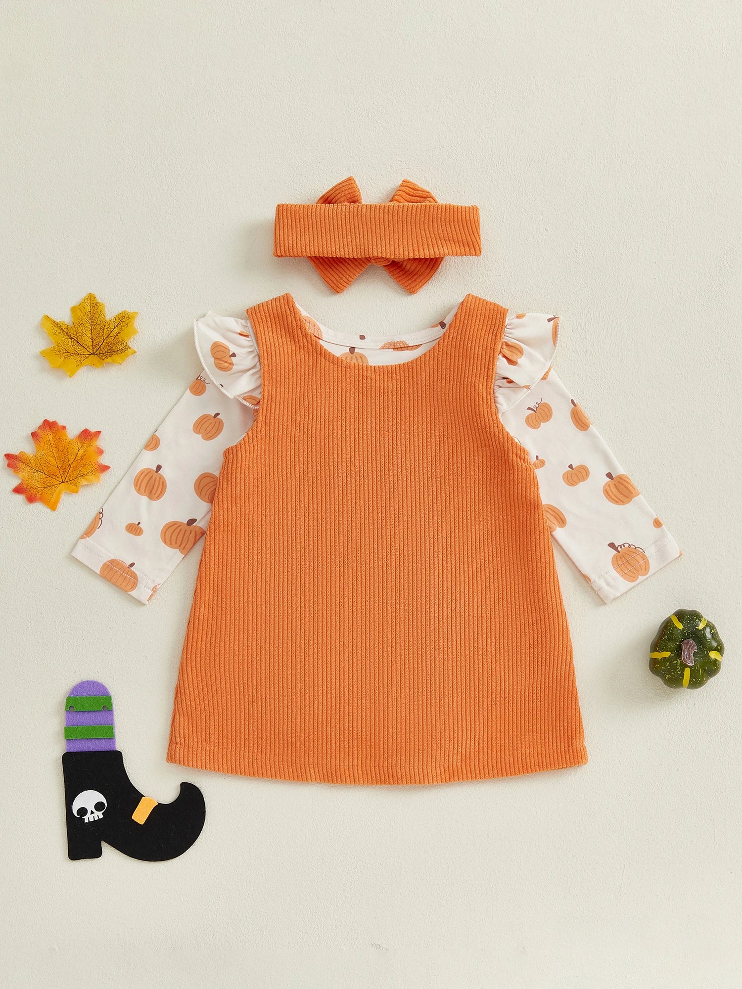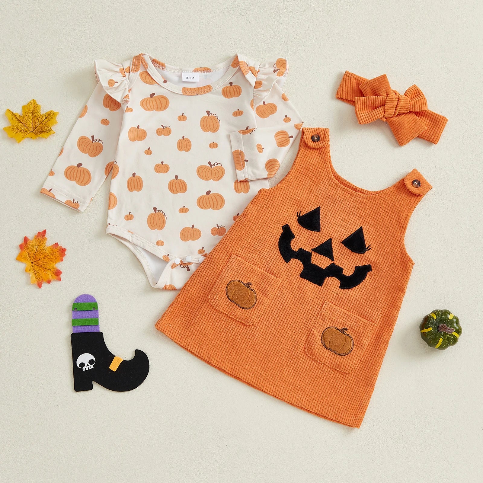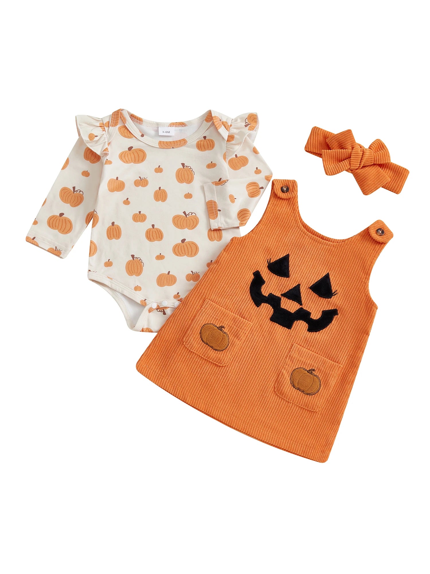 Baby Girls 3Pcs Halloween Outfit Pumpkin Ruffle Long Sleeve Romper Overall Dress Headband Set
