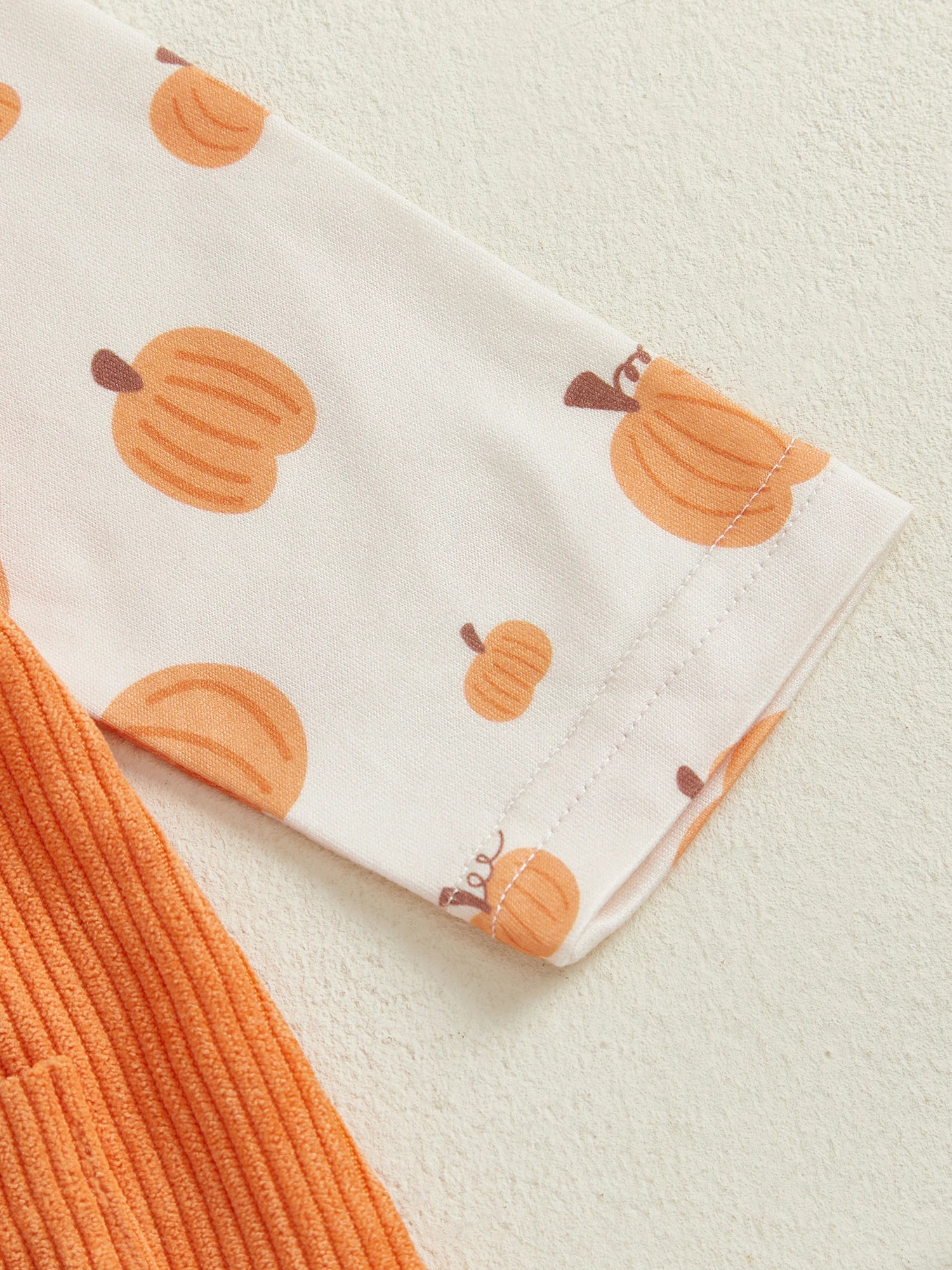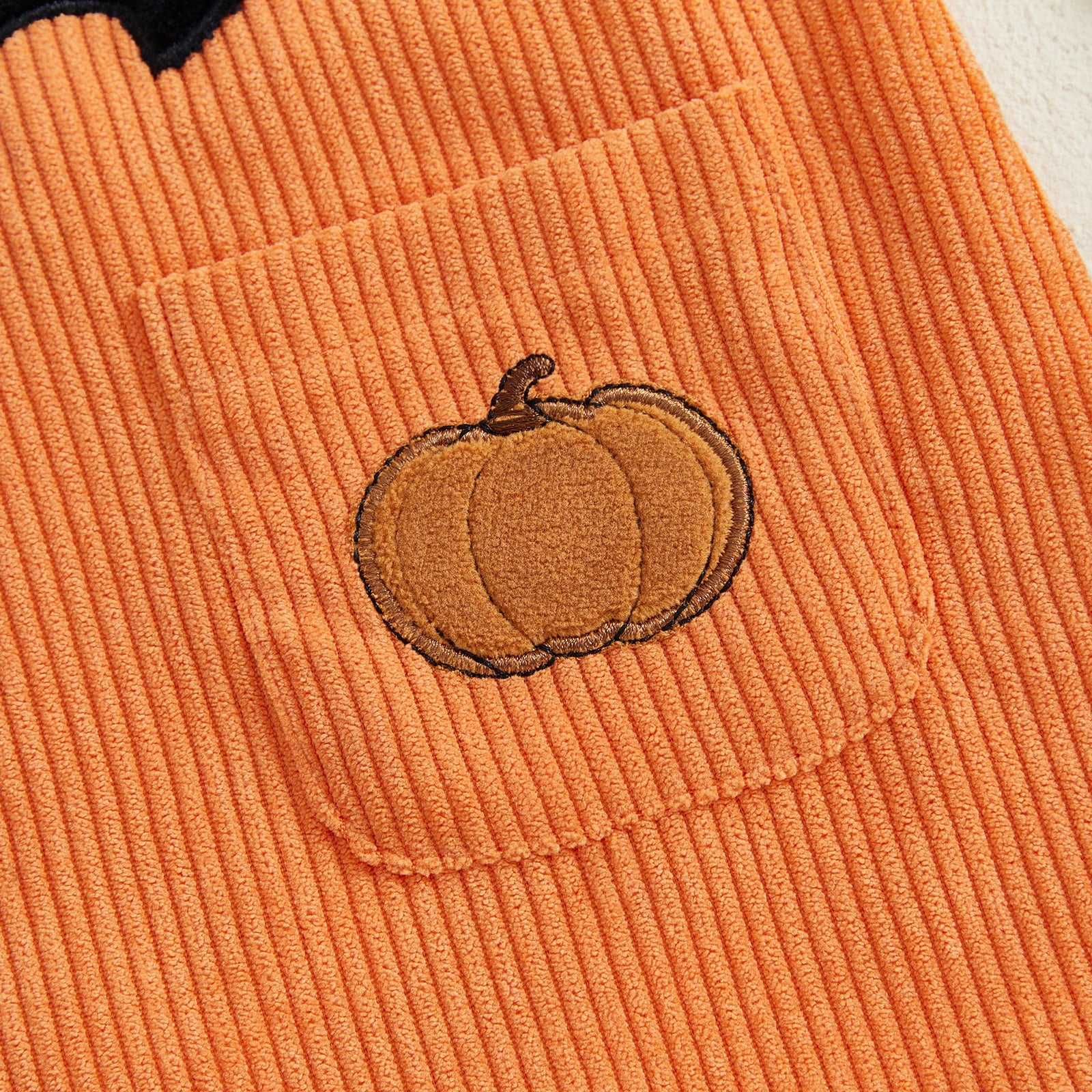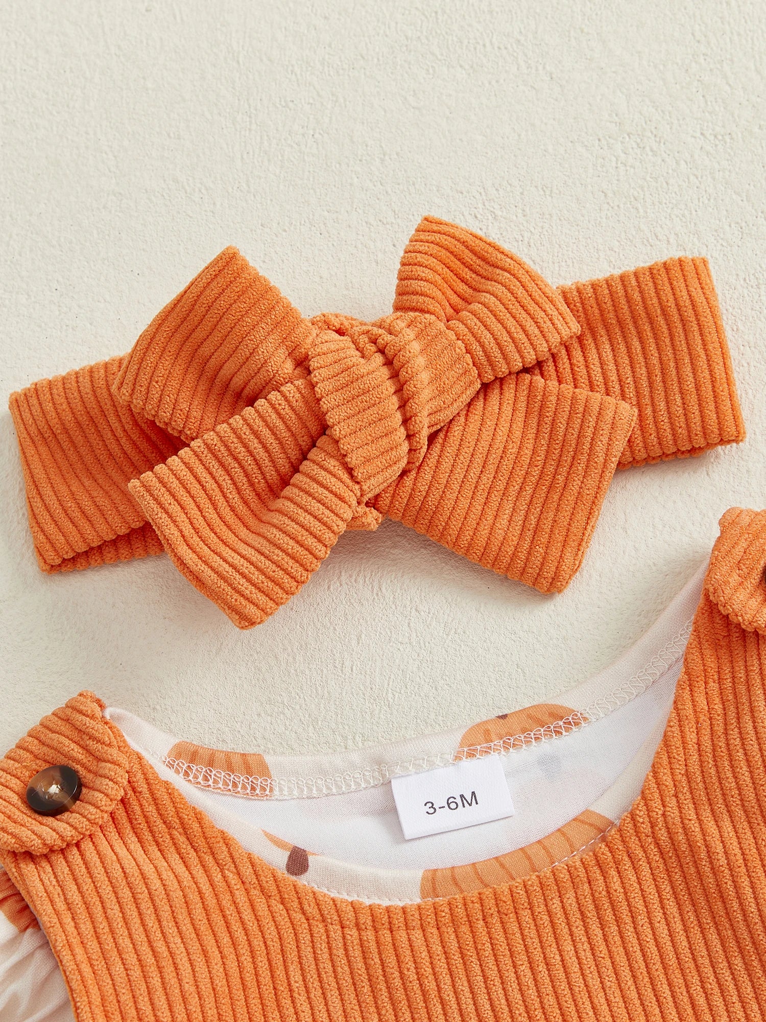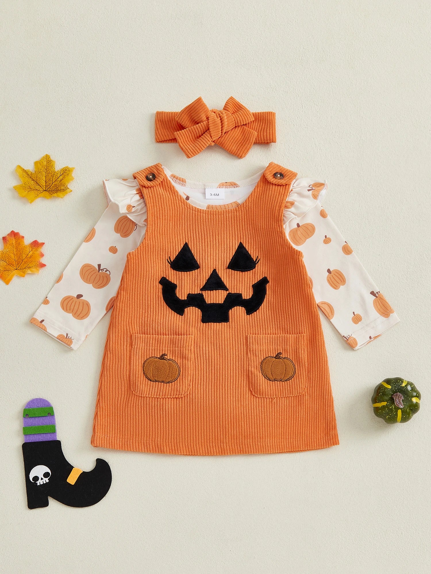 Baby Girls 3Pcs Halloween Outfit Pumpkin Ruffle Long Sleeve Romper Overall Dress Headband Set