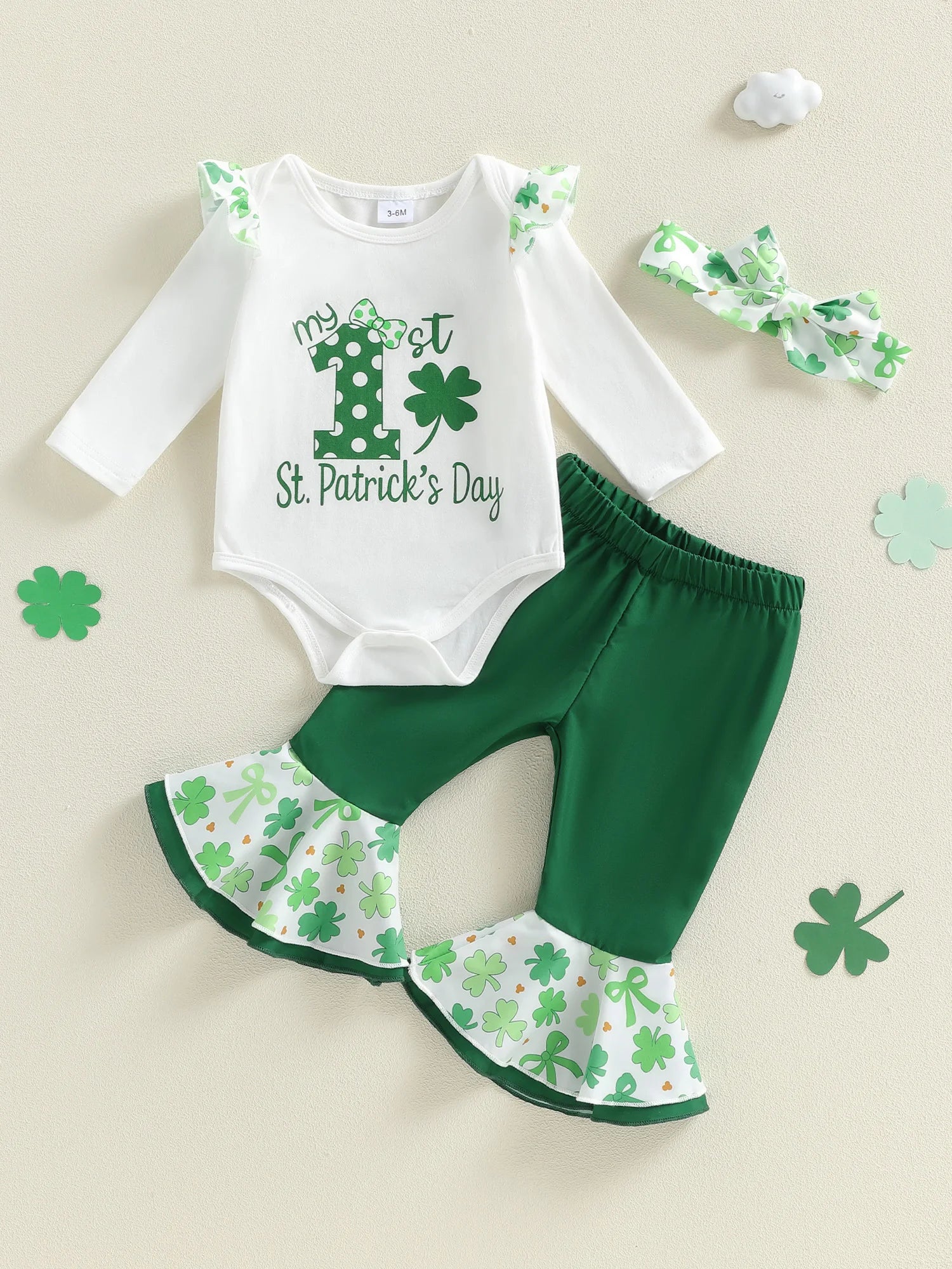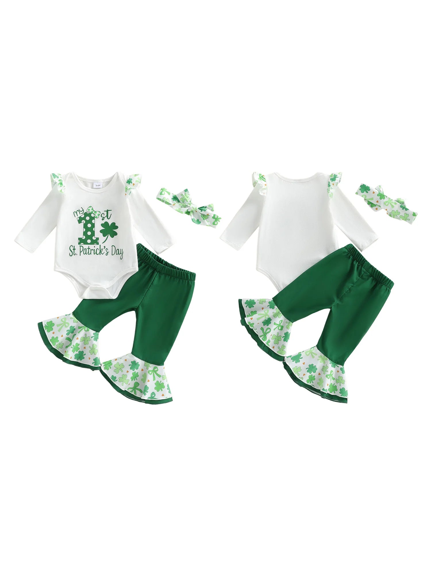 Baby Girls 3Pcs My 1st St. Patrick's Day Outfit Long Sleeve Letters Print Romper with Shamrock Print Pants and Headband Set