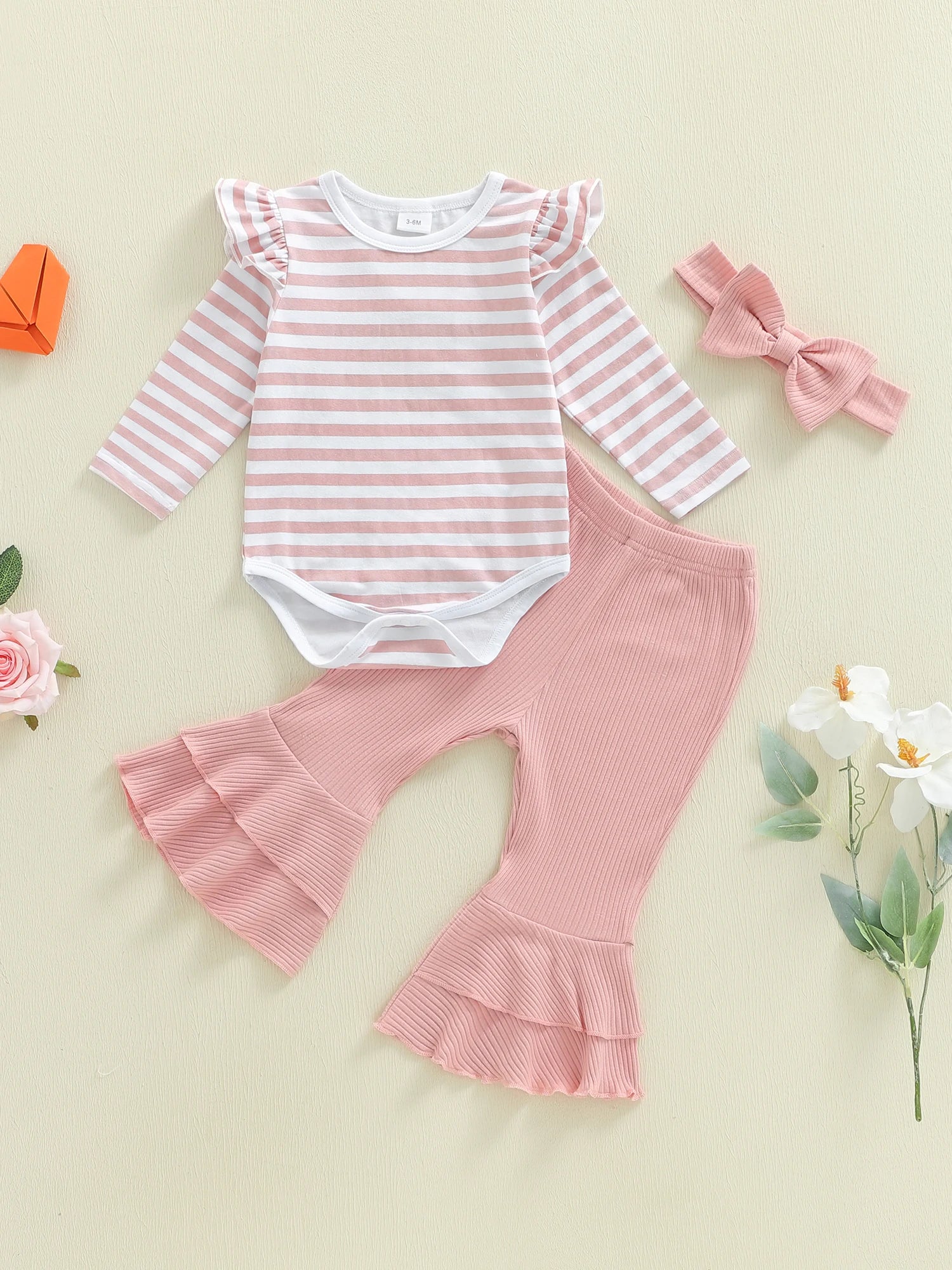 Baby Girls 3Pcs Spring Outfit Long Sleeve Striped Romper with Flare Pants and Headband Clothing Set