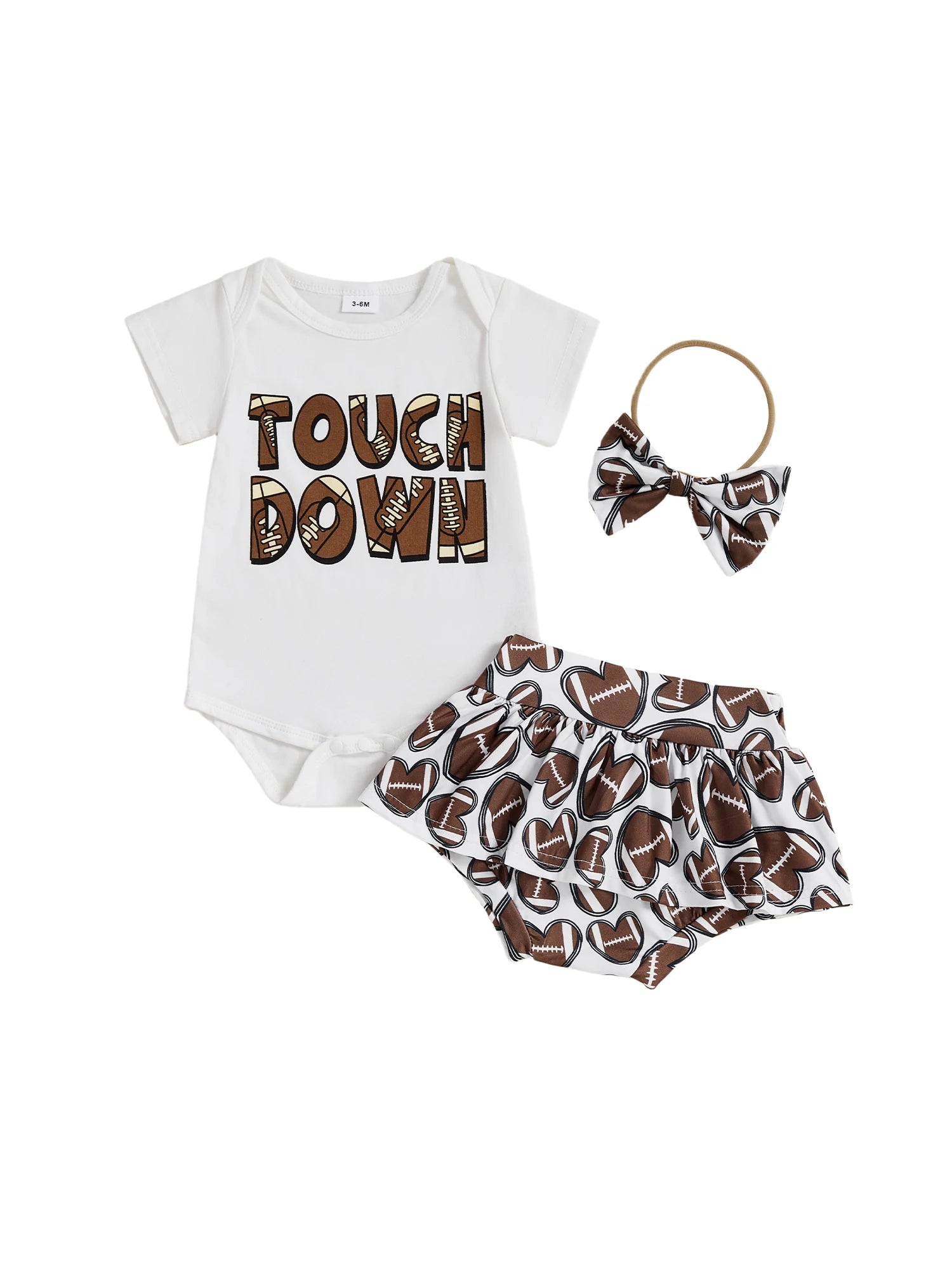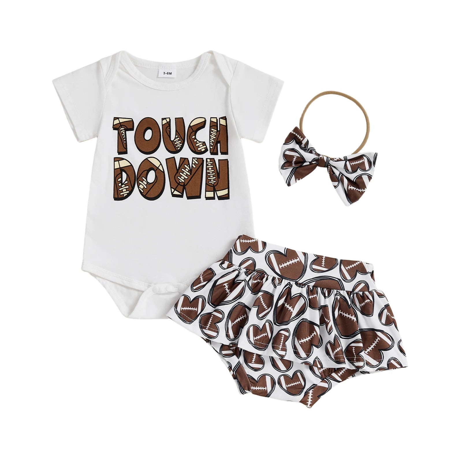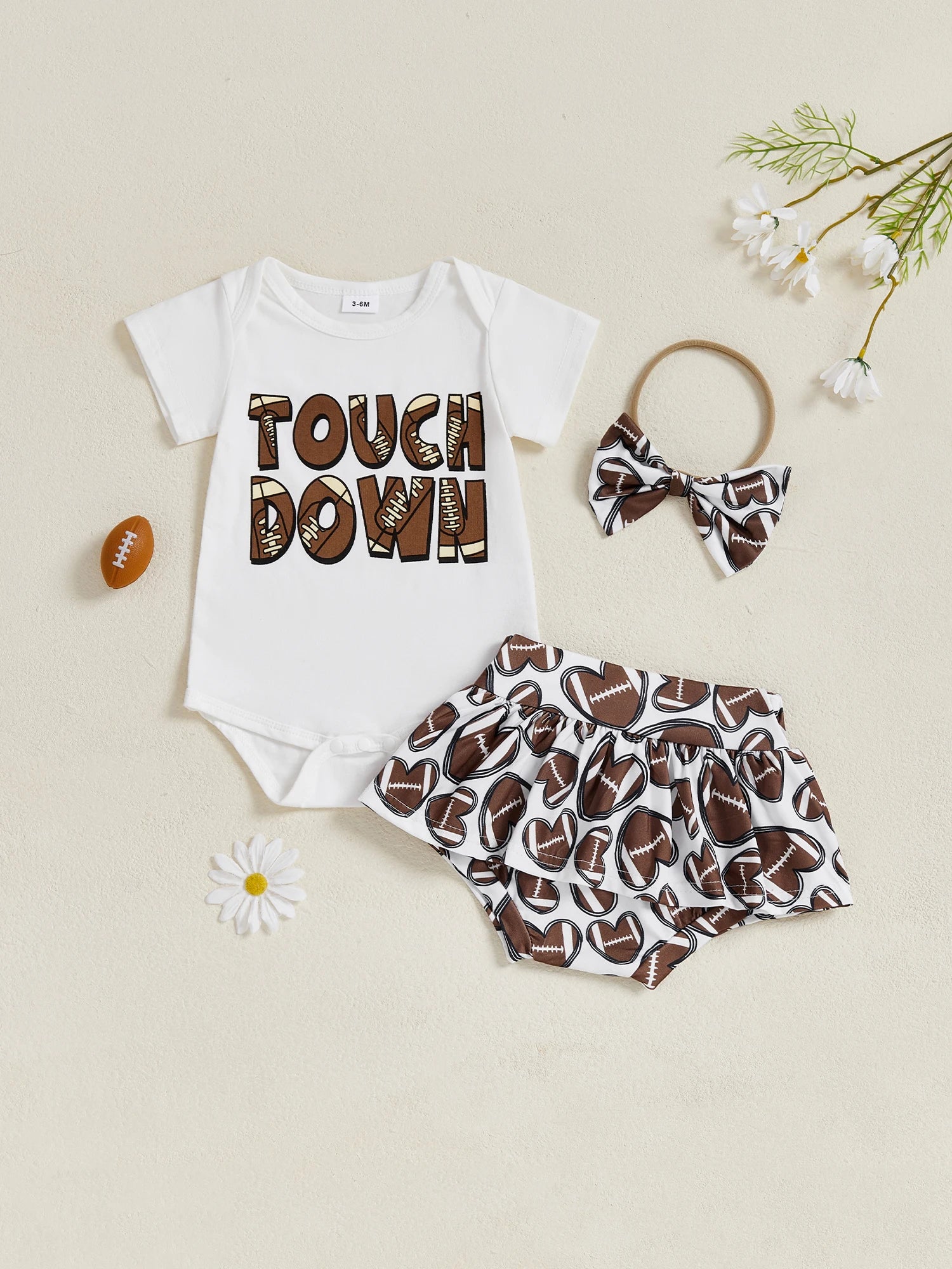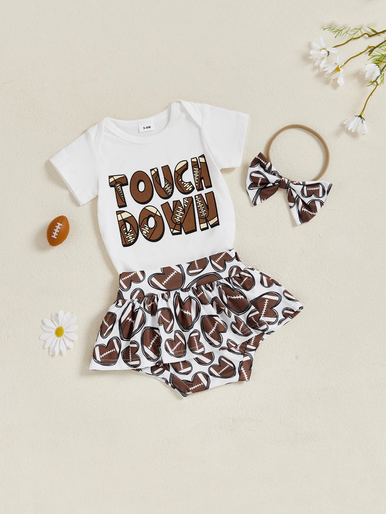Baby Girls 3Pcs Touch Down Outfit Football Letter Print Romper Skirted Shorts Skort and Headband Bow Set
