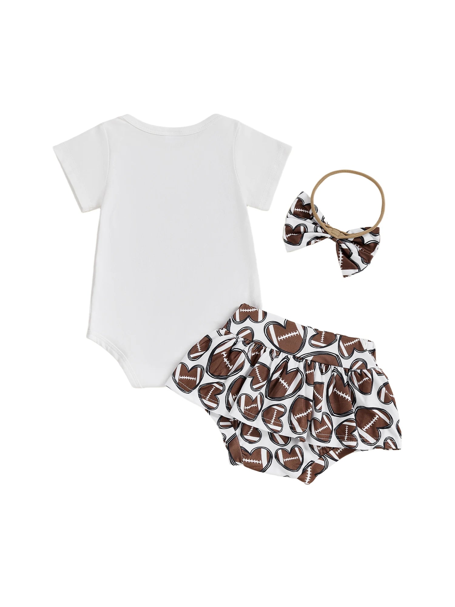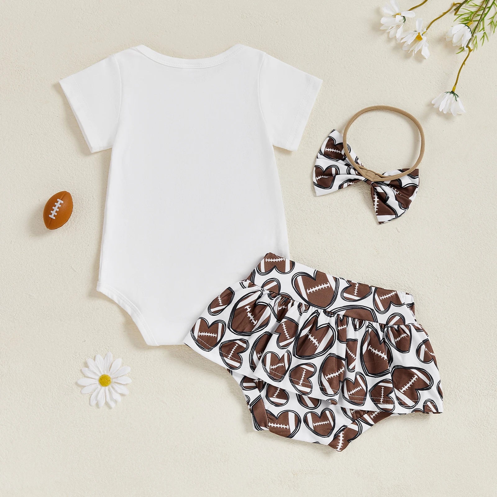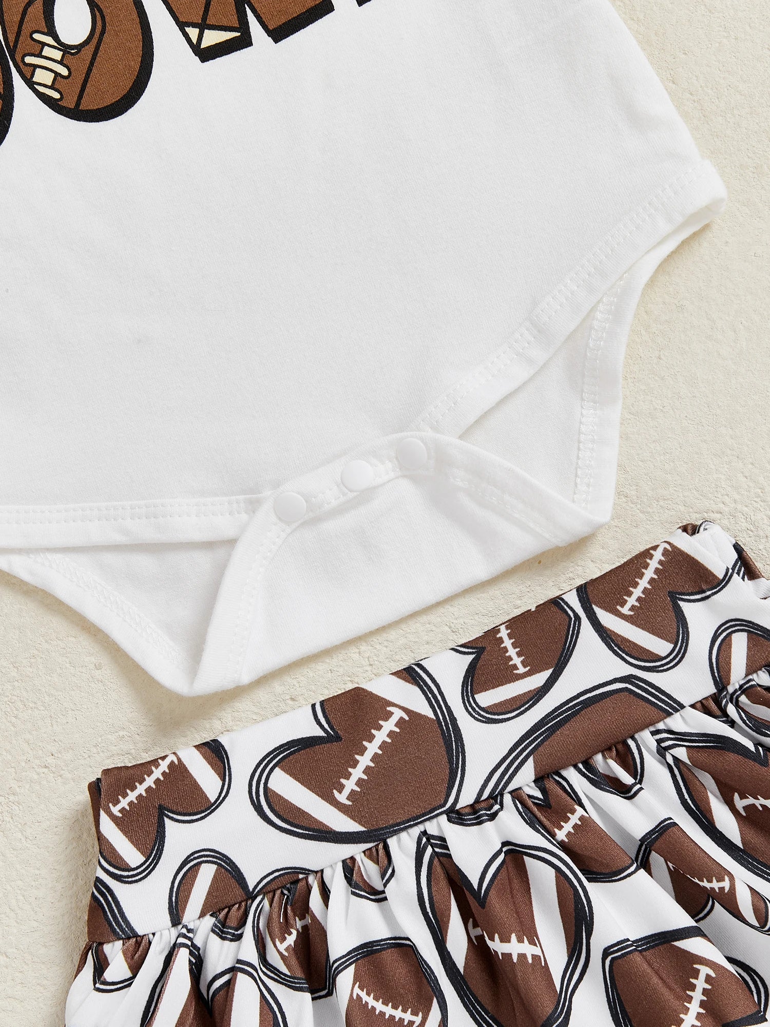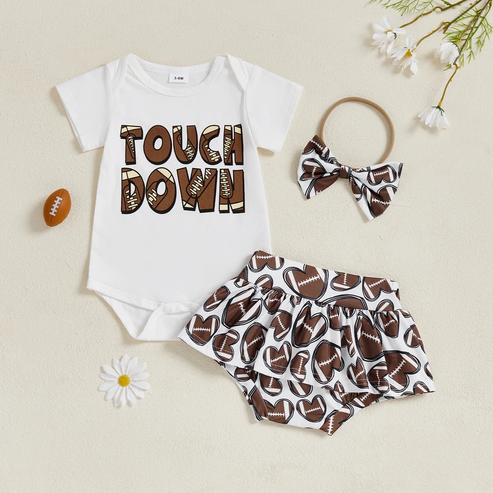 Baby Girls 3Pcs Touch Down Outfit Football Letter Print Romper Skirted Shorts Skort and Headband Bow Set