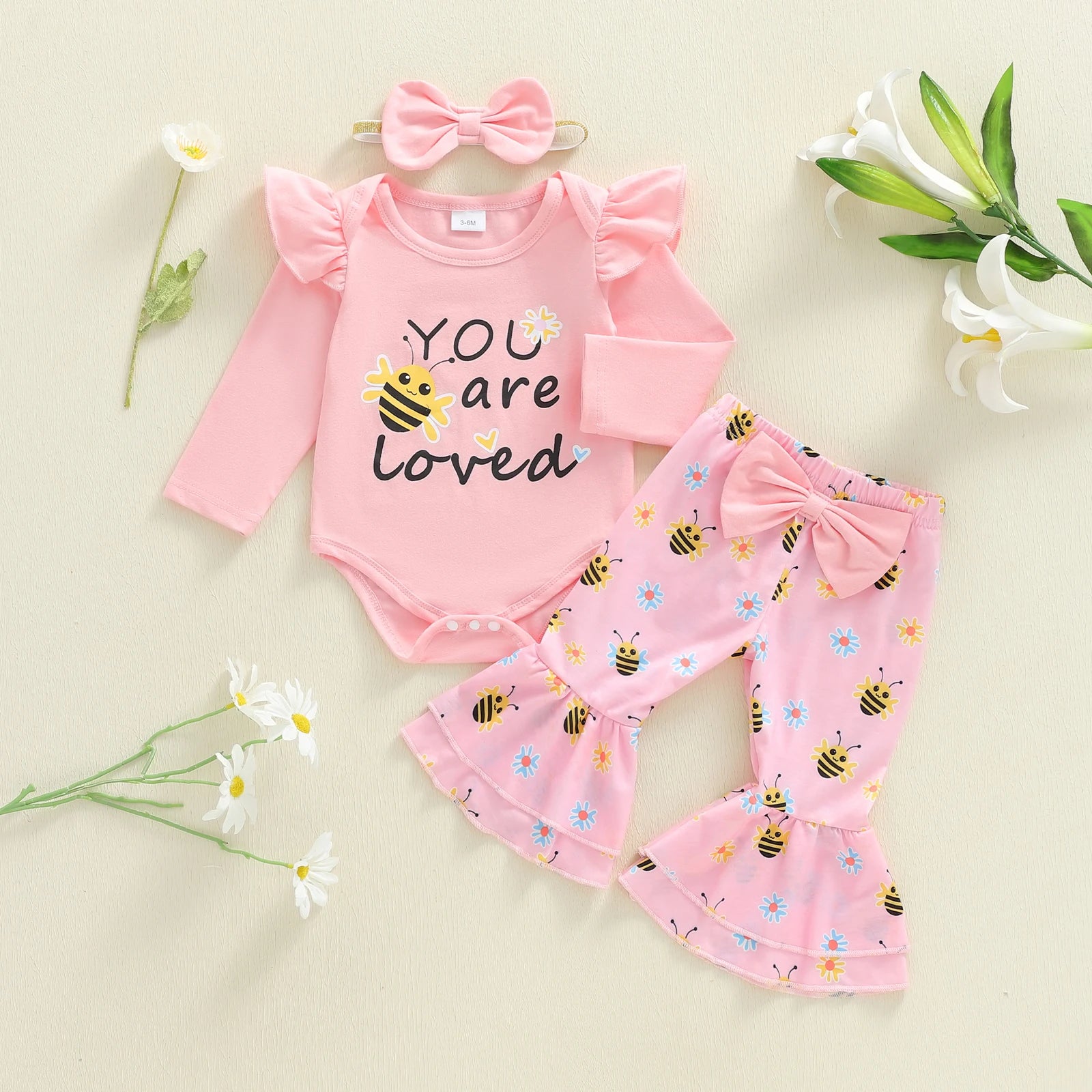 Baby Girls 3Pcs You Are Loved Long Sleeve O Neck Letter Bee Print Romper Flared Pants Headband Set