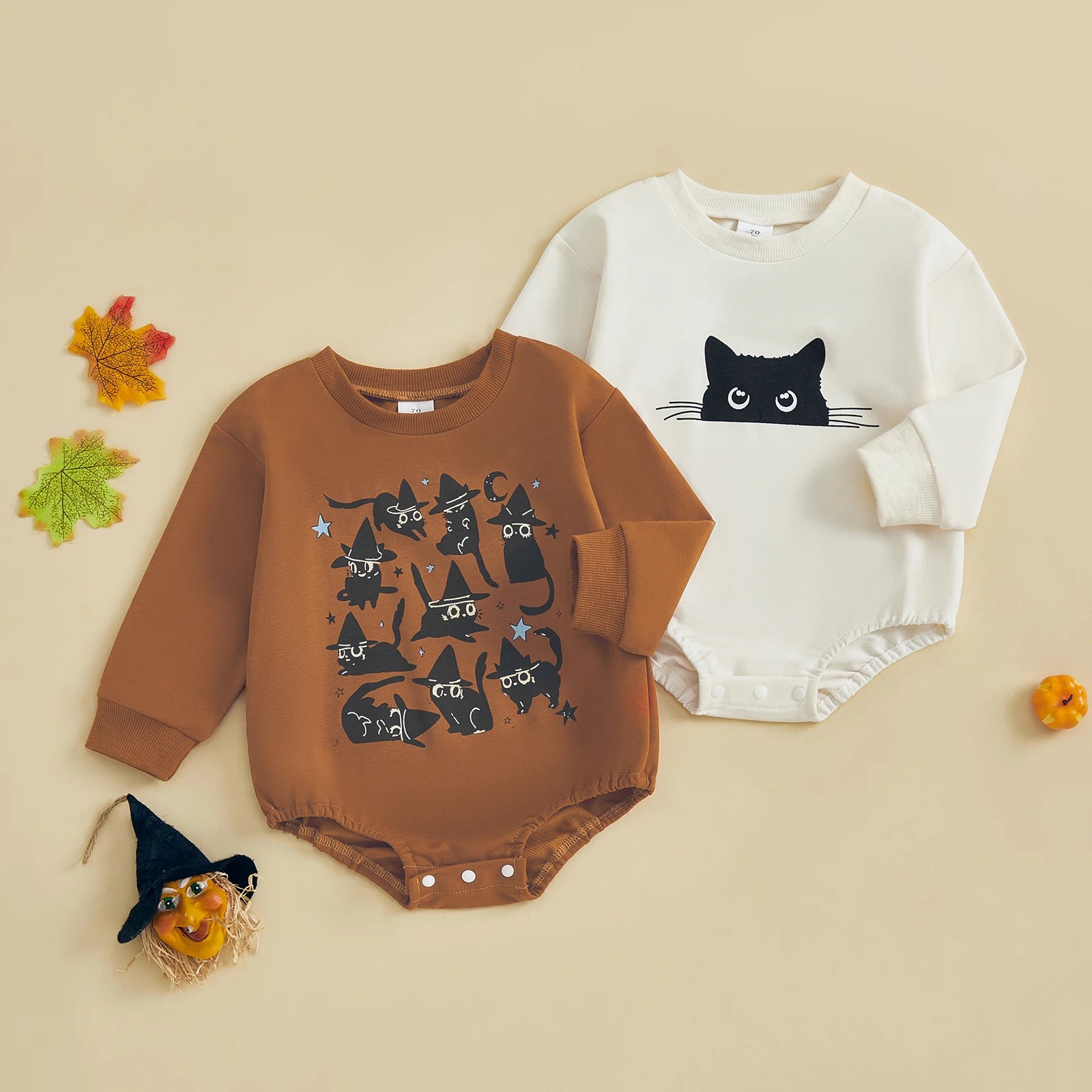 Baby Girls Boys Bubble Romper Long Sleeve Crew Neck Cat Print Fall Halloween Casual Bodysuit Clothes