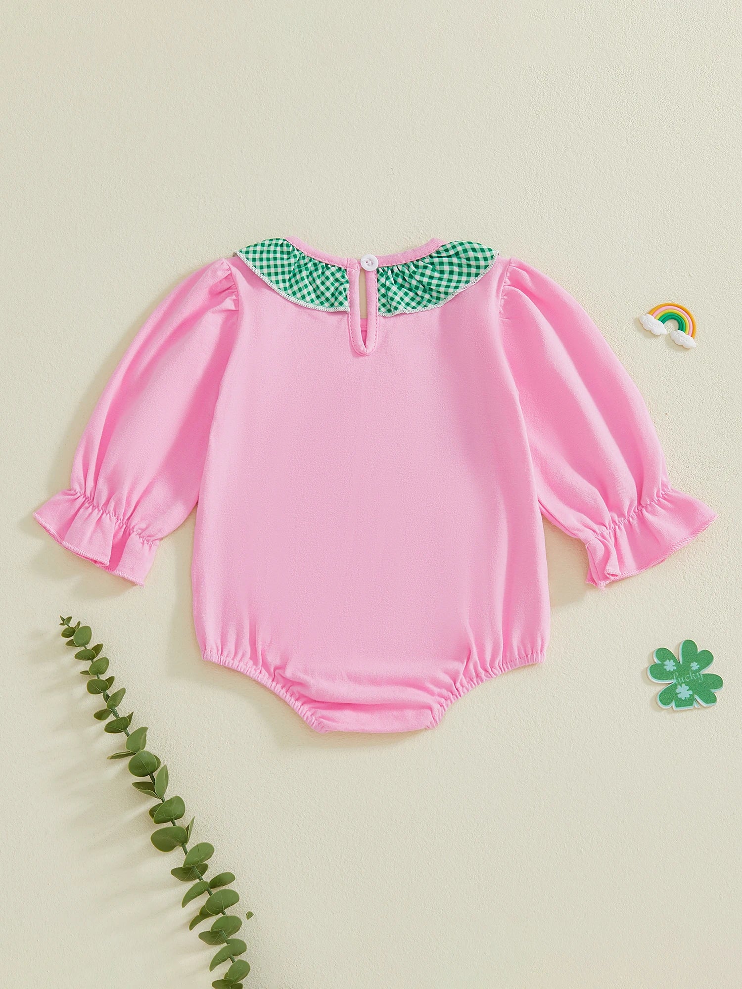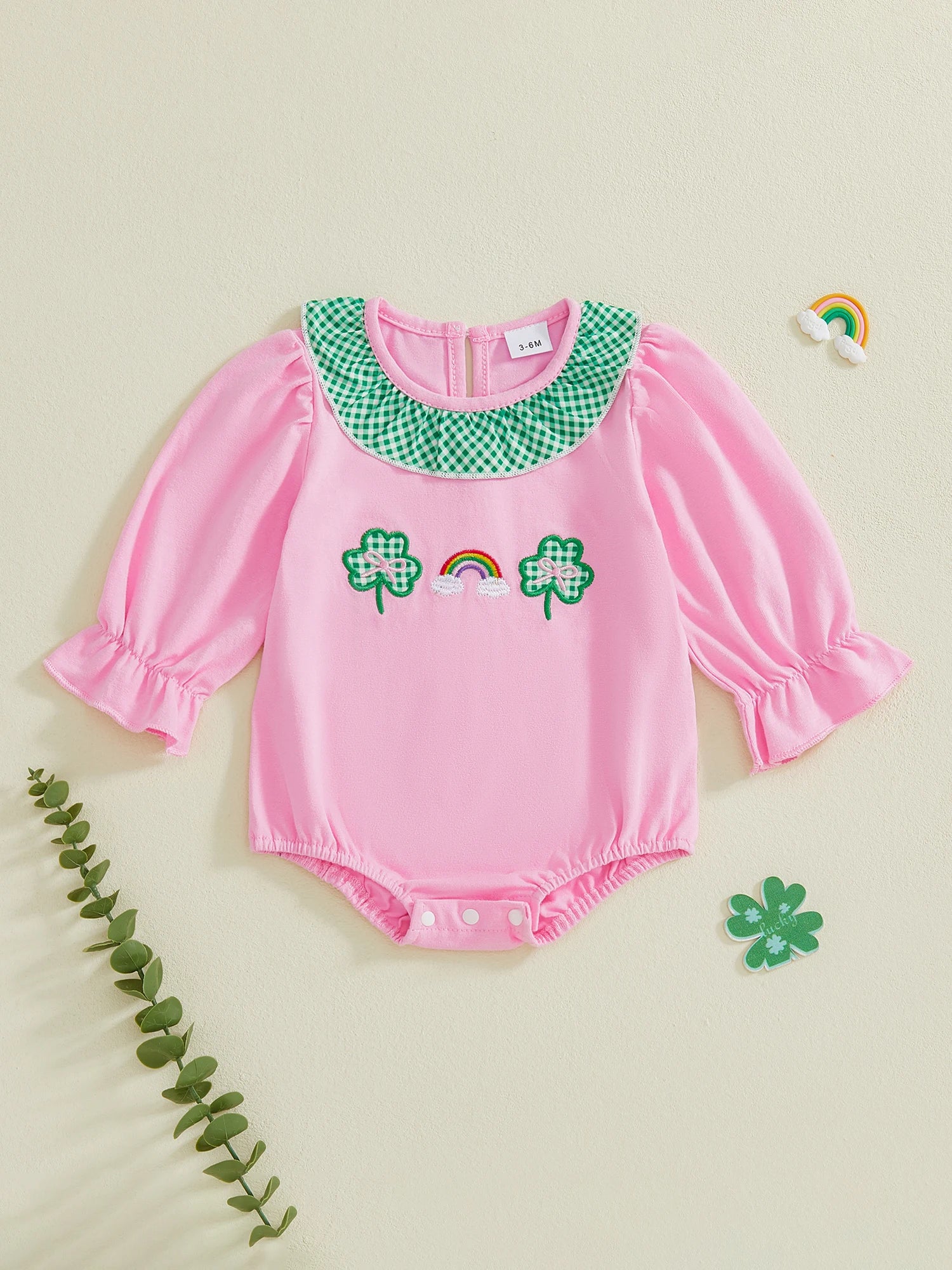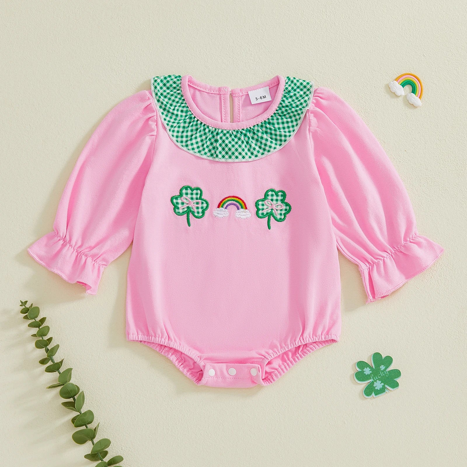 Baby Girls Romper Long Sleeve Round Neck Shamrock Embroidery Jumpsuit for St. Patrick's Day