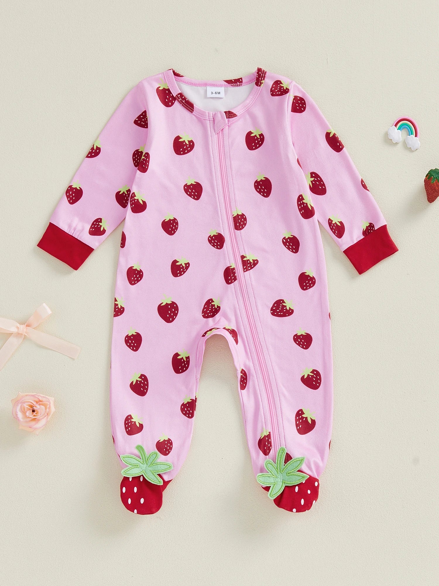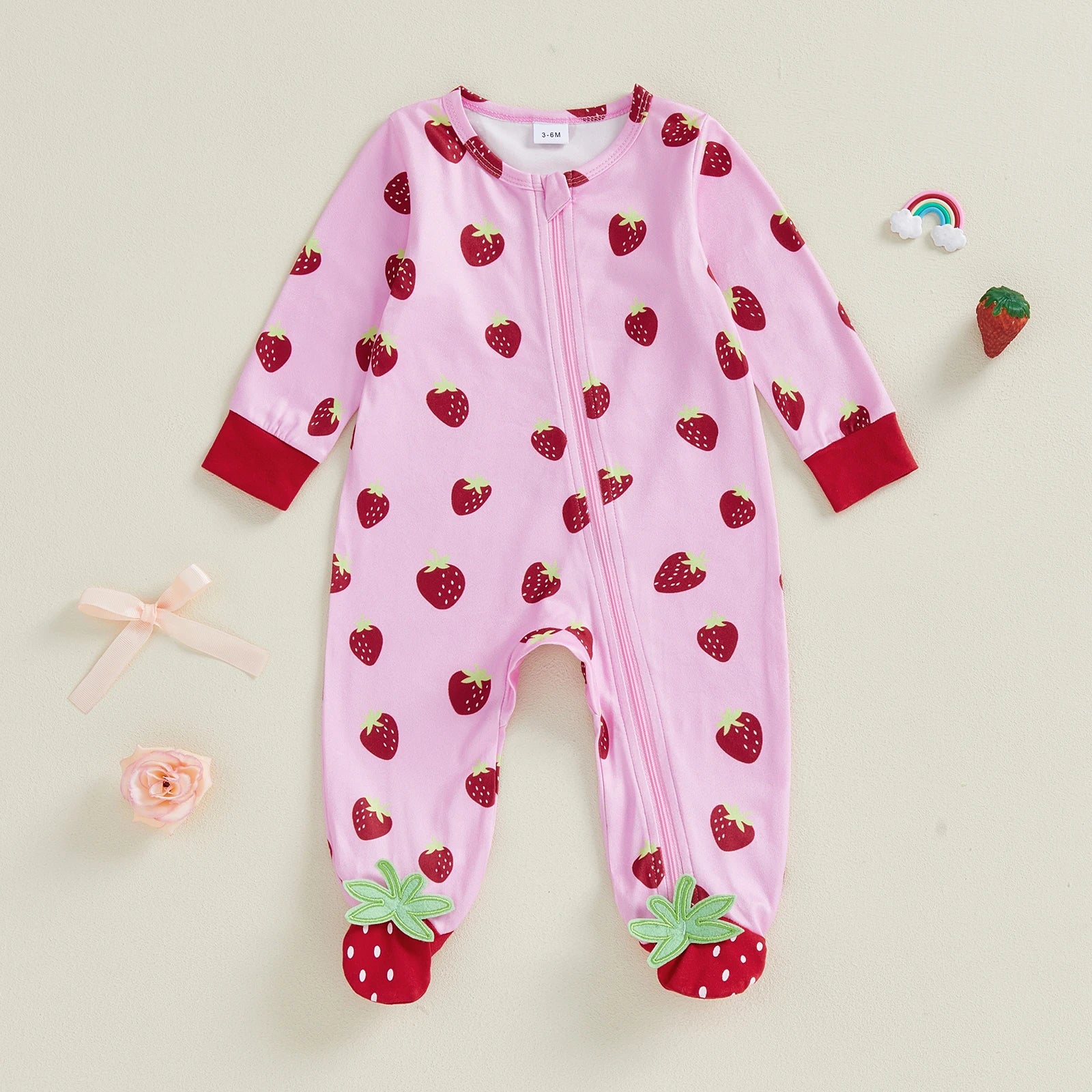 Baby Girls Zipper Romper Long Sleeve Crew Neck Strawberry Print Footed Spring Jumpsuit
