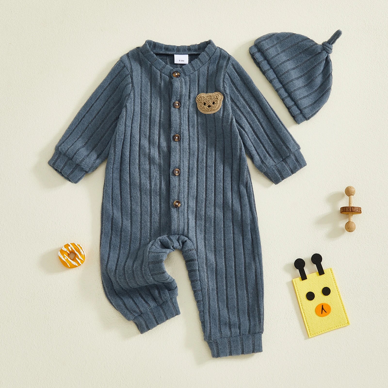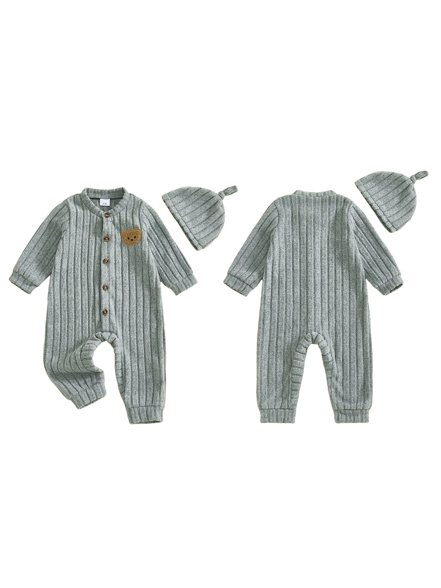 Baby Toddler Boy 2Pcs Jumpsuit and Hat Set Long Sleeve Bear Embroidery Button Down Romper with Hat Newborn Outfit