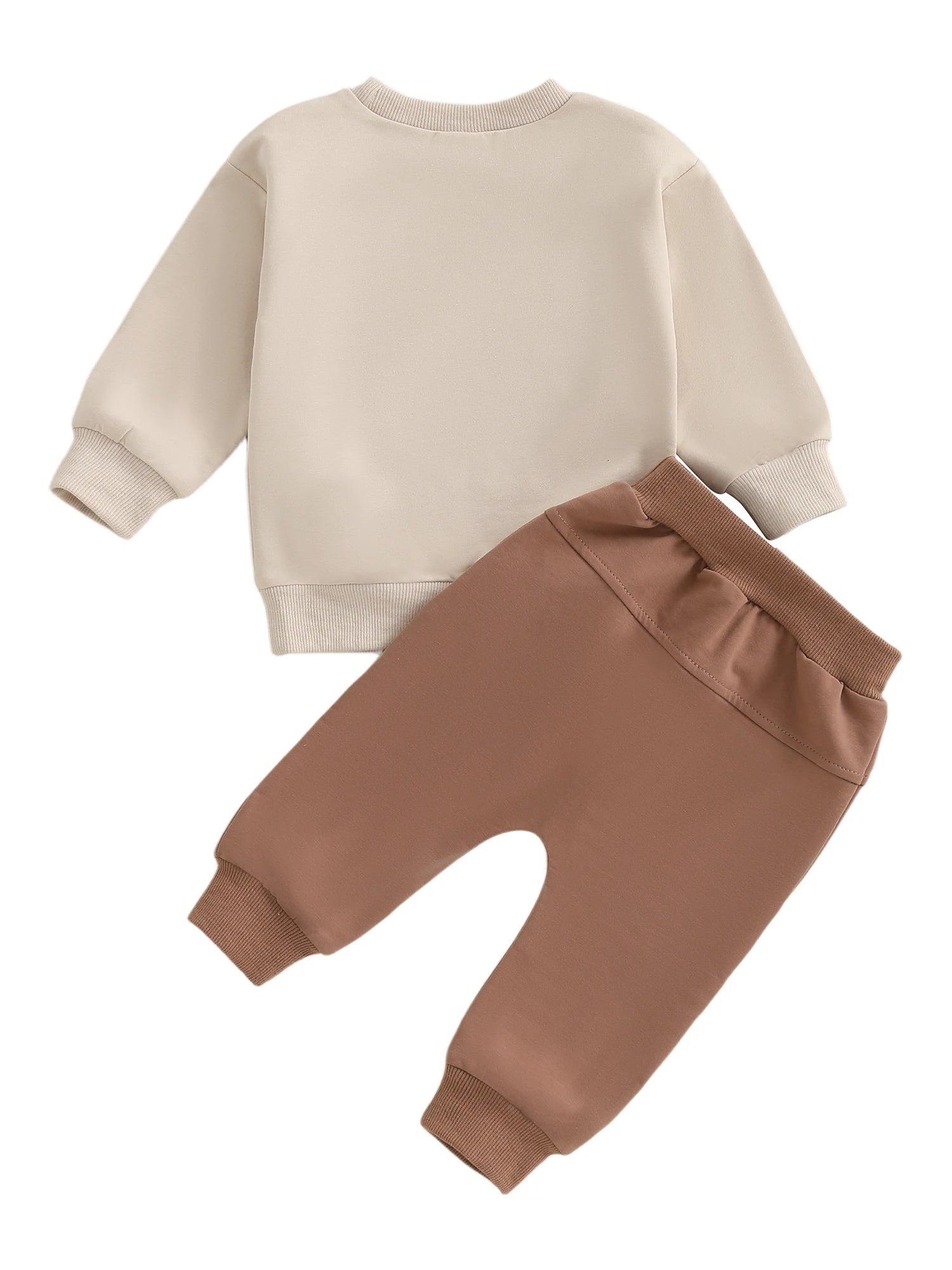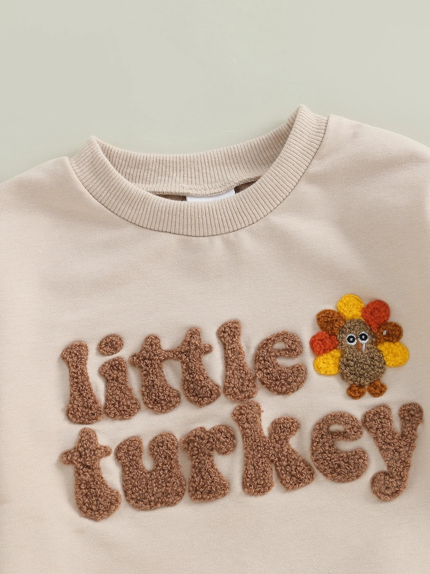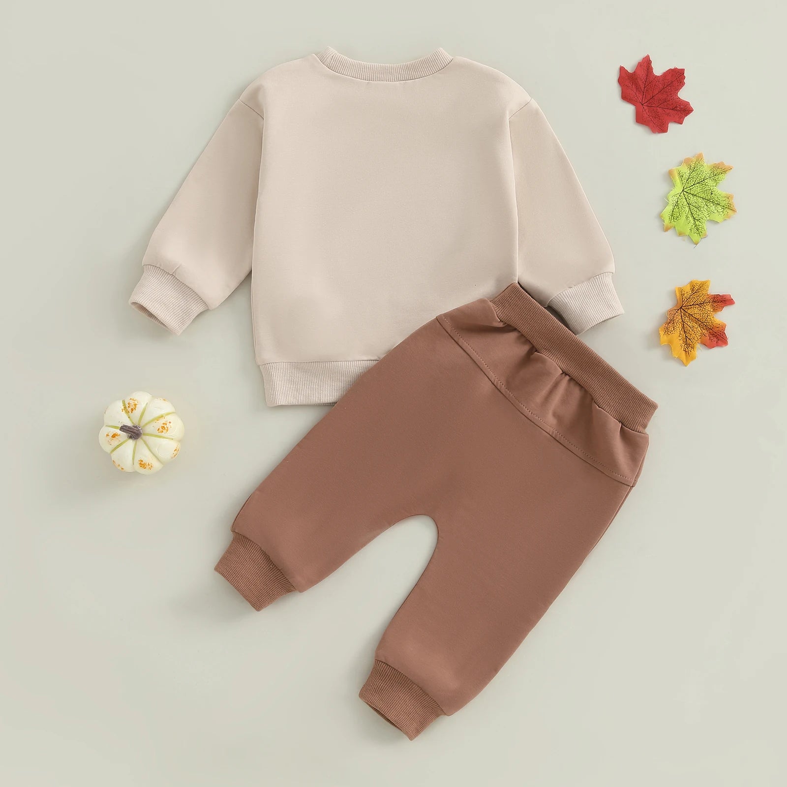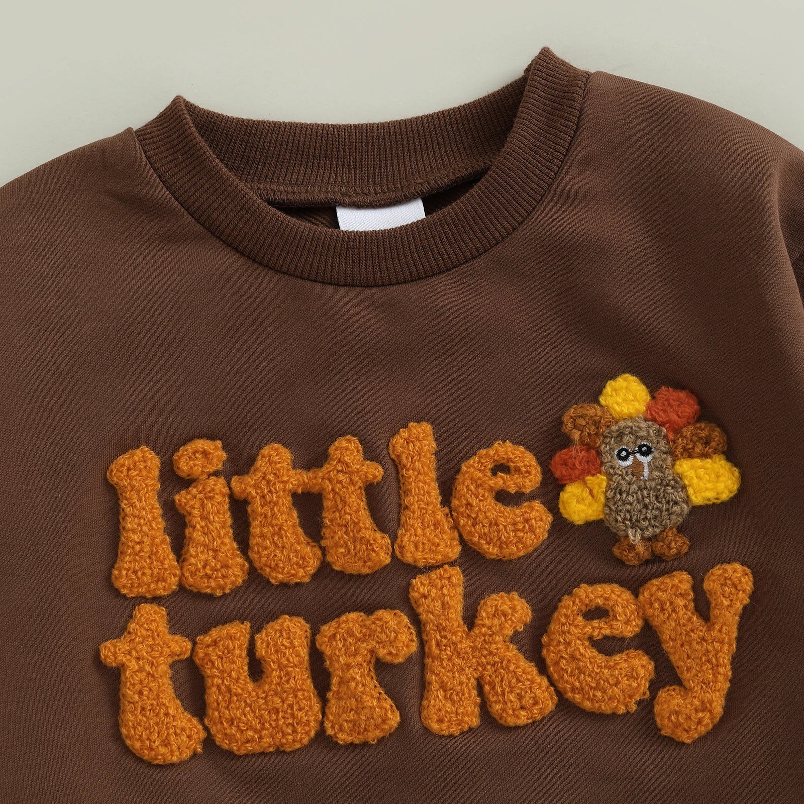 Baby Toddler Boy 2Pcs Little Turkey Thanksgiving Outfit Letter Turkey Embroidery Long Sleeve O-Neck Pullover + Elastic Waist Solid Pants Jogger Set