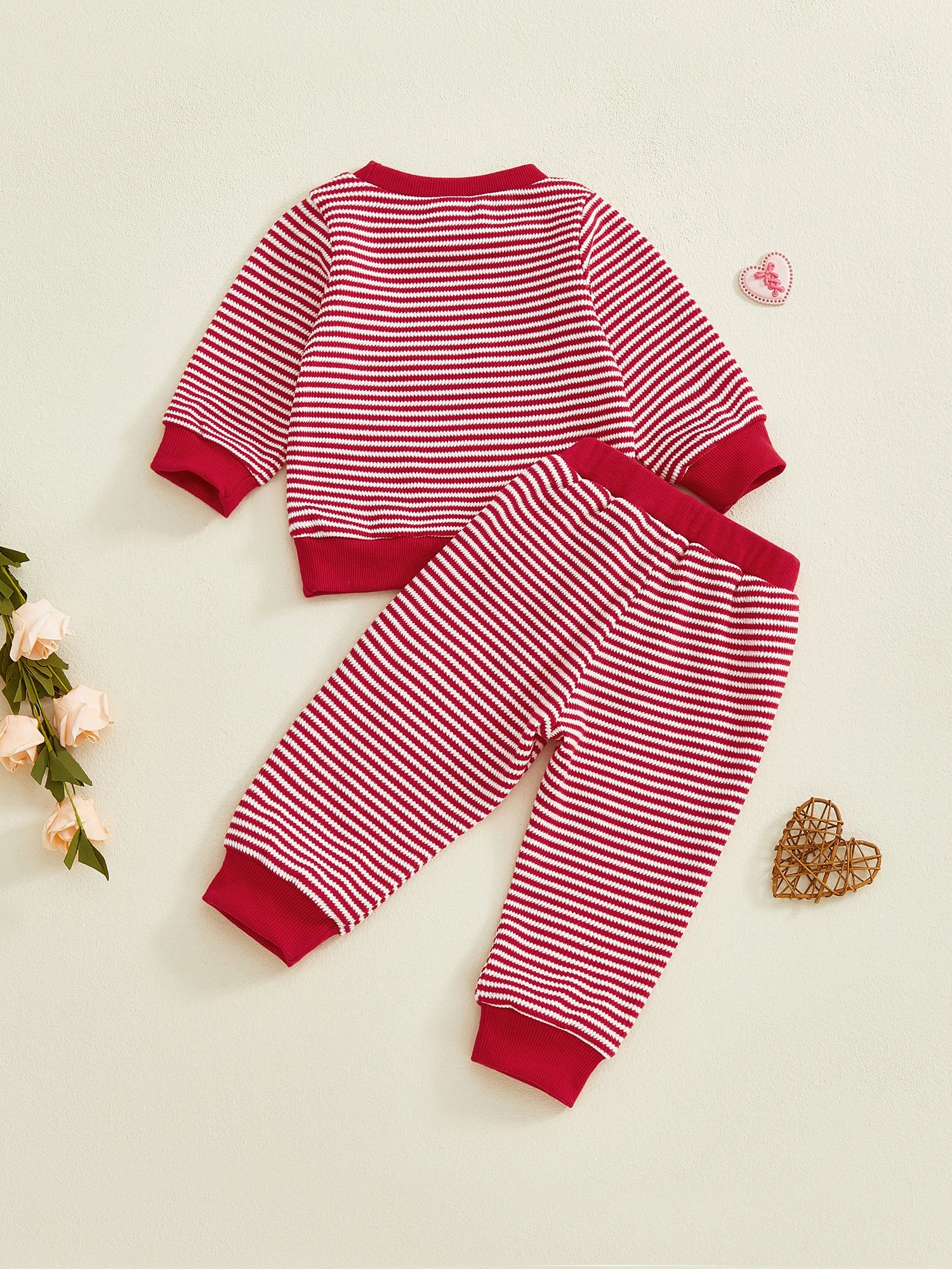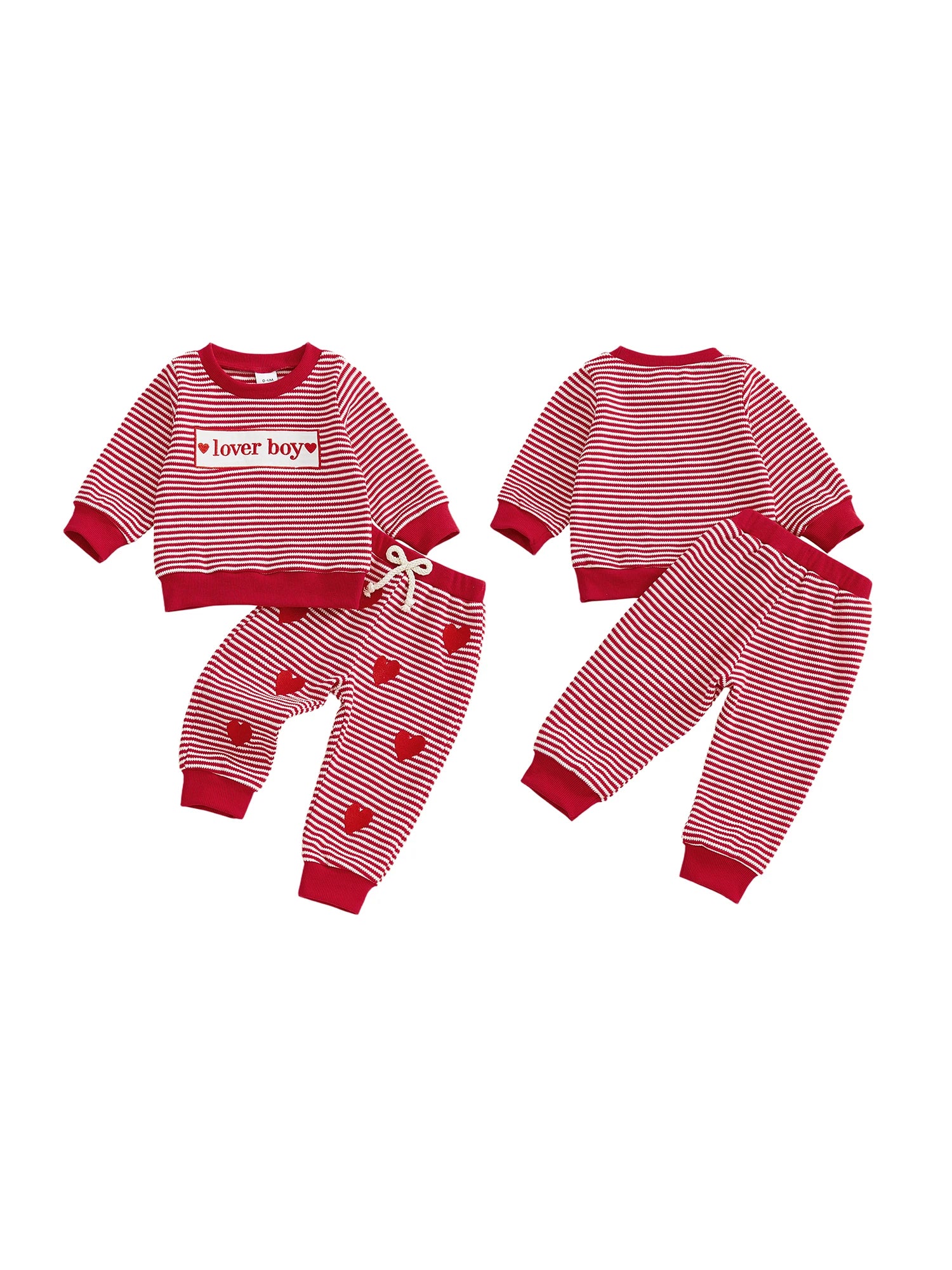 Baby Toddler Boy 2Pcs Lover Boy Valentines Day Outfit Stripe Letter Embroidery Crew Neck Long Sleeve Top and Heart Pants 2 Pcs Jogger Set