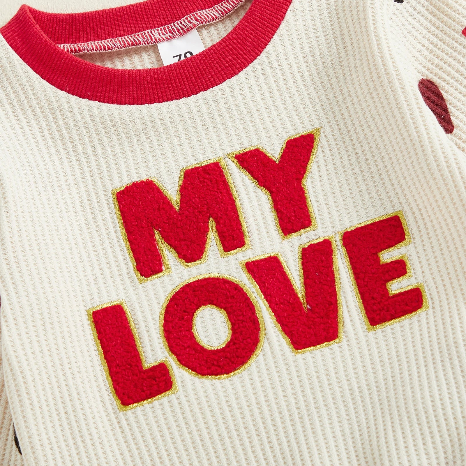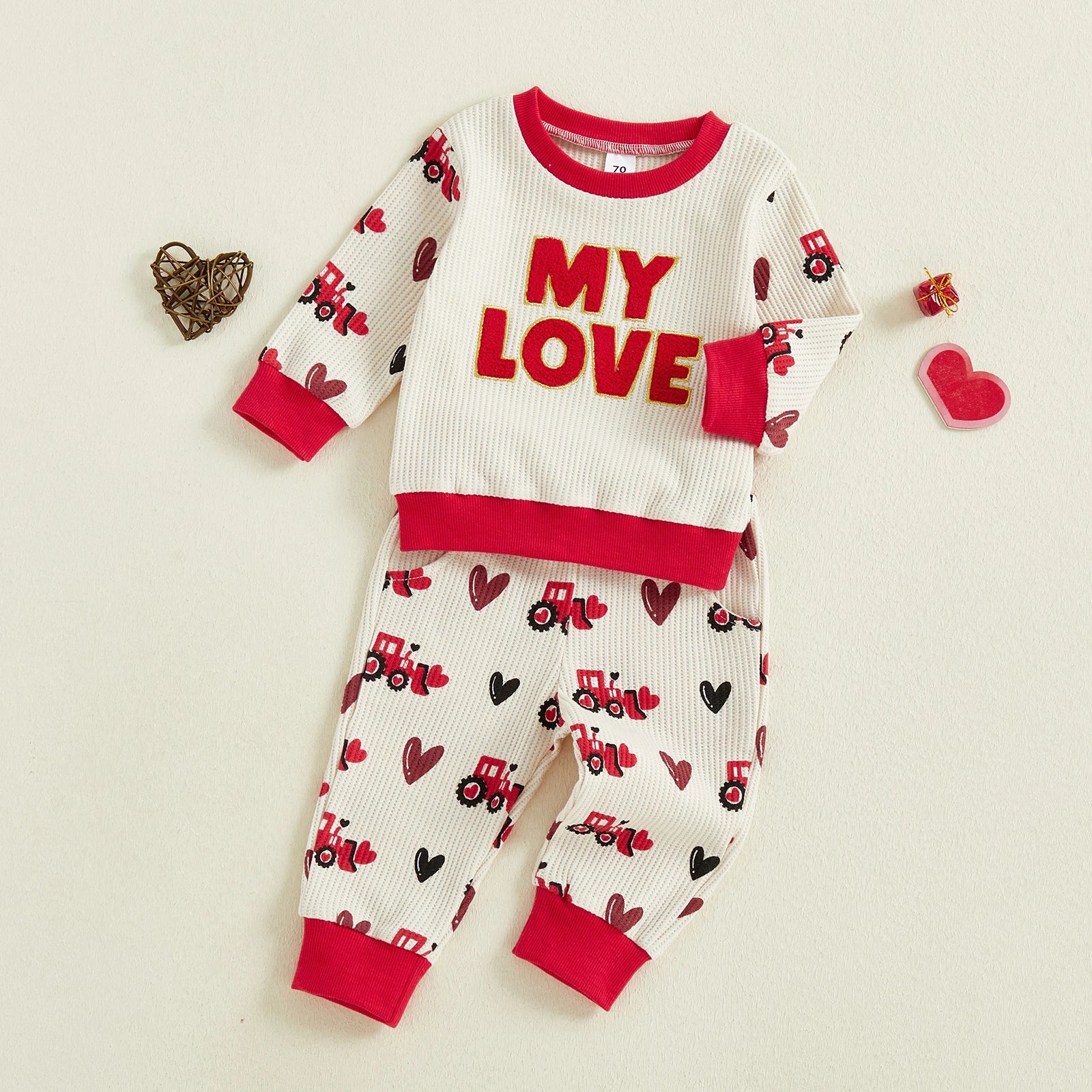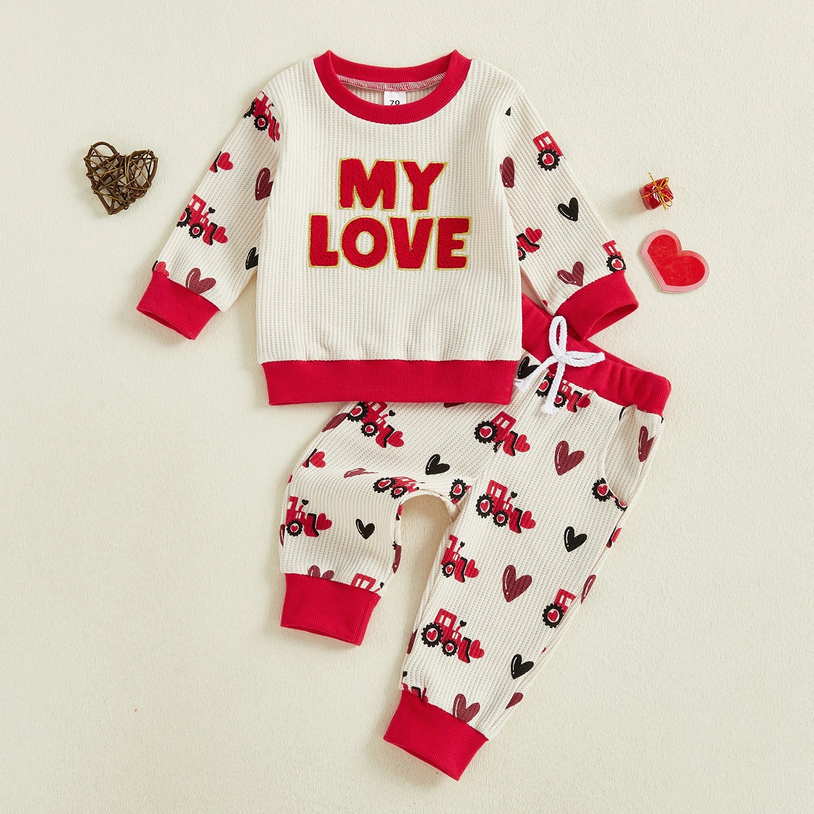 Baby Toddler Boy 2Pcs MY LOVE Valentine's Outfit Letter Embroidery Long Sleeve Crew Neck Pullover Top and Joggers Pants Set