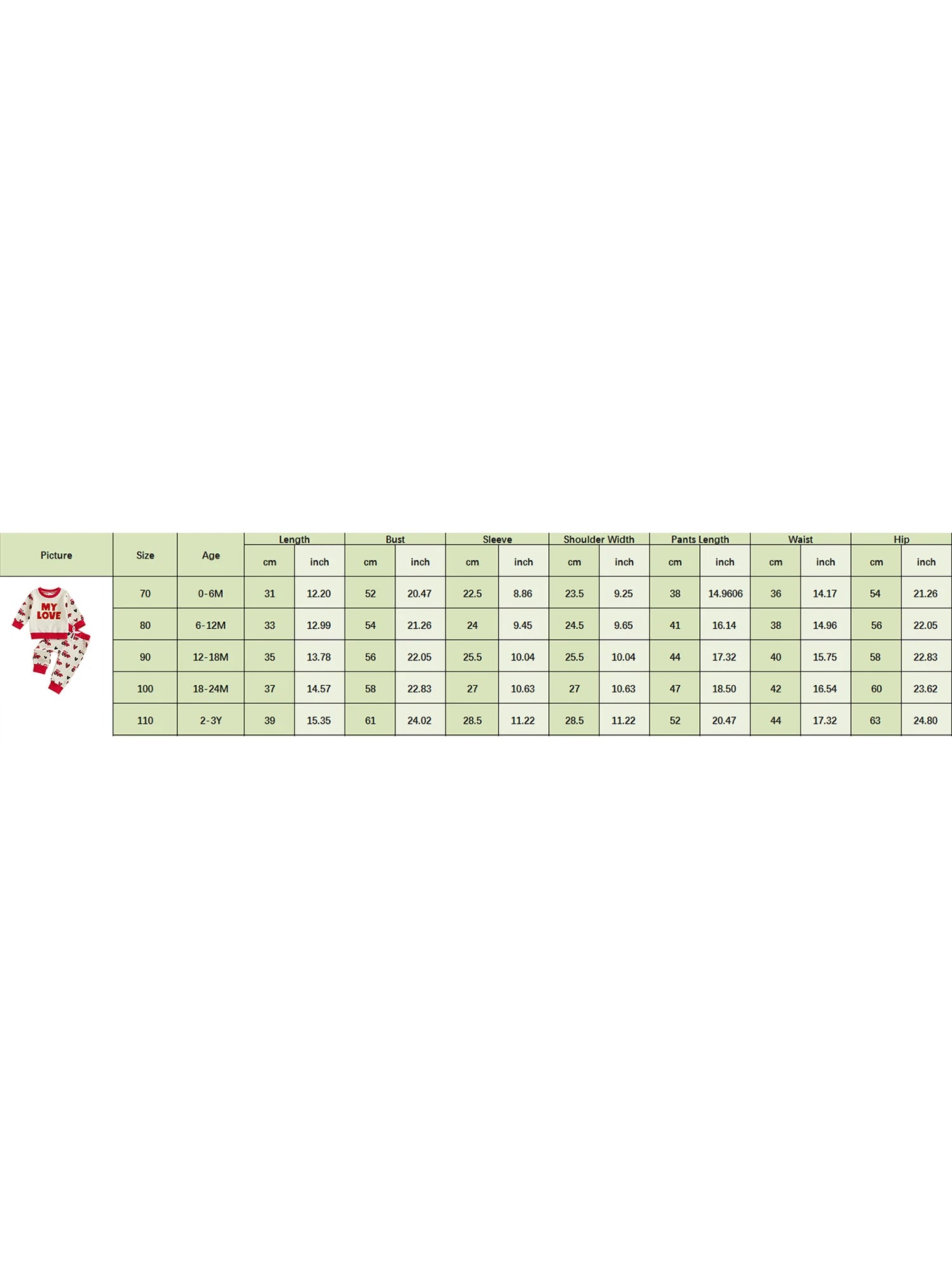 100 Length: 14.57 Bust: 22.83 Sleeve: 10.63 Shoulder Width: 10.63 Pants Length: 18.50 Waist: 16.54 Hip: 23.62 Advised Age: 18-24 Months