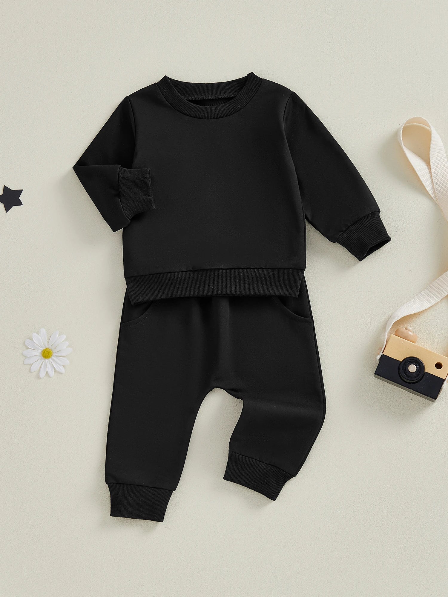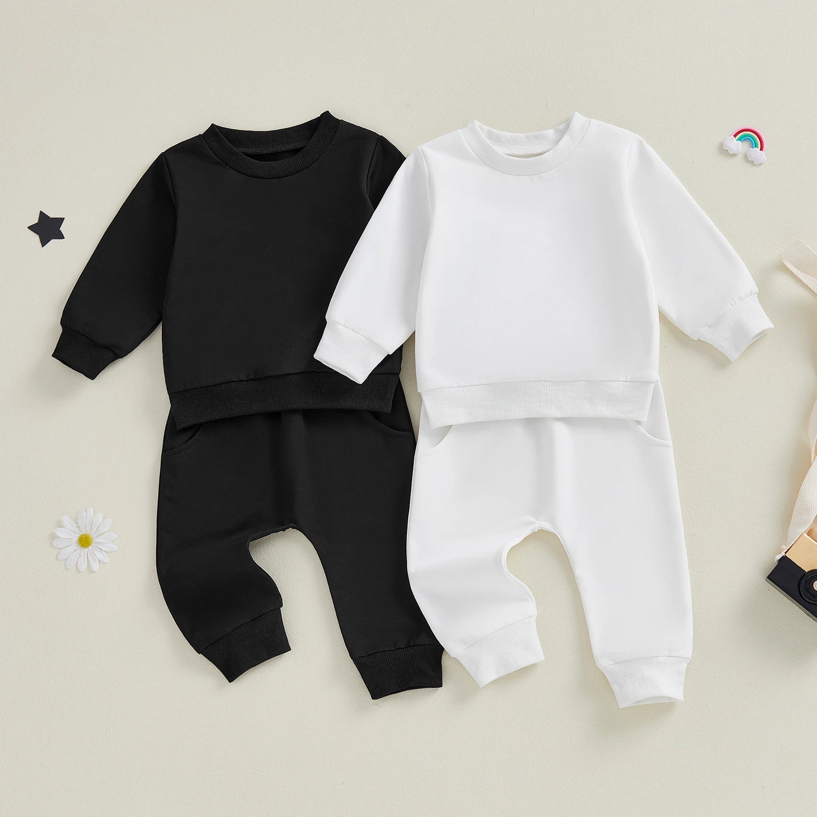 Baby Toddler Boy Girl 2Pcs Spring Fall Outfits Solid Color Long Sleeve Round Neck Pullover Top + Elastic Waist Long Pants Jogger Set