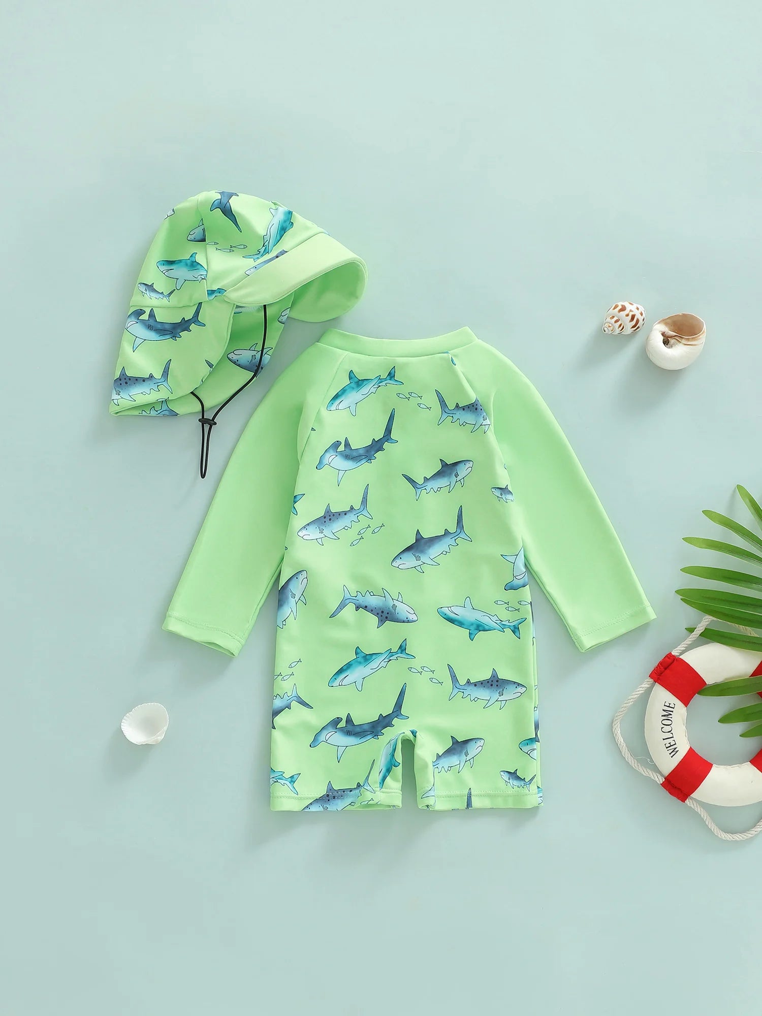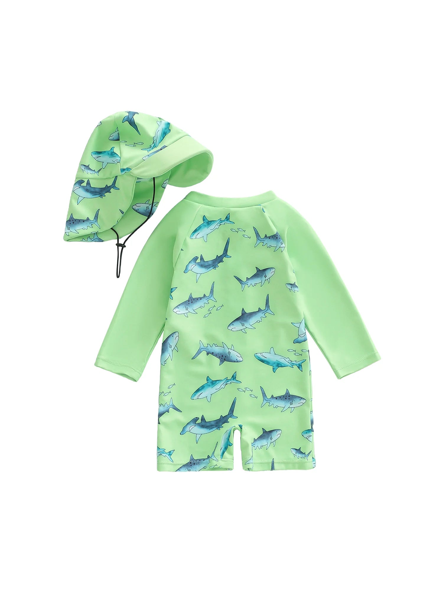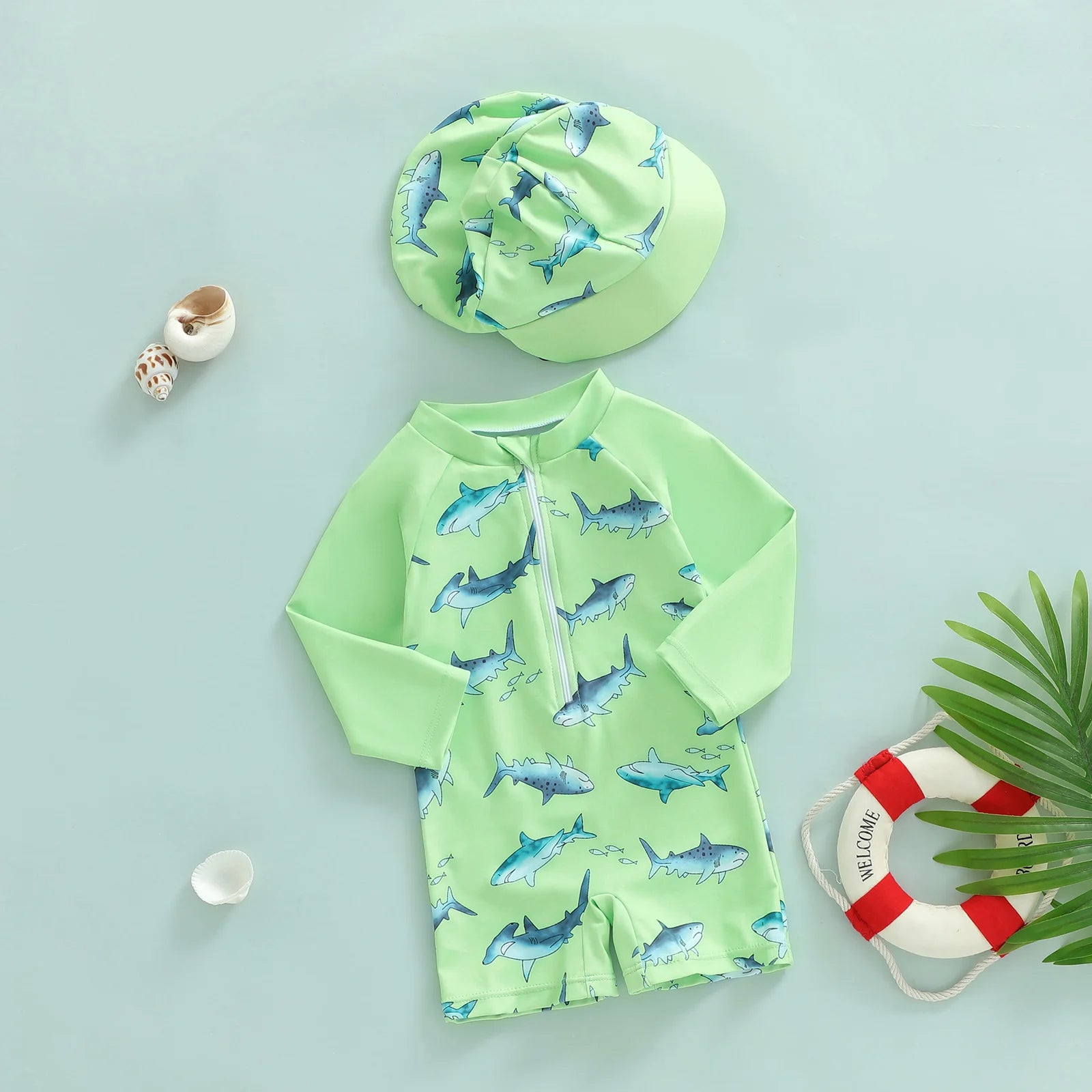 Baby Toddler Boys 2Pcs Casual Shark Print Zipper Long Sleeve Bathing Suit Romper with Swim Cap Set