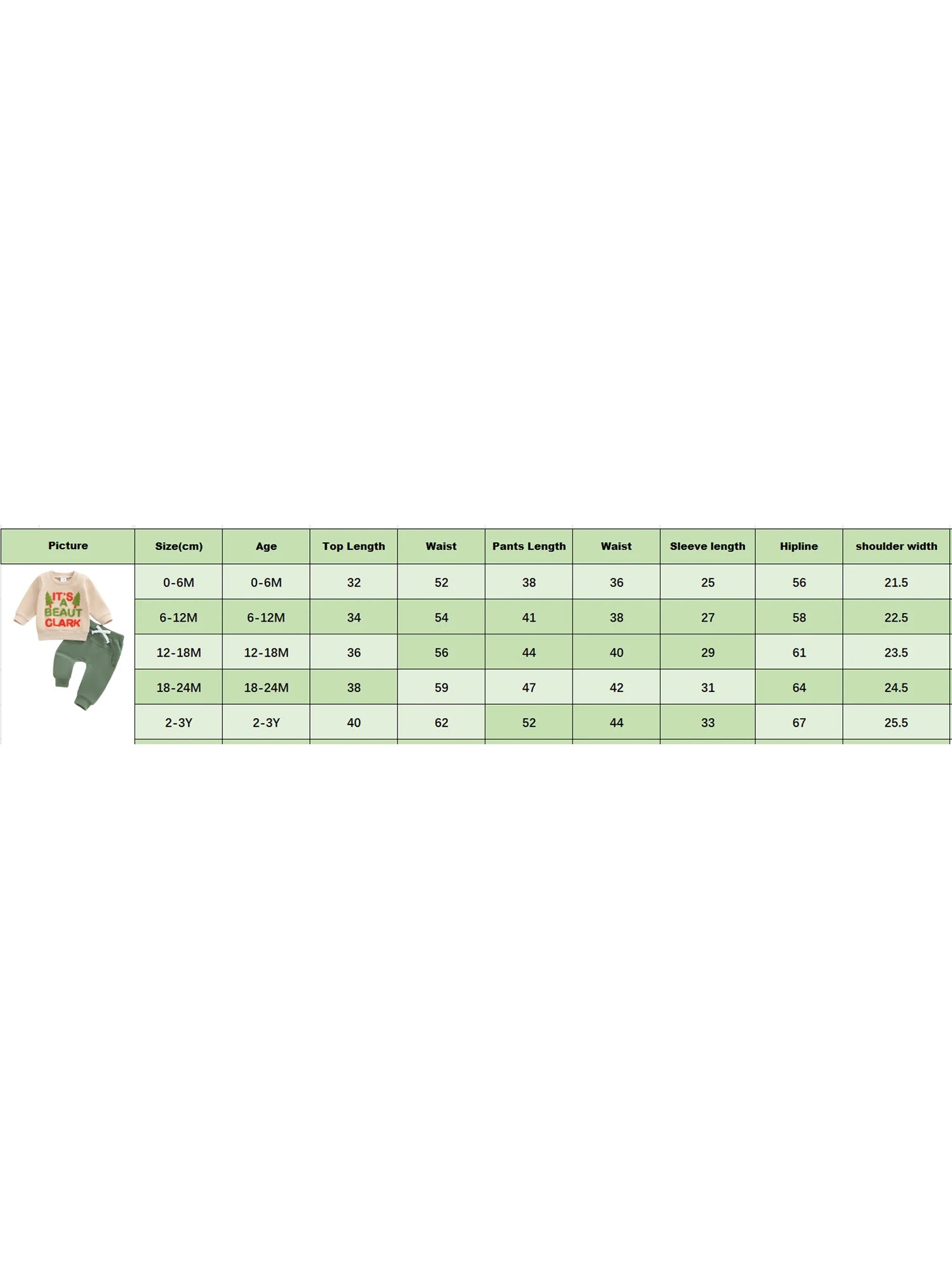0-6M Clothes Length: 12.6 Bust: 20.5 Sleeve Length: 9.8 Shoulder: 8.5 Pant: 15.0 Waist: 14.2 Hip: 22.0 Advised Age: 0-6 Months