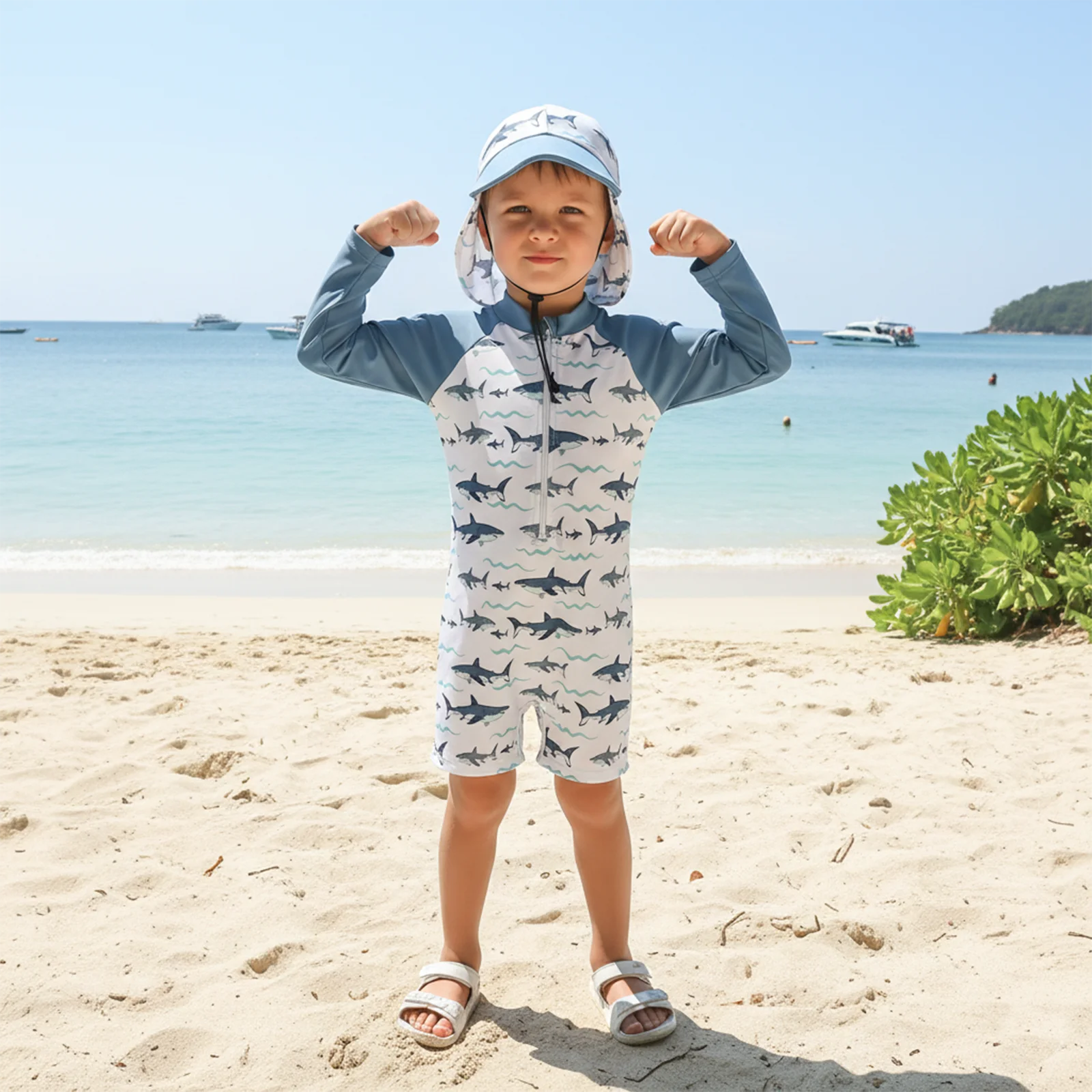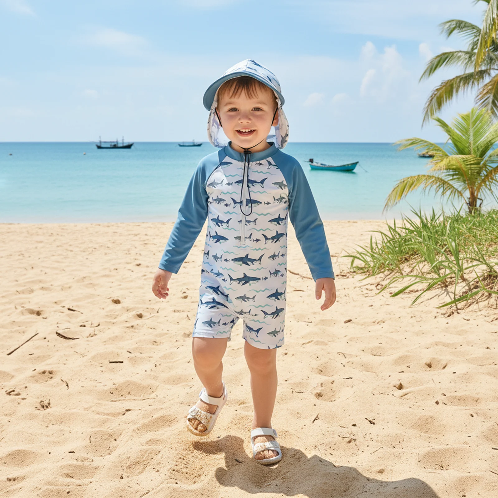 Baby Toddler Boys 2Pcs Rash Guard Swimsuit Fashionable Cute Animal Printed Long Sleeve Jumpsuit with Hat 2Pcs Swimwear Set