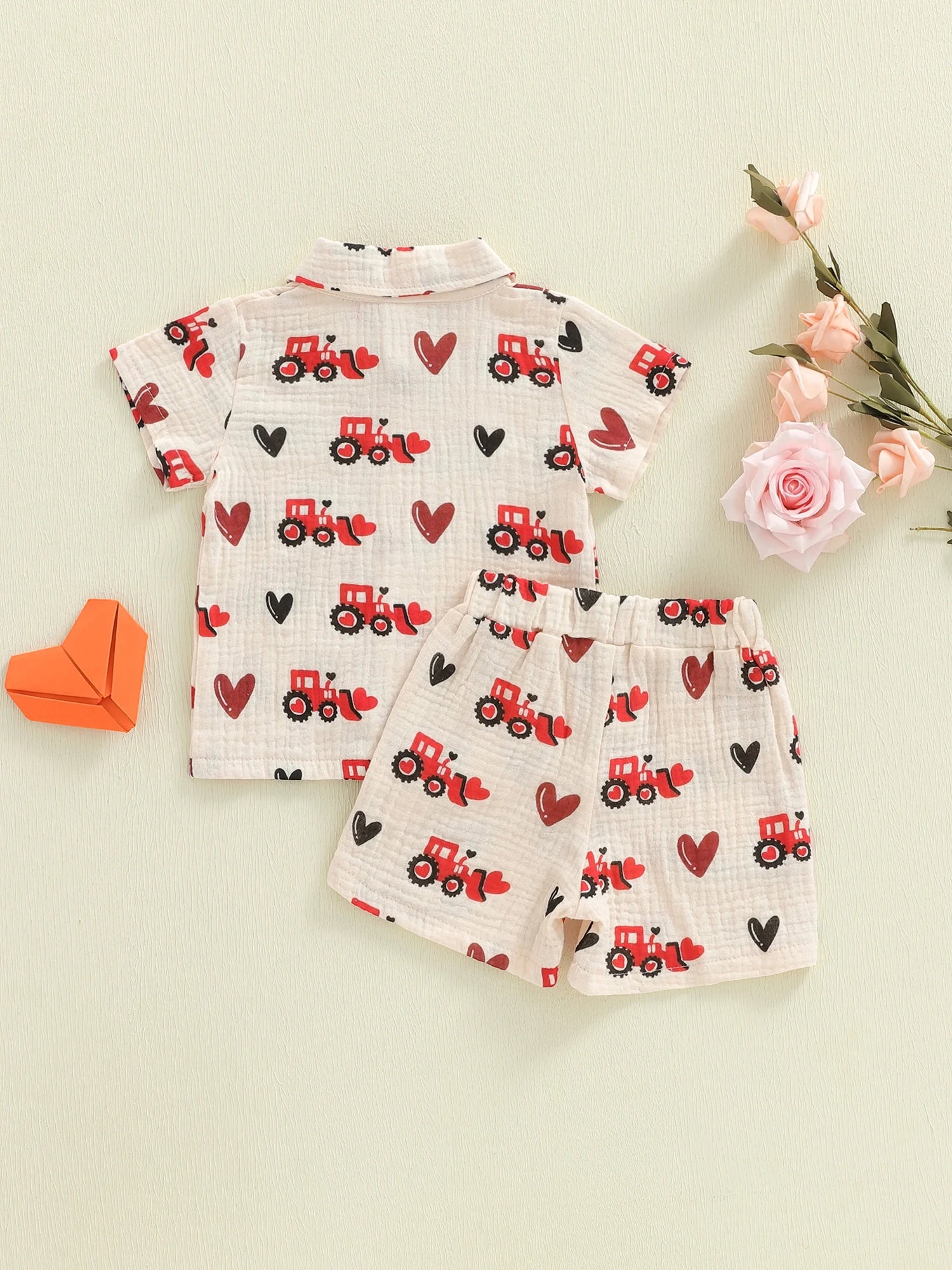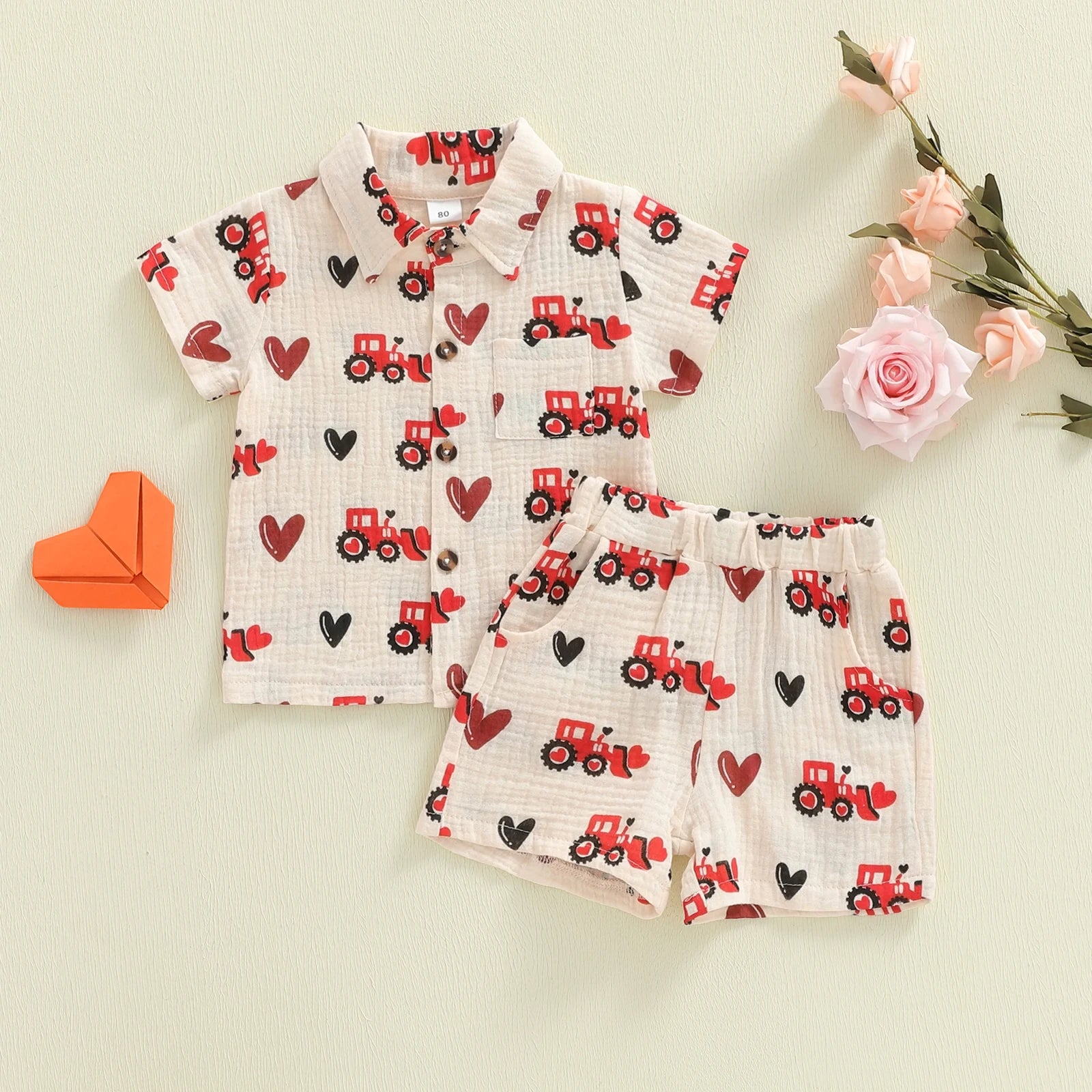 Baby Toddler Boys 2Pcs Valentine's Day Shorts Sets Short Sleeve Lapel Tractor Heart Print Top and Shorts Set