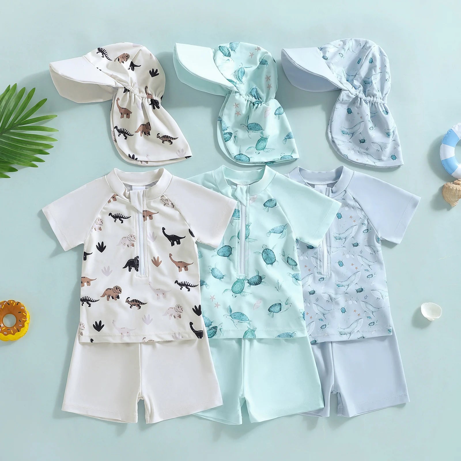 Baby Toddler Boys 3Pcs Rash Guard Swimsuit Short Sleeve Dinosaur Print Top Swim Shorts Hat Swimwear Three Piece Set