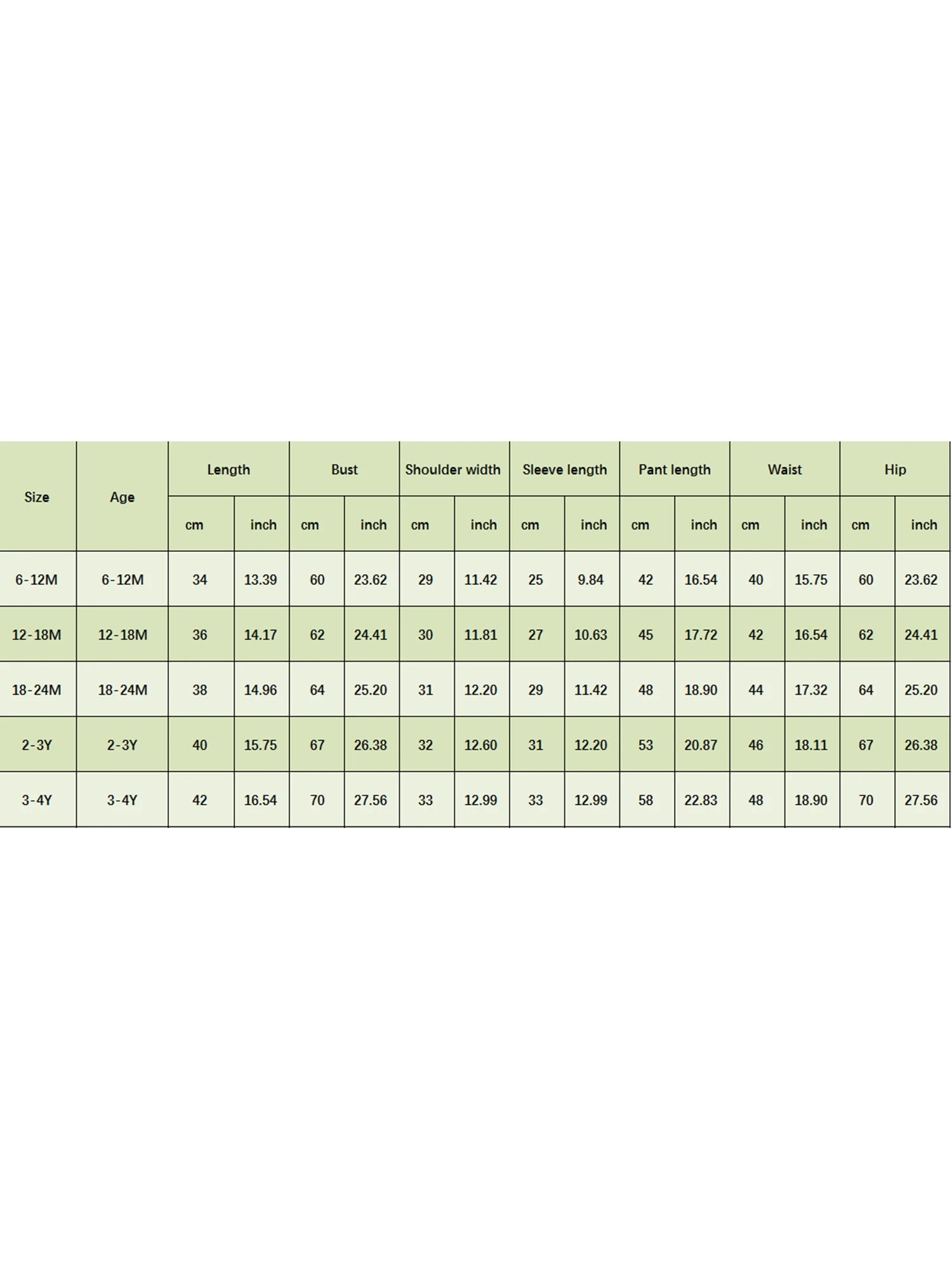6-12M Tops Length: 13.39 Bust: 23.62 Shoulder: 11.42 Sleeve: 9.84 Pants Length: 16.54 Waist: 15.75 Hip: 23.62 Advised Age: 6-12 Months