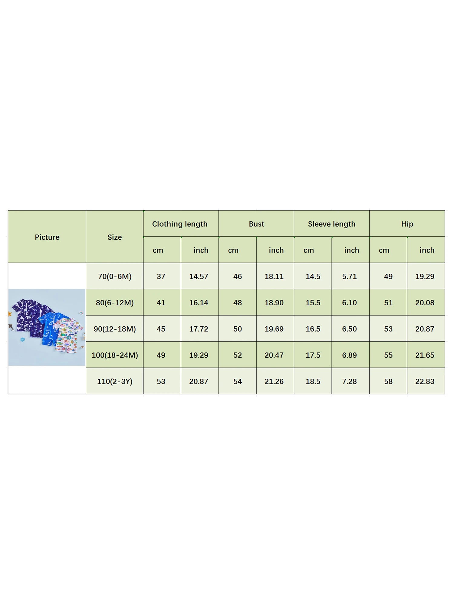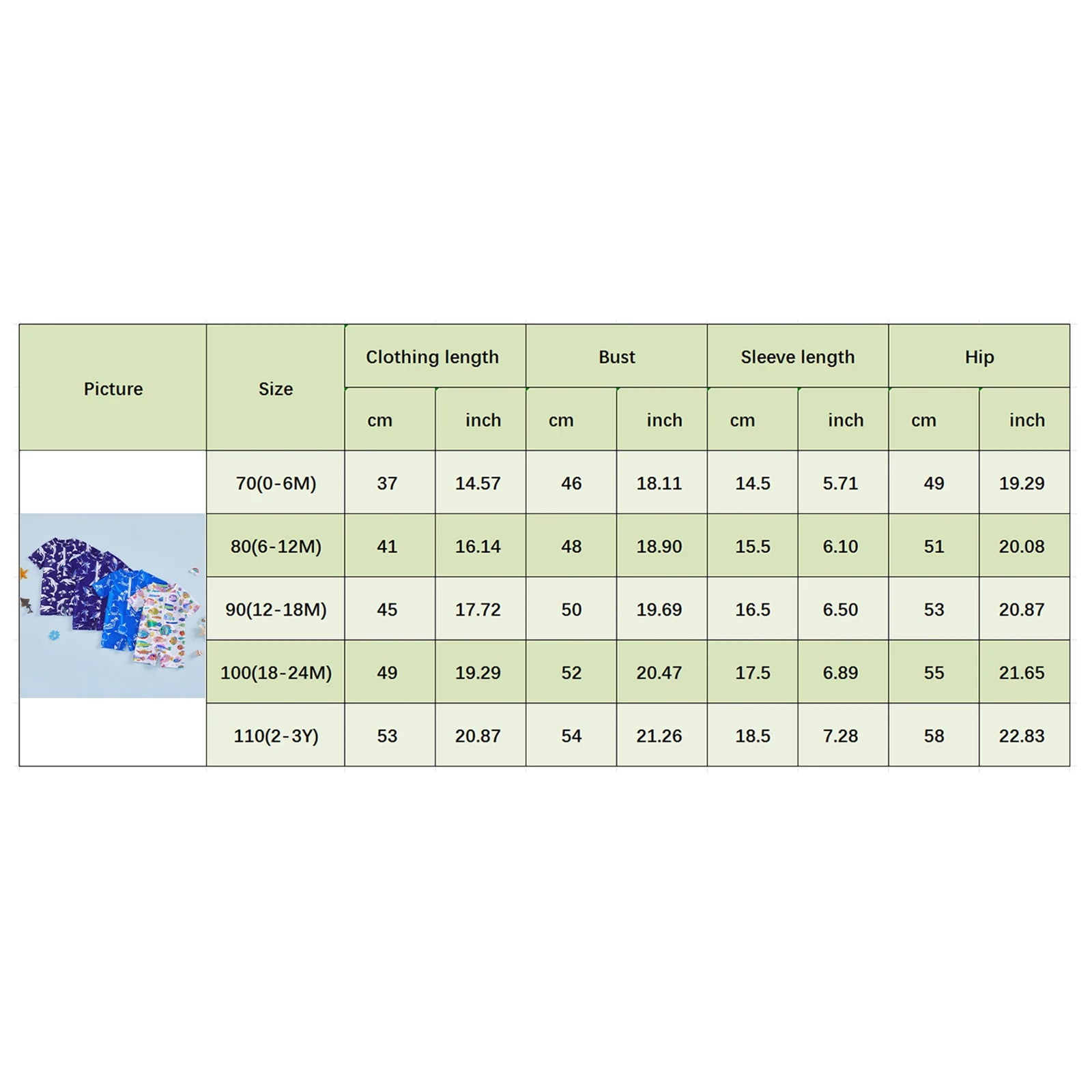 0-6M Length: 14.57 Bust: 18.11 Hip: 19.29 Sleeve: 5.71 Advised Age: 0-6 Months