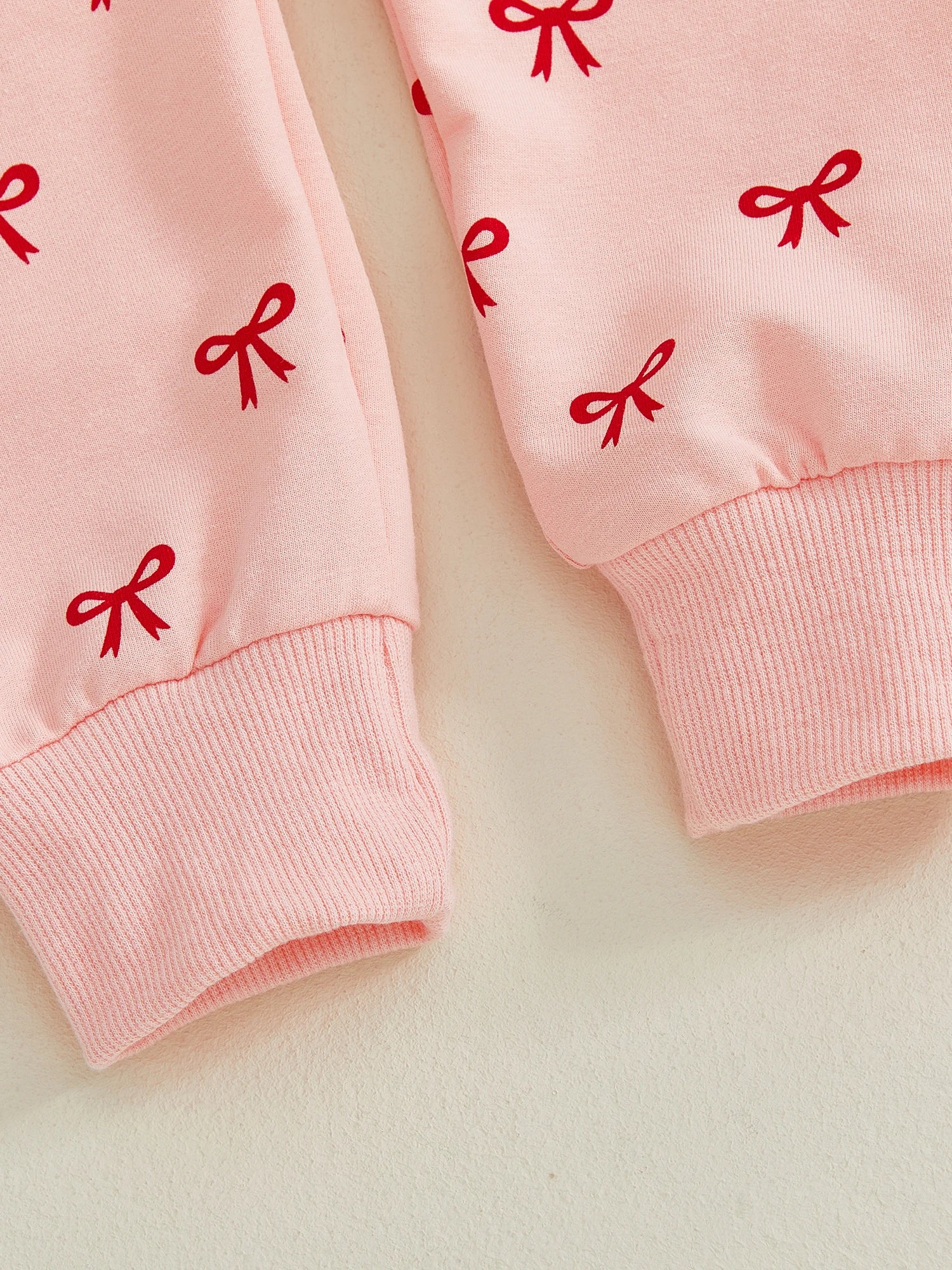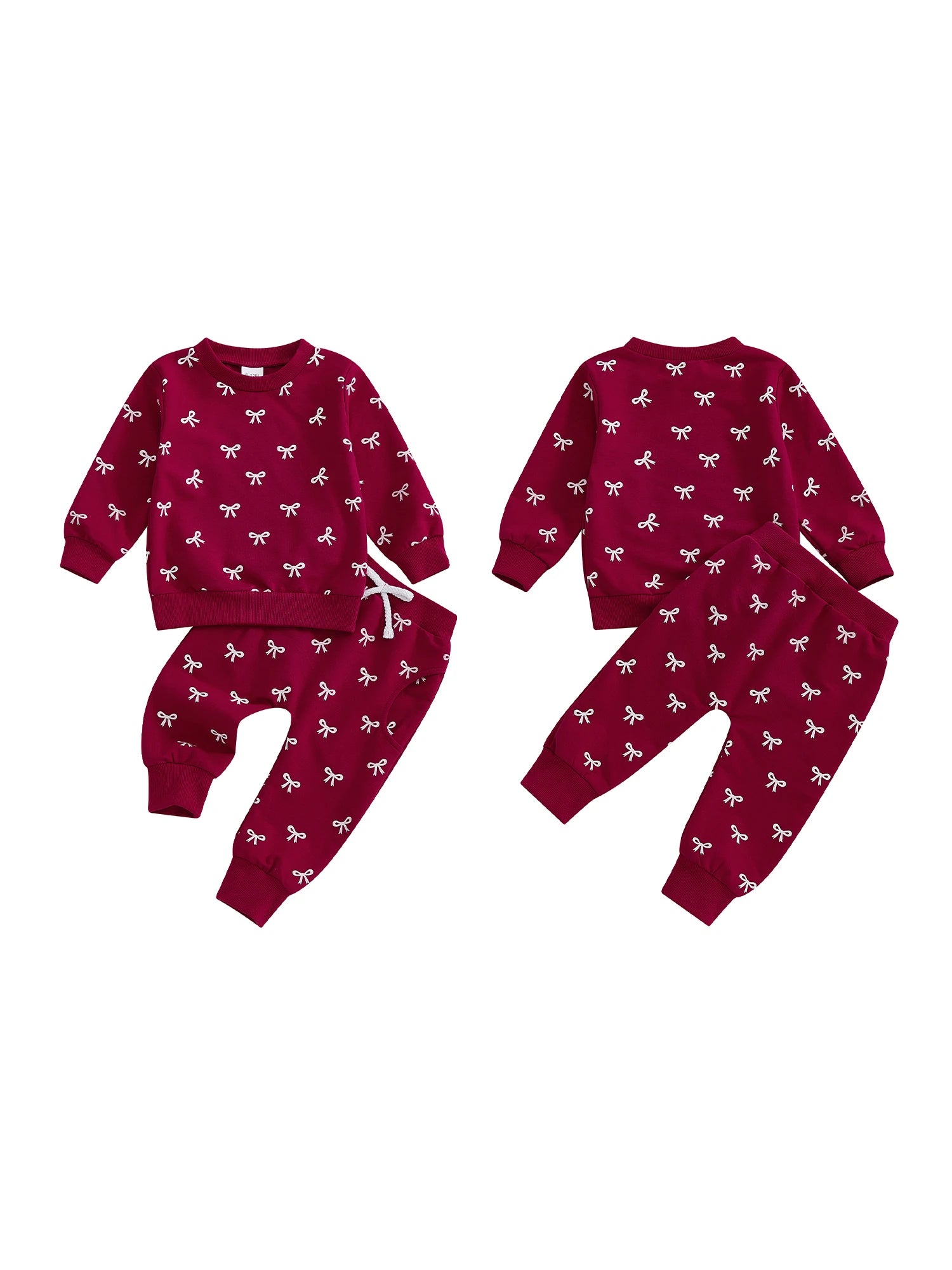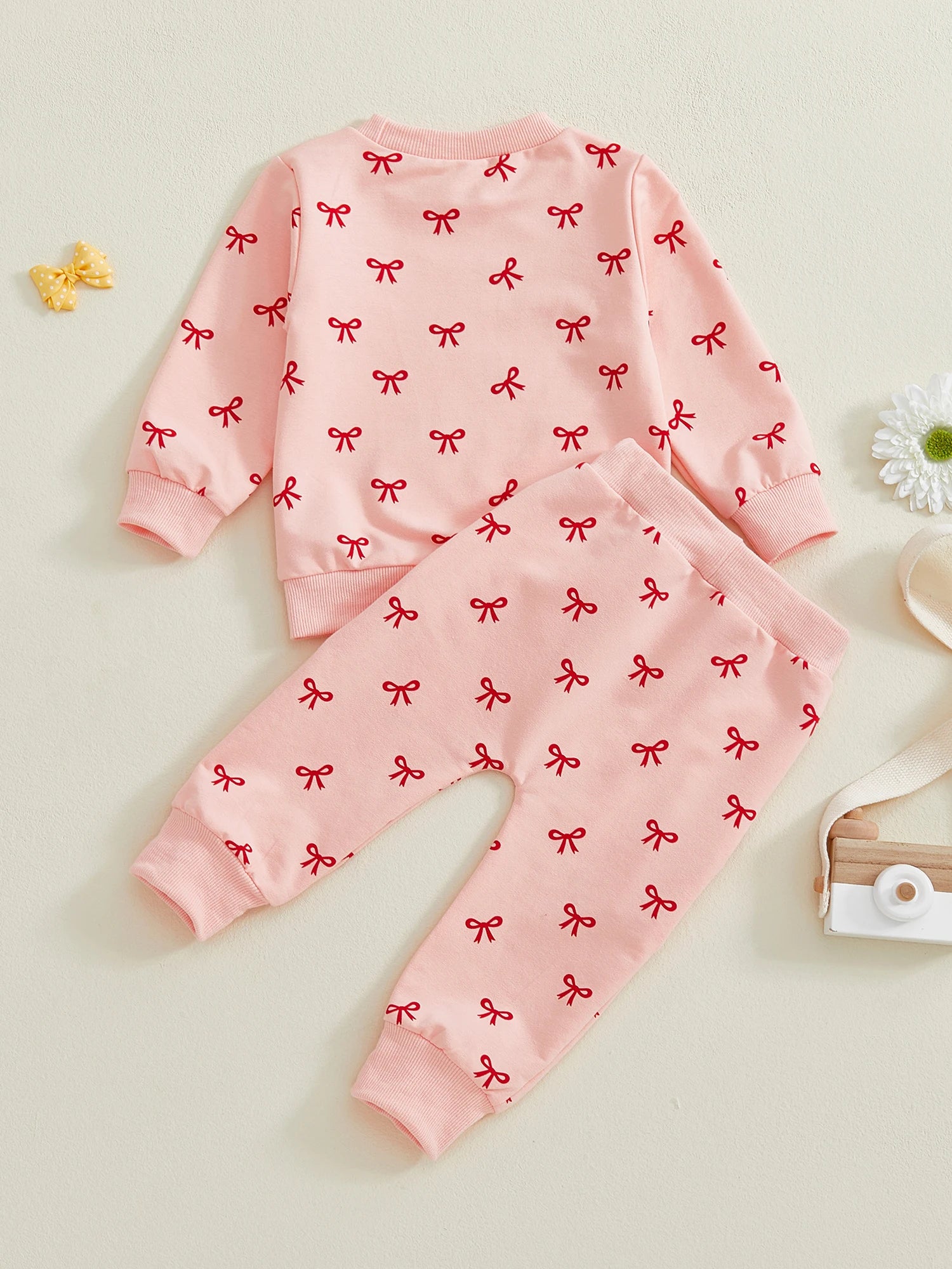 Baby Toddler Girl 2Pcs Fall Outfits Bow Print Long Sleeve Round Neck Pullover + Elastic Waist Long Pants 2Pcs Jogger Set