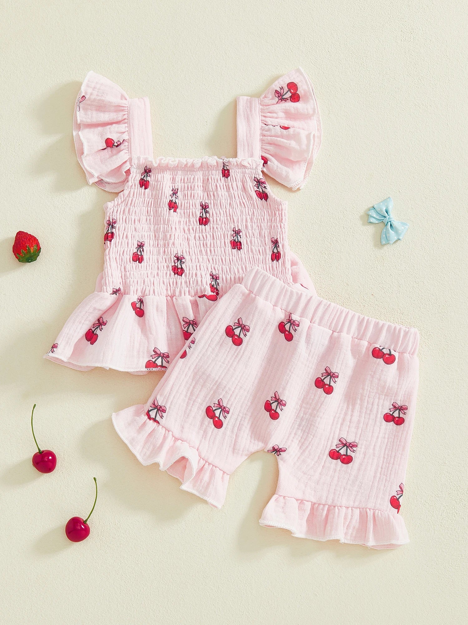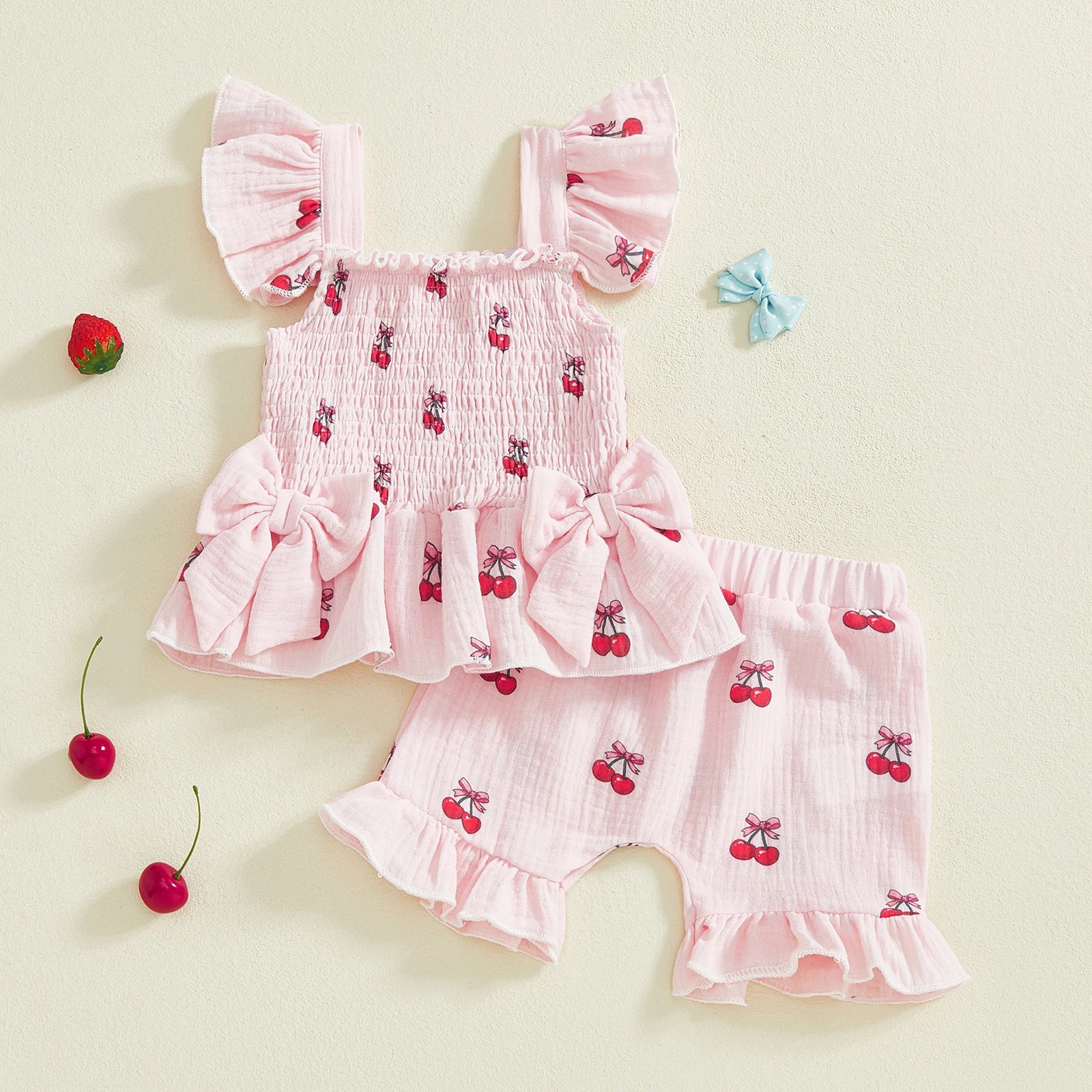 Baby Toddler Girl 2Pcs Summer Outfits Ruffle Sleeveless Cherries Fruit Print Smocked Top Shorts Set Clothes