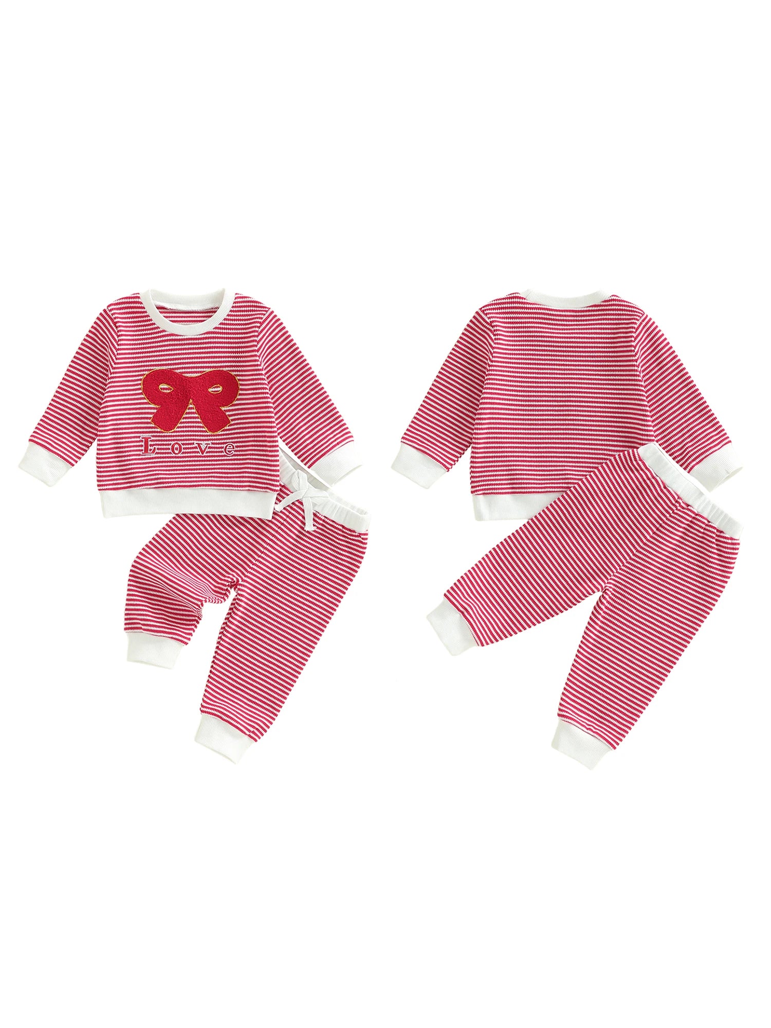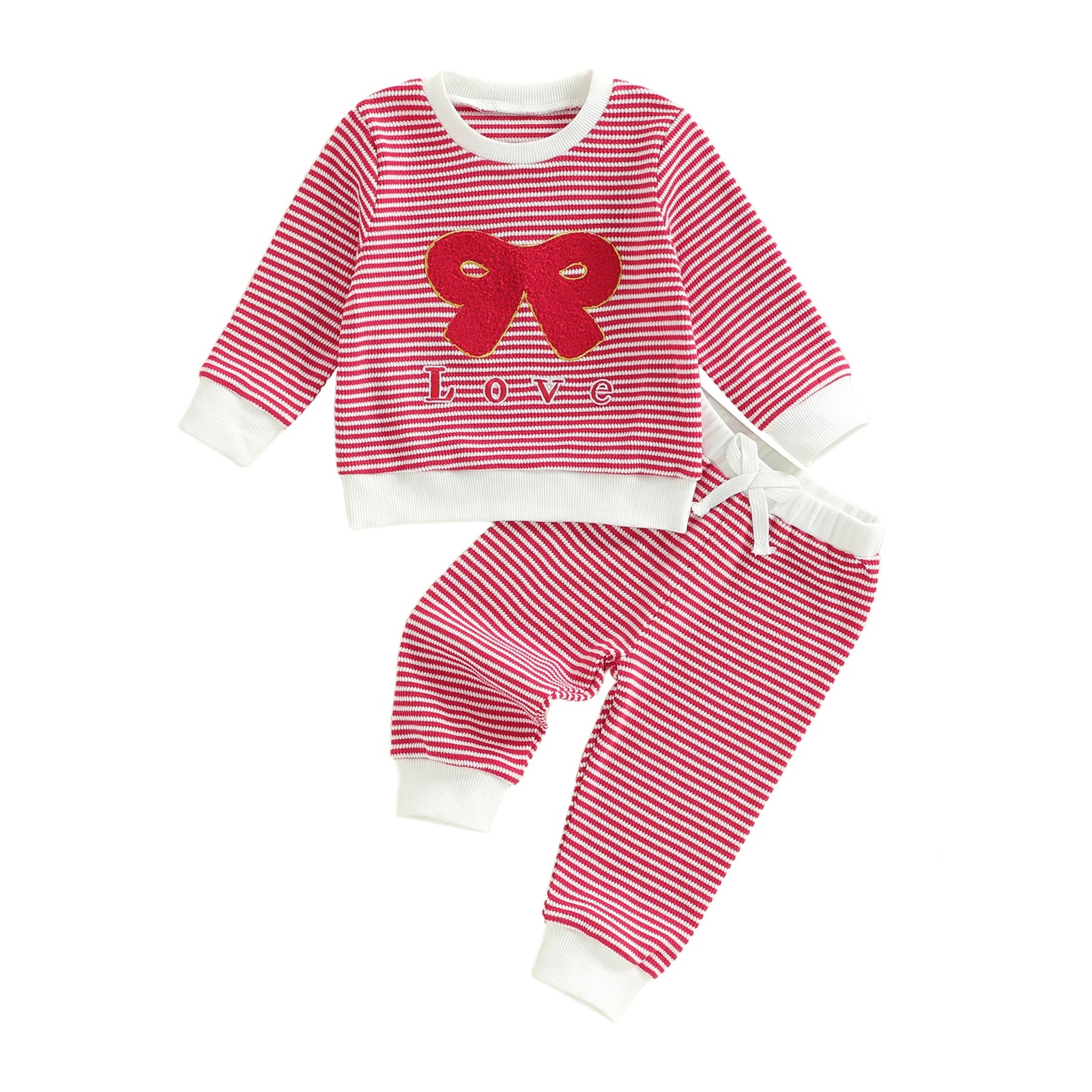 Baby Toddler Girl 2Pcs Valentine's Day Outfit Striped Bow Letter Be Mine / Love Embroidered Long Sleeve Top and Pants 2 Jogger Set