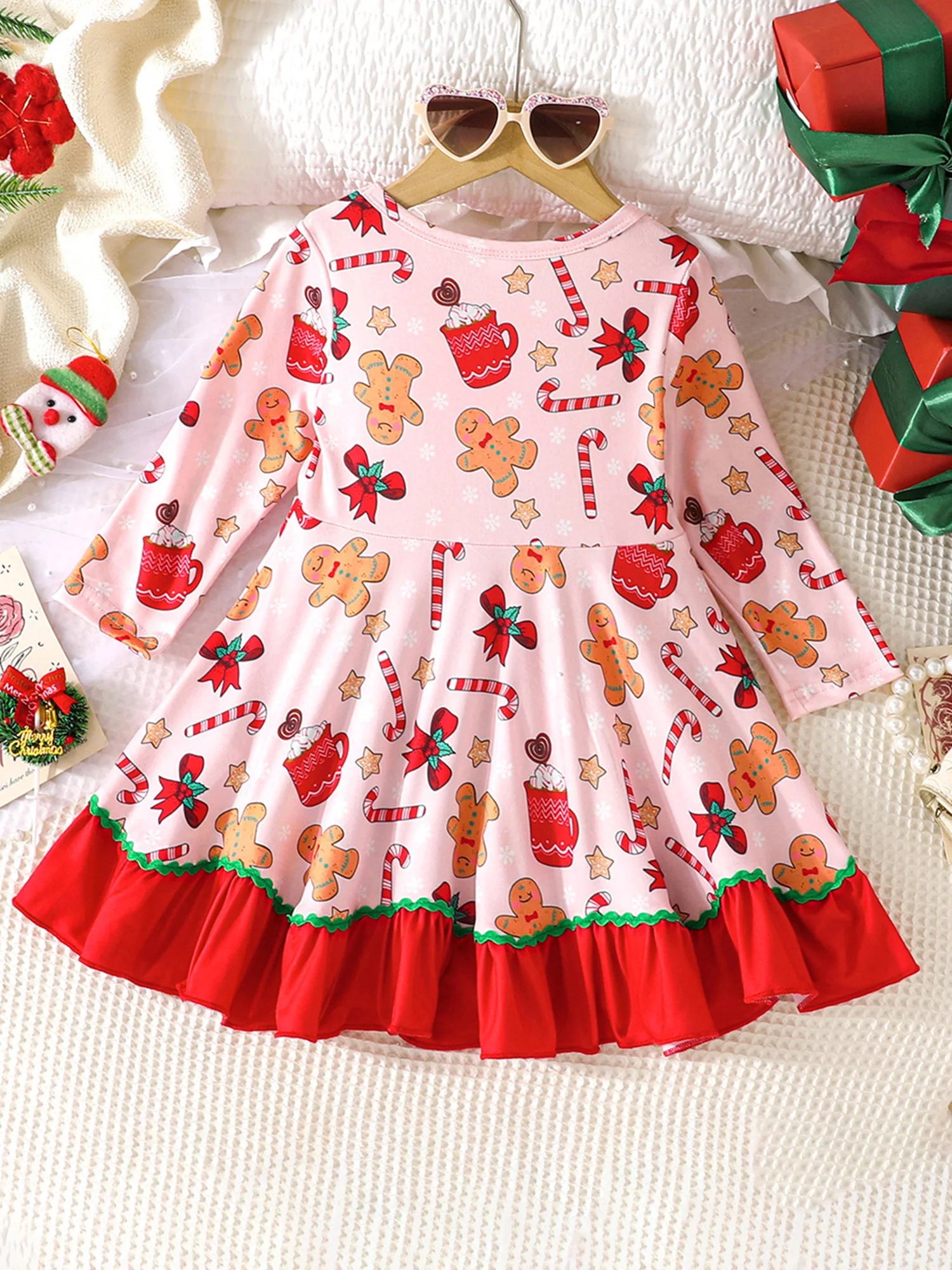 Baby Toddler Girl Christmas Dress Long Sleeve Crew Neck Gingerbread Man Cane Candy Print Dress