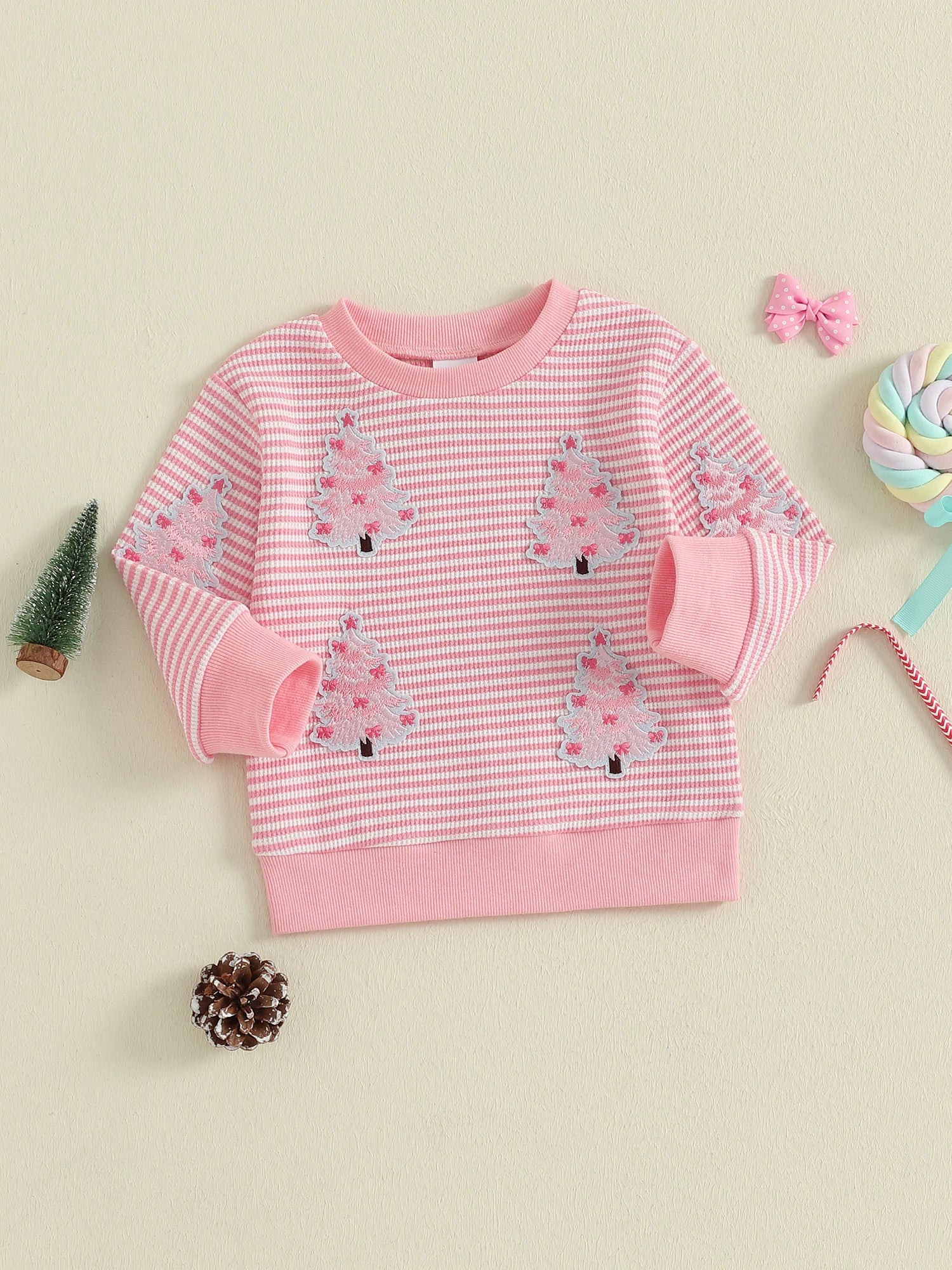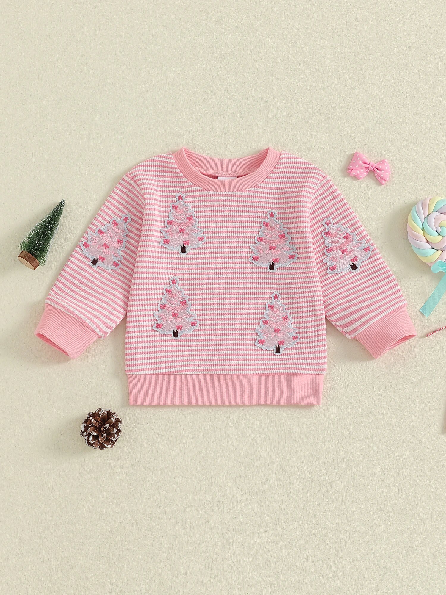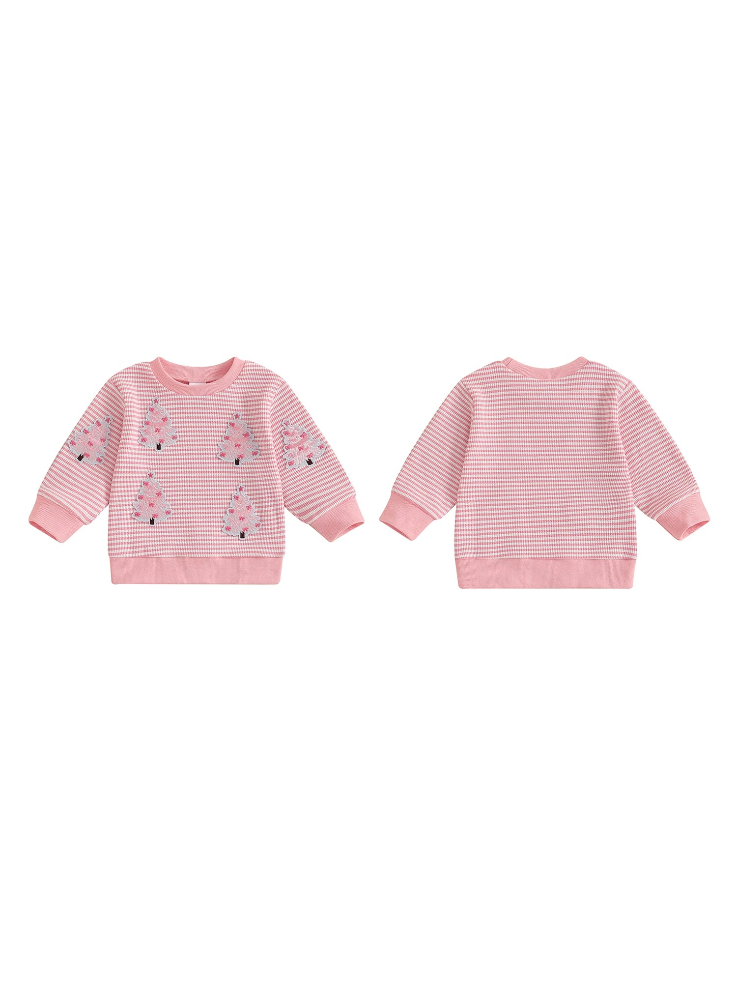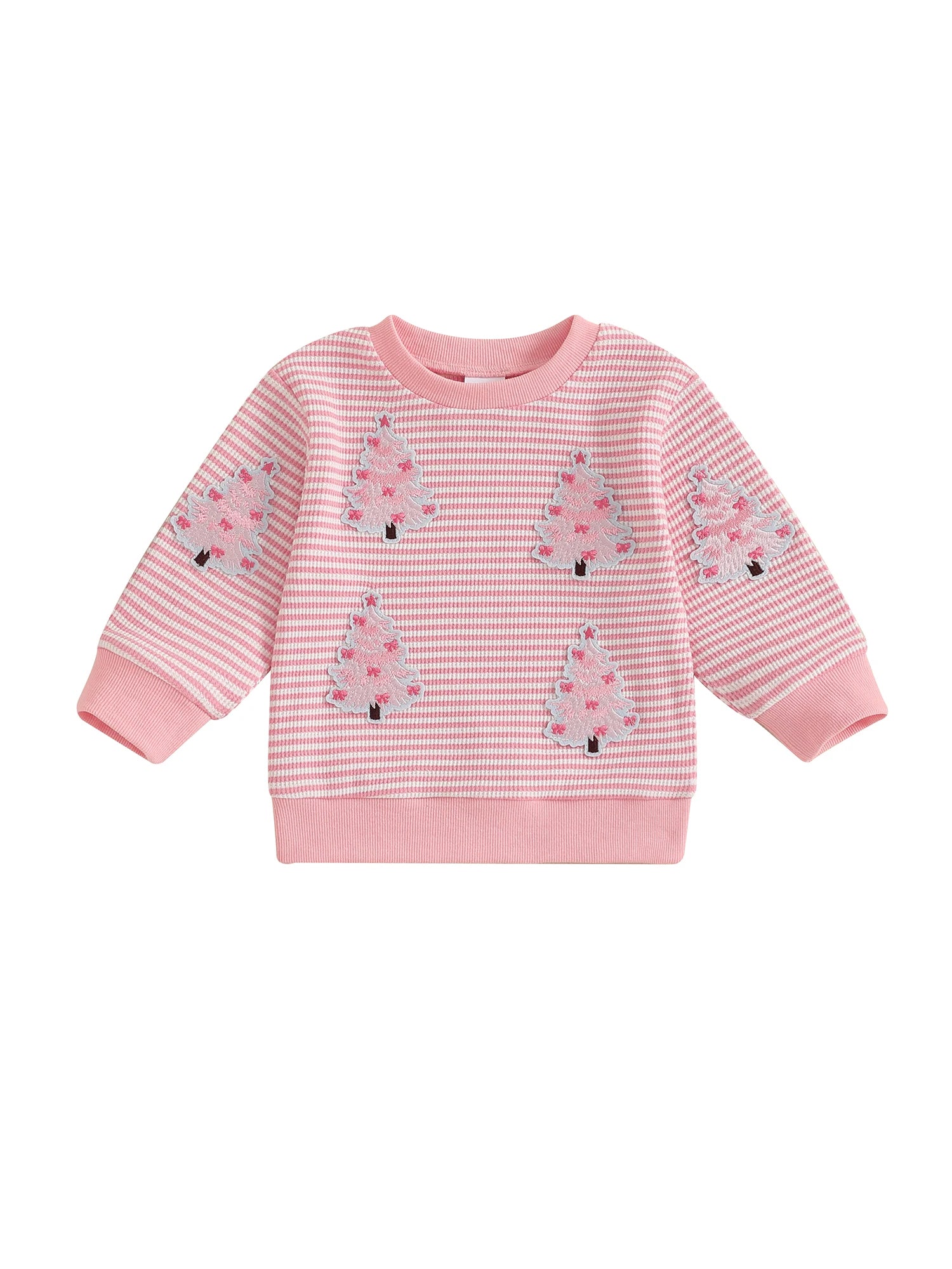 Baby Toddler Girl Christmas Top Christmas Tree Embroidered Striped Crew Neck Long Sleeve Pullover