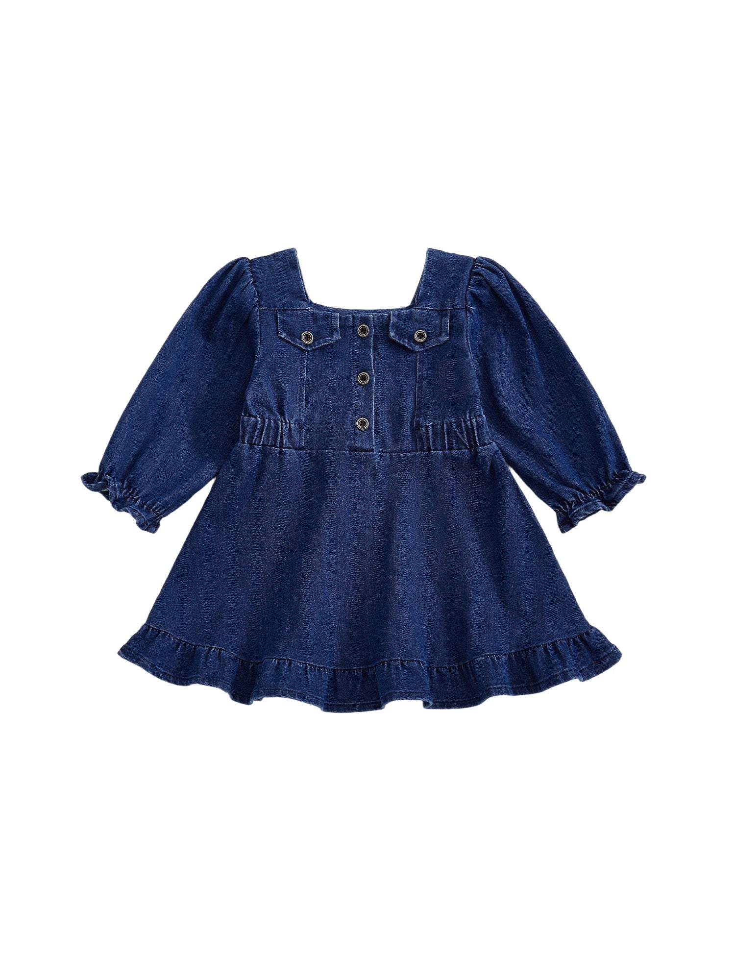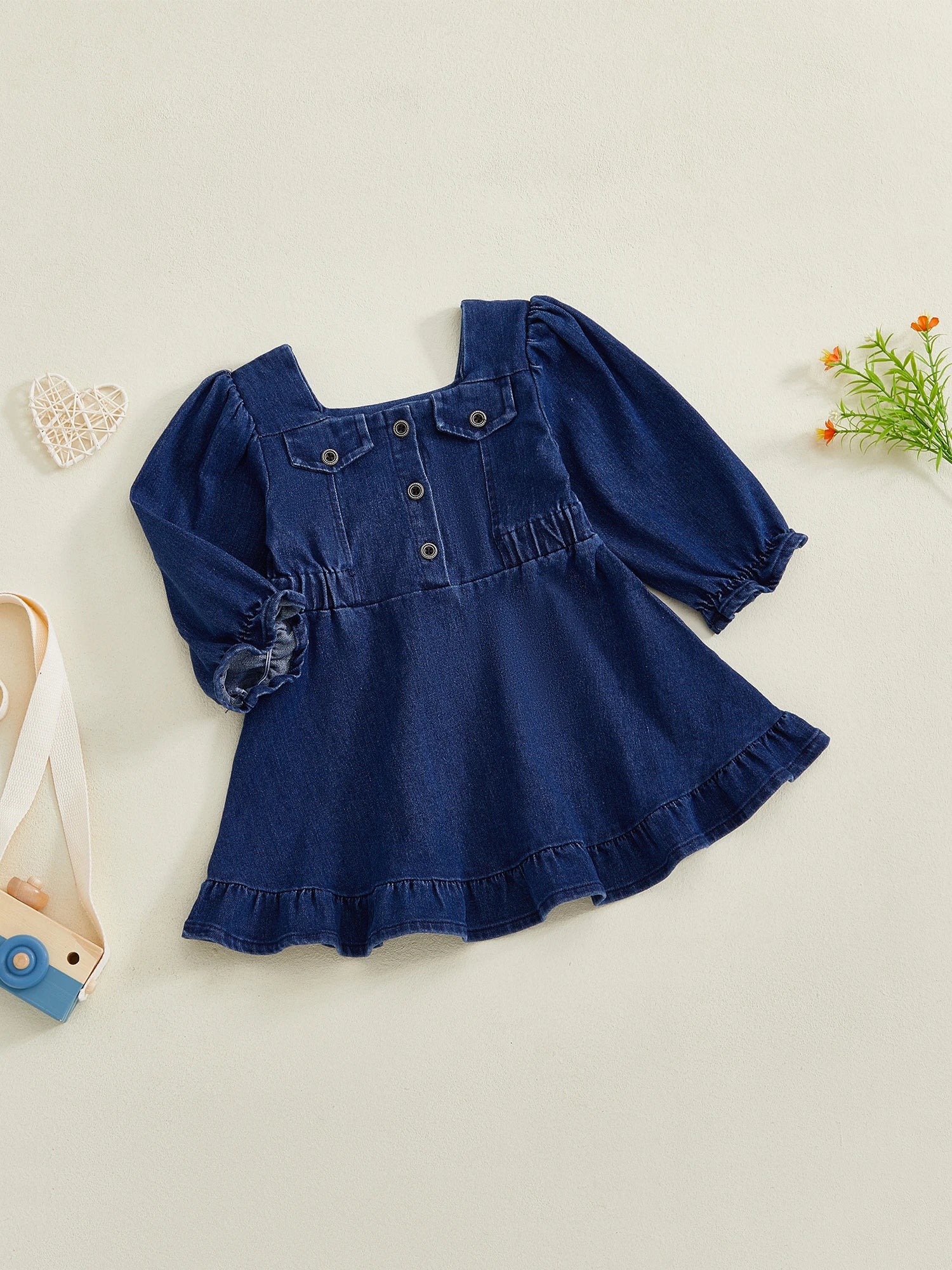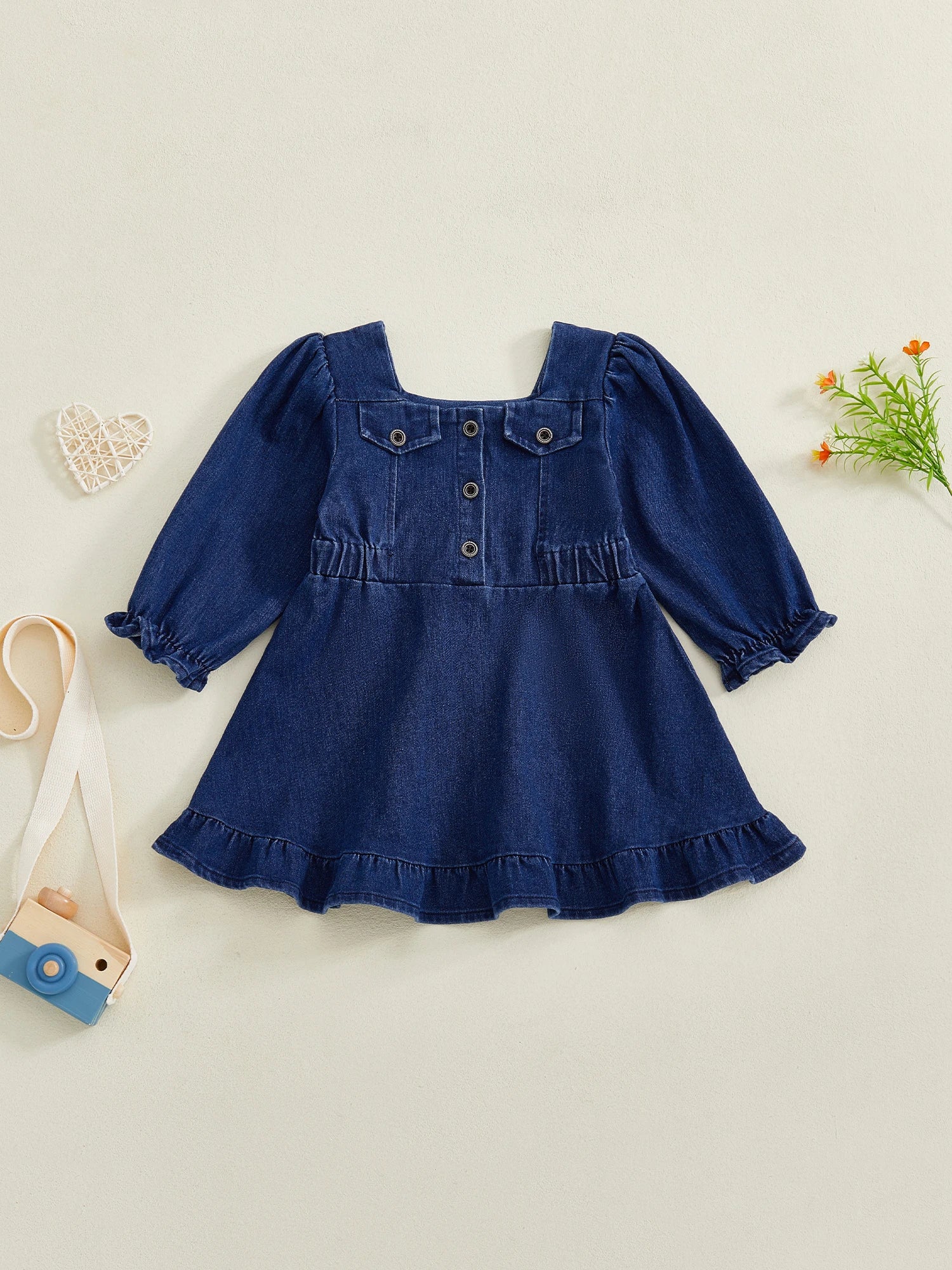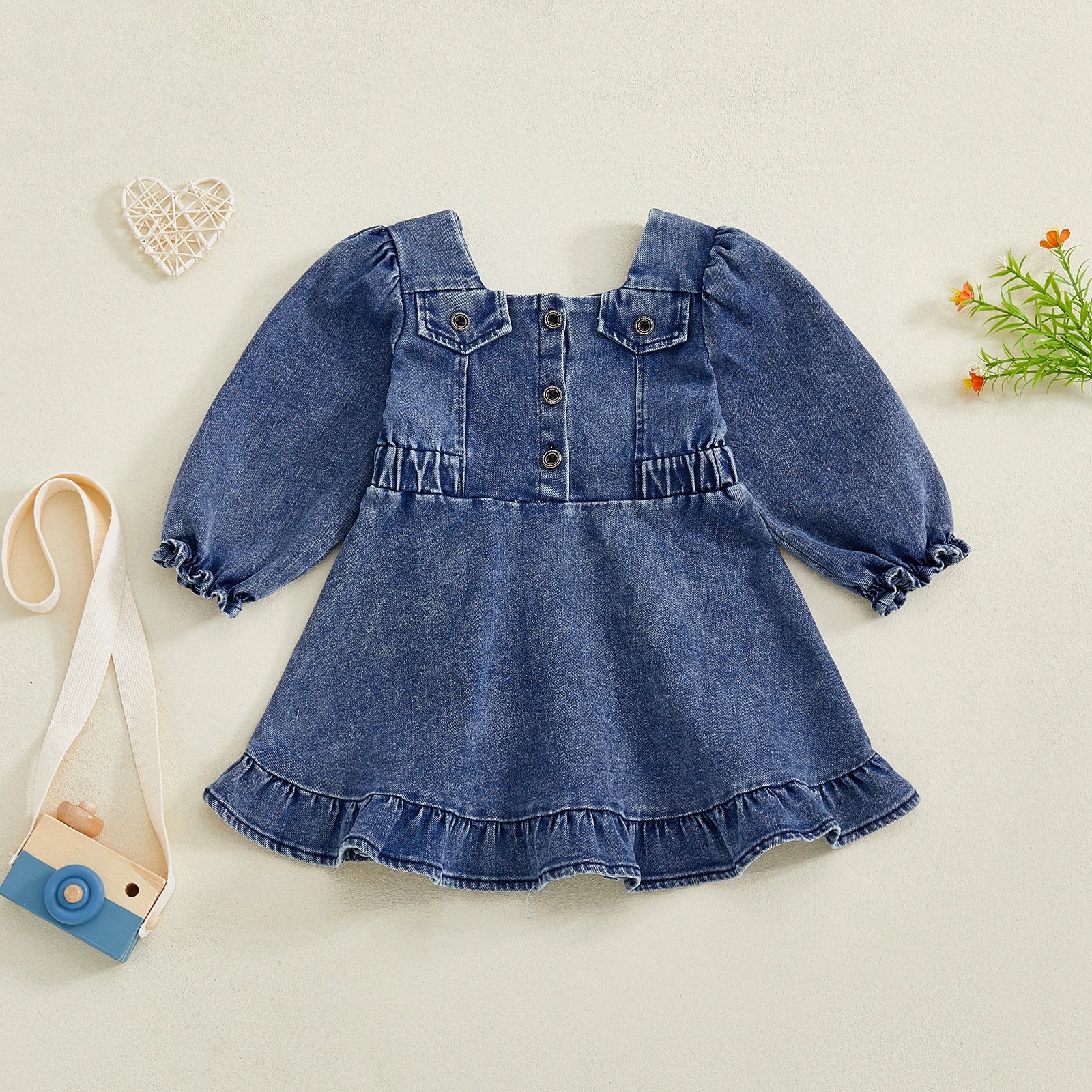 Baby Toddler Girl Denim Dress Long Puff Sleeve Button Down A-Line Dress Ruffle Dress