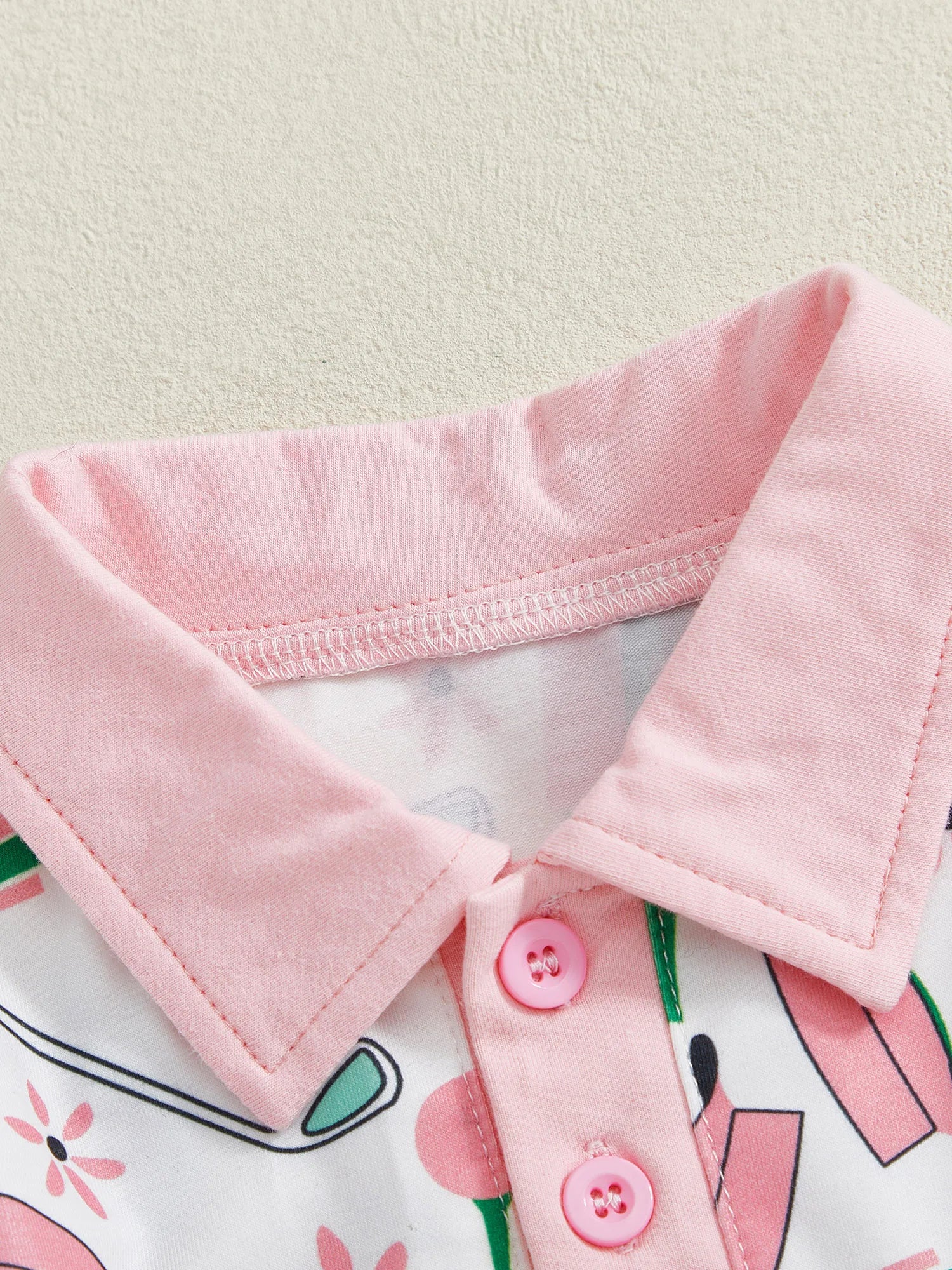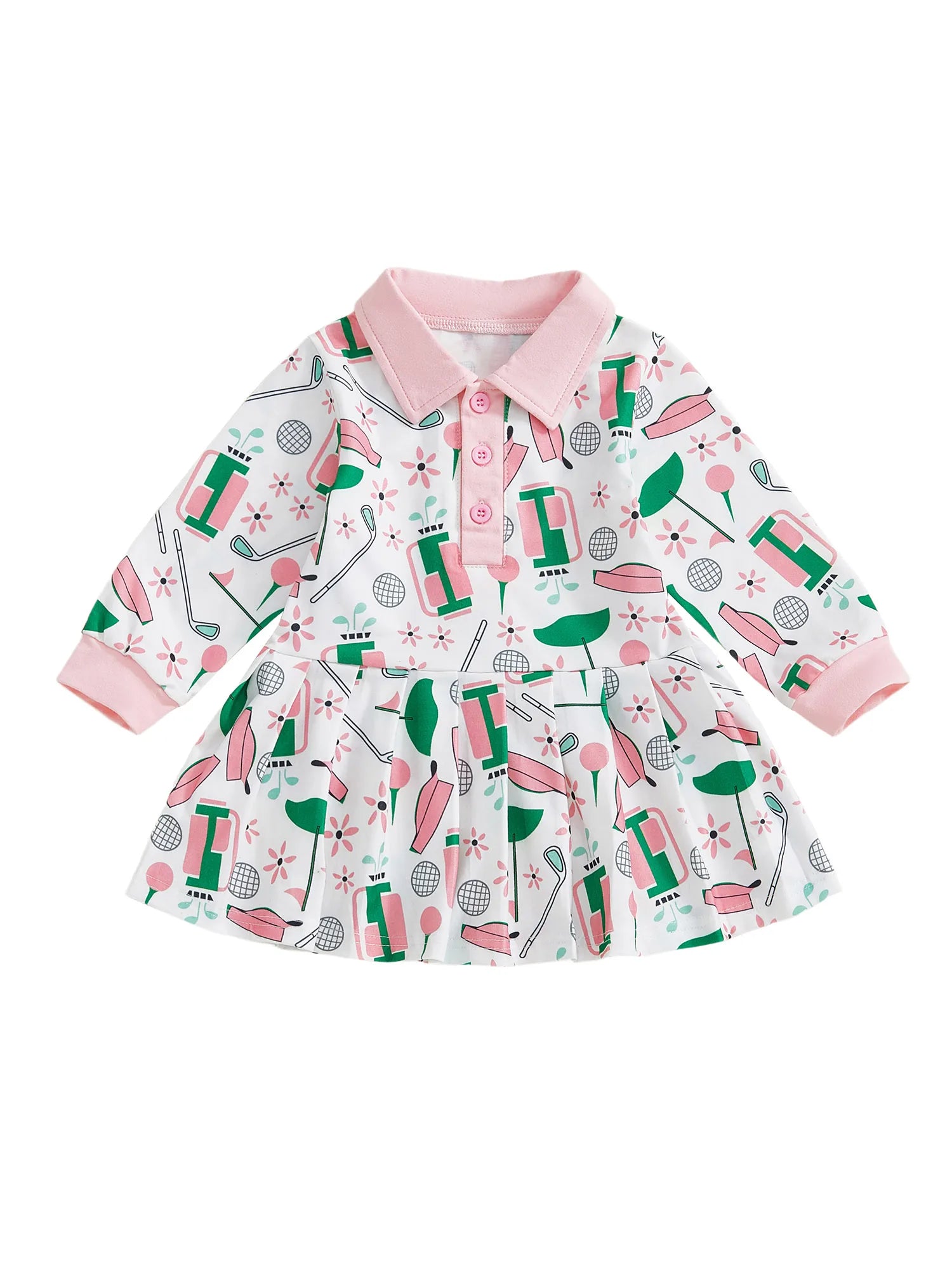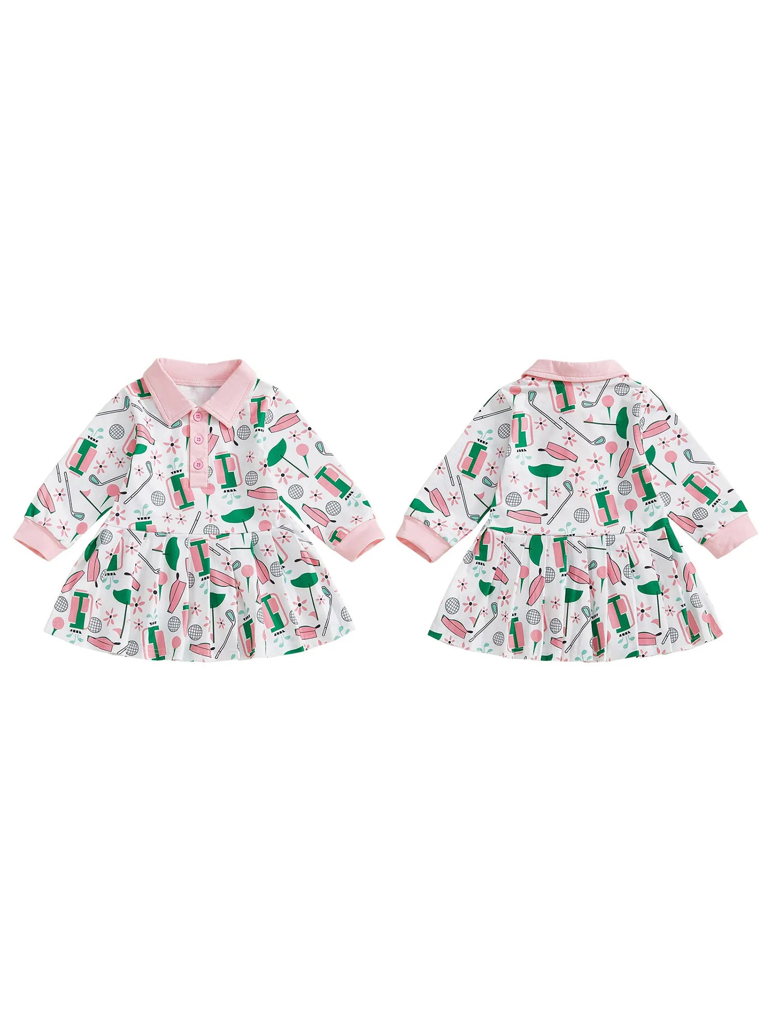 Baby Toddler Girl Golf Print Dress Lapel Button Front Long Sleeves A Line Dress