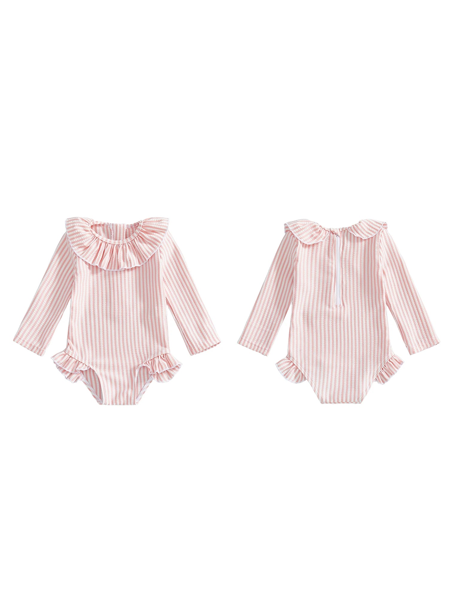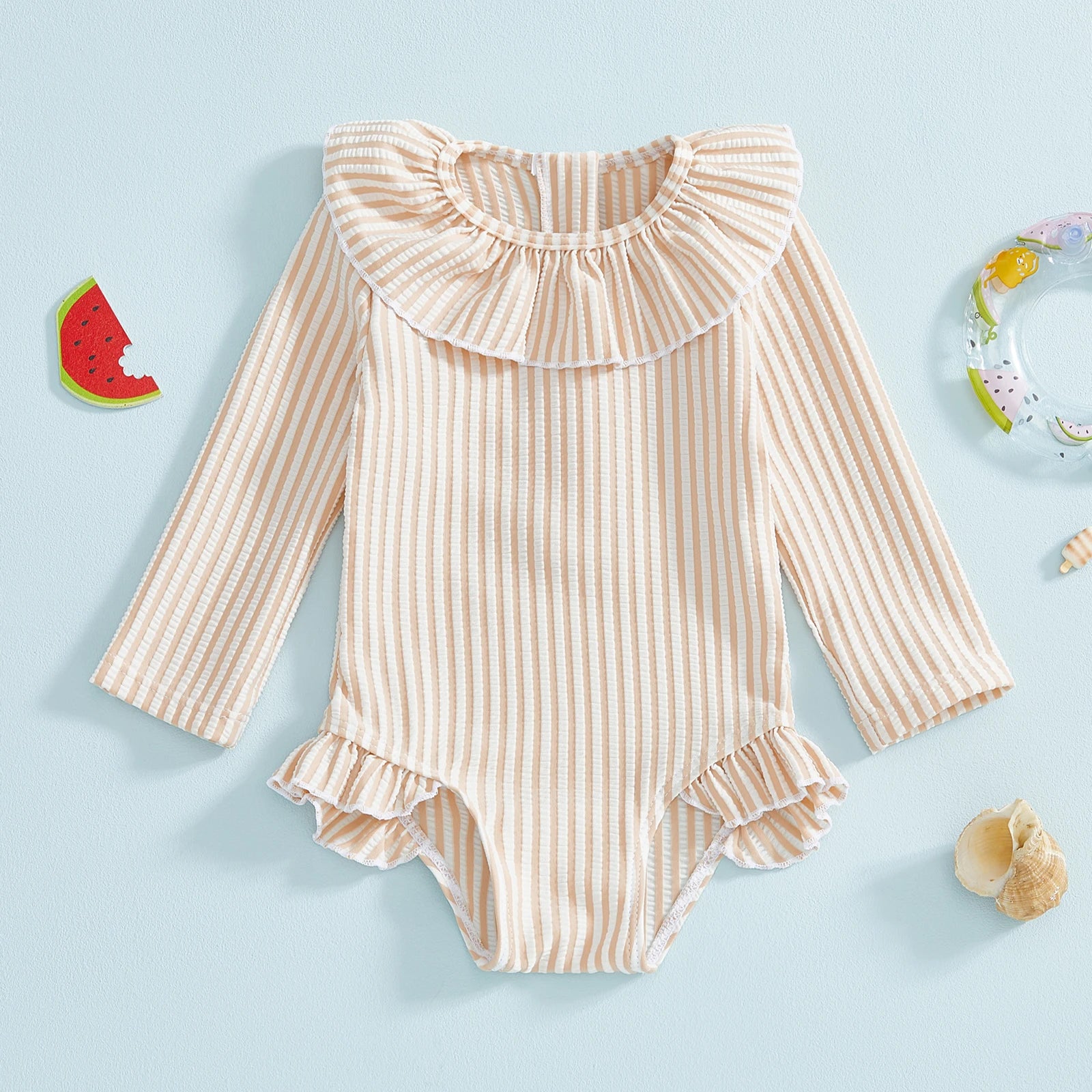 Baby Toddler Girl Rash Guard Swimsuit Long Sleeve Ruffled Collar Striped Swimwear Bathing Suit for Beach Pool