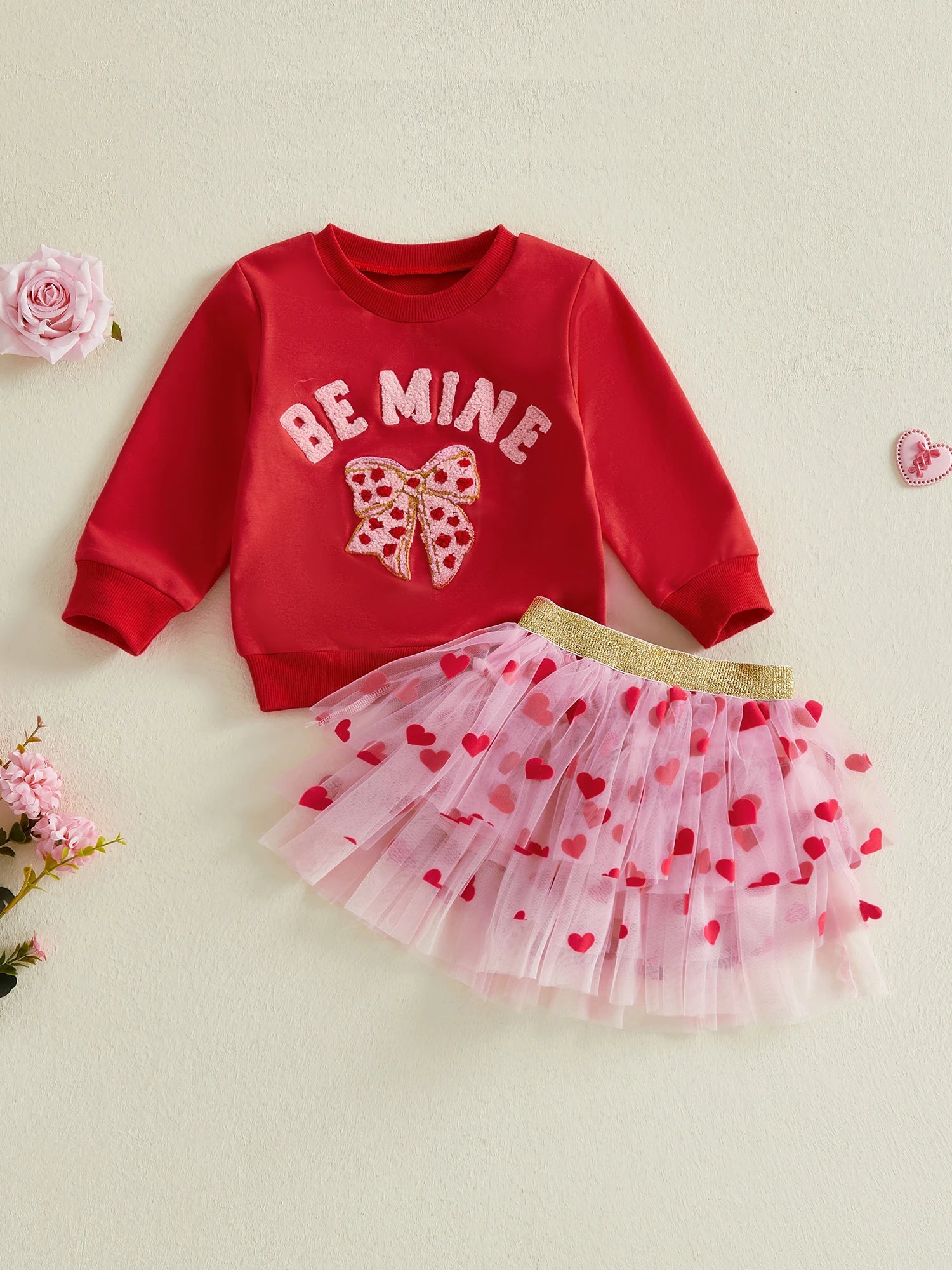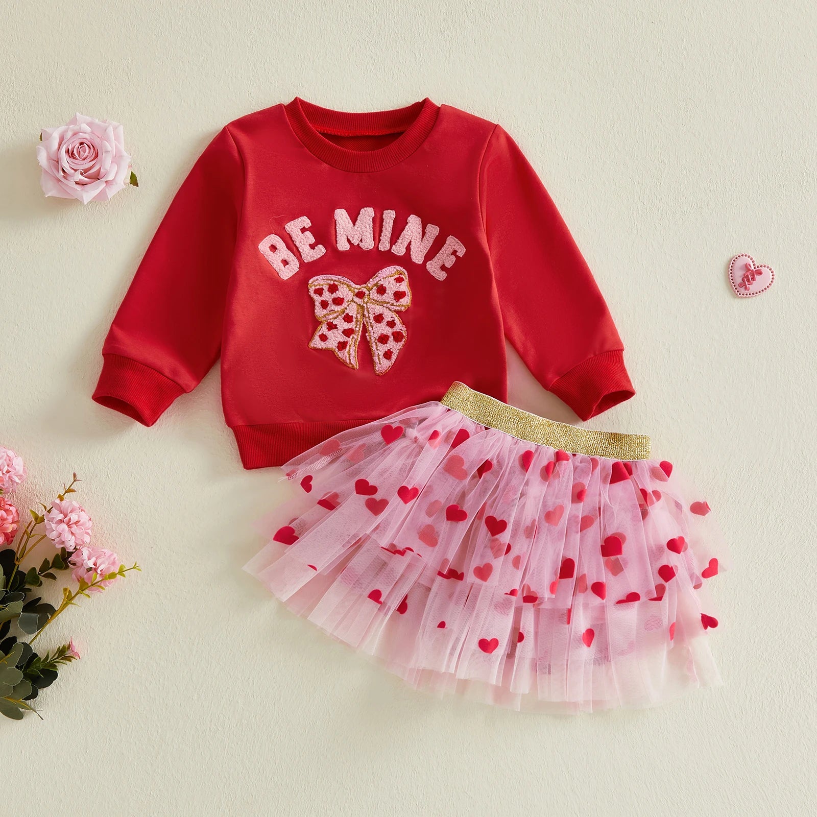 Baby Toddler Girls 2Pcs Be Mine Valentine's Day Outfit Letter Bow Embroidered Long Sleeve Top and Heart Print Mesh Tutu Skirt Set
