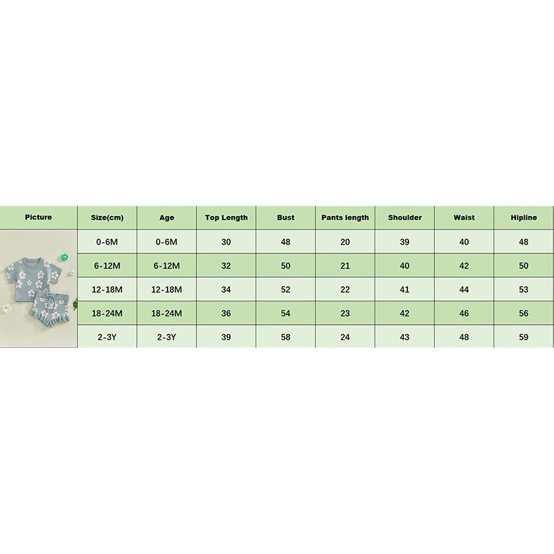0-6M Tops Length: 11.81 Bust: 18.90 Sleeve: 3.54 Shoulder: 15.35 Waist: 15.75 Shorts Length: 7.87 Hip: 18.90 Advised Age: 0-6 Months