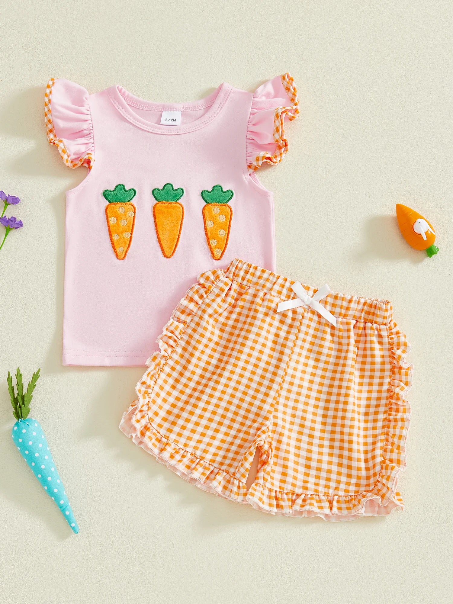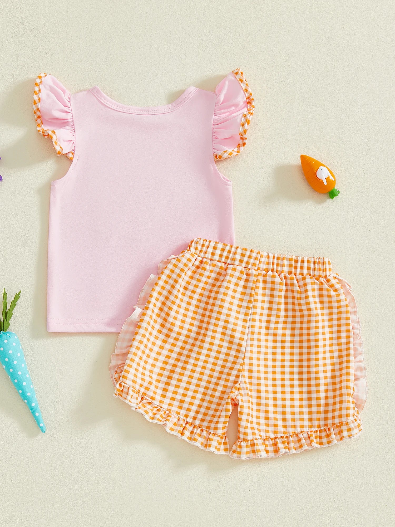 Baby Toddler Girls 2Pcs Easter Outfit Carrot Embroidered Flying Sleeve Top and Plaid Shorts Set