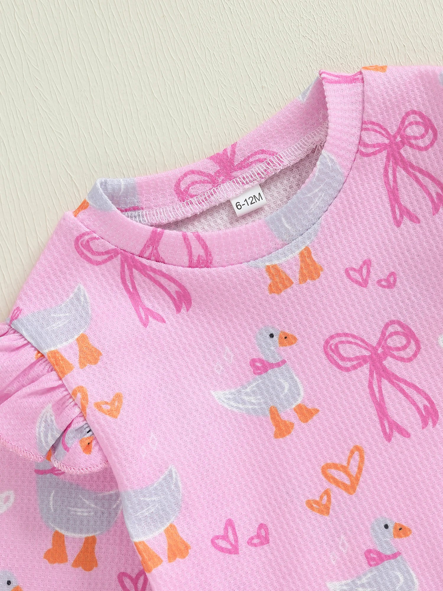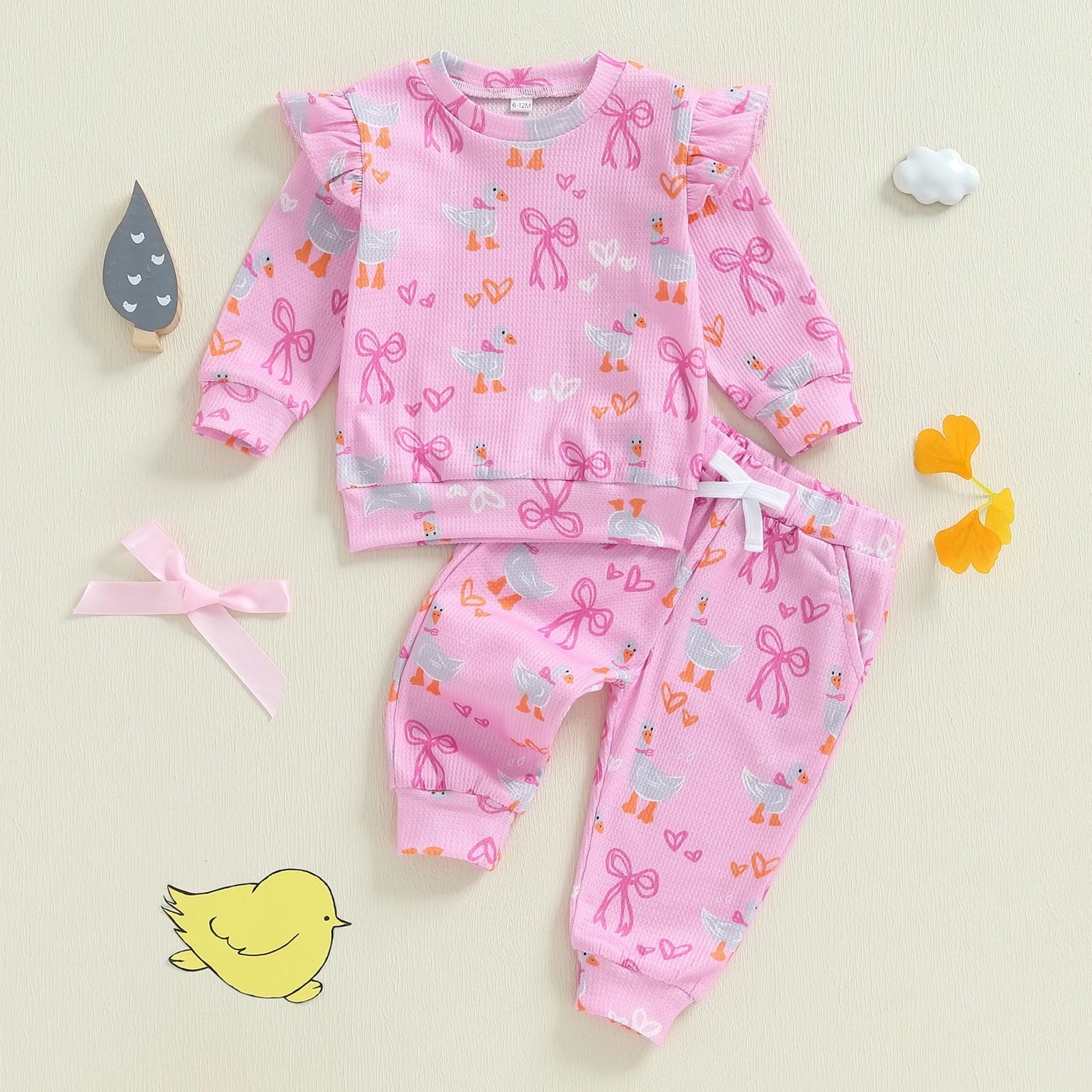 Baby Toddler Girls 2Pcs Fall Outfit Goose Bow Print Long Sleeve Round Neck Pullover Elastic Waist Pants Jogger Set