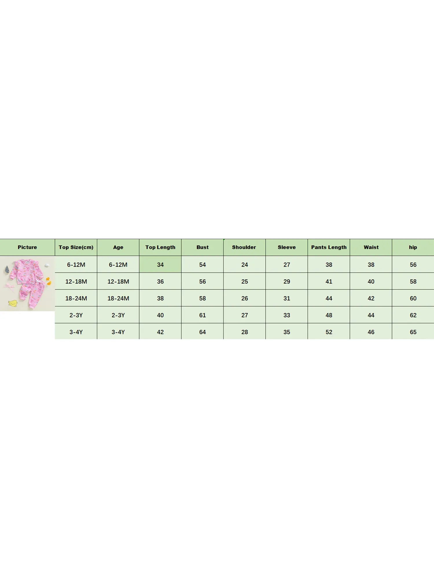 3-4Y Tops Length: 16.54 Bust: 25.98 Sleeve: 13.39 Shoulder: 11.42 Pants Length: 22.44 Waist: 18.90 Hip: 27.56 Advised Age: 3-4 Years
