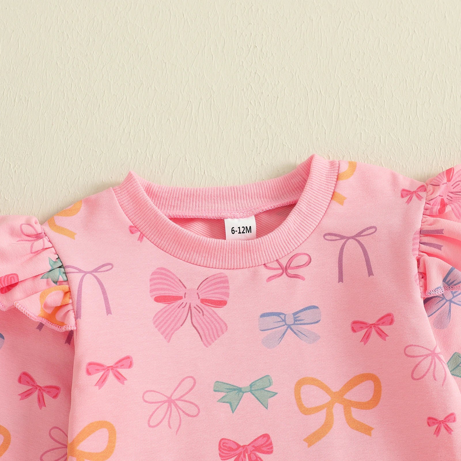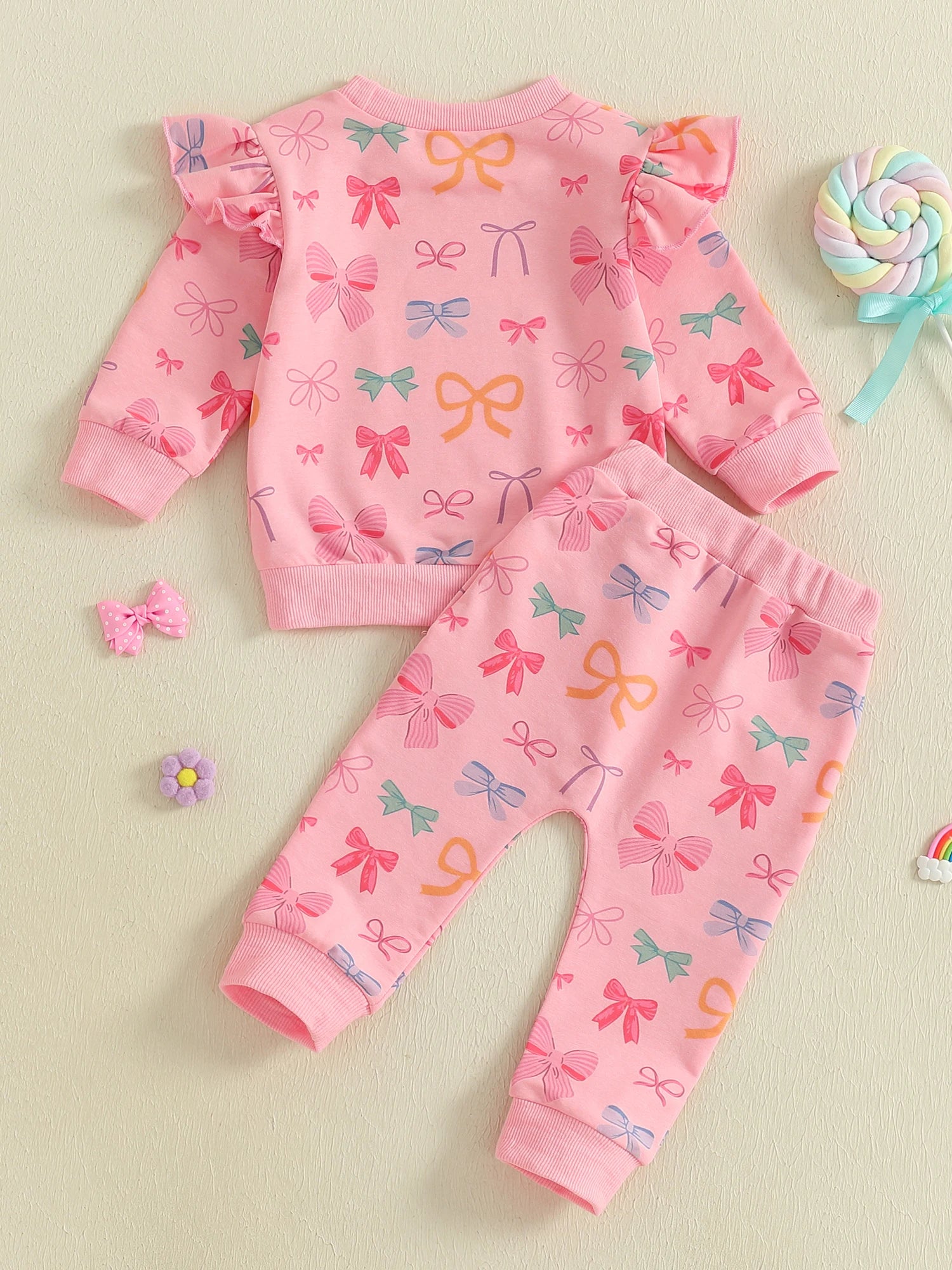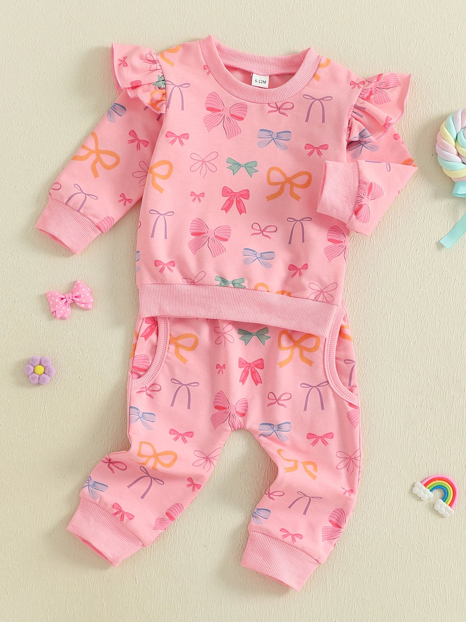 Baby Toddler Girls 2Pcs Fall Outfits Bow Print Ruffled Long Sleeve Top and Elastic Pants Jogger Set