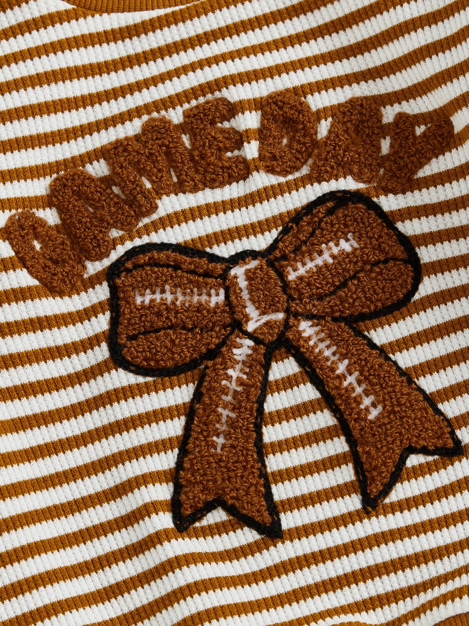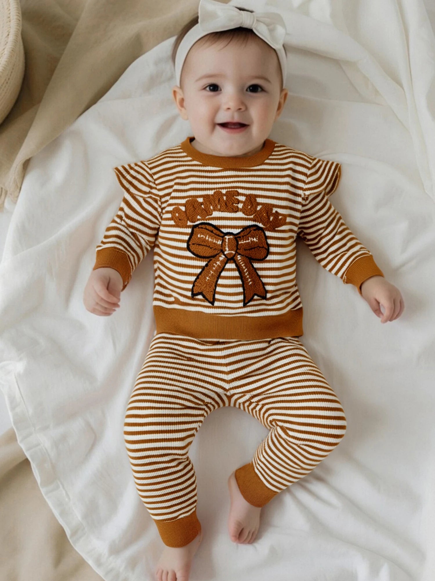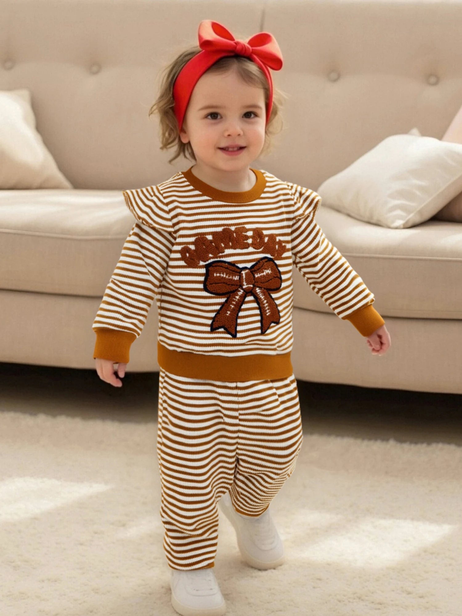 Baby Toddler Girls 2Pcs Game Day Fall Outfits Letter Bow Embroidered Striped Crew Neck Long Sleeve Top with Jogger Pants 2Pcs Set