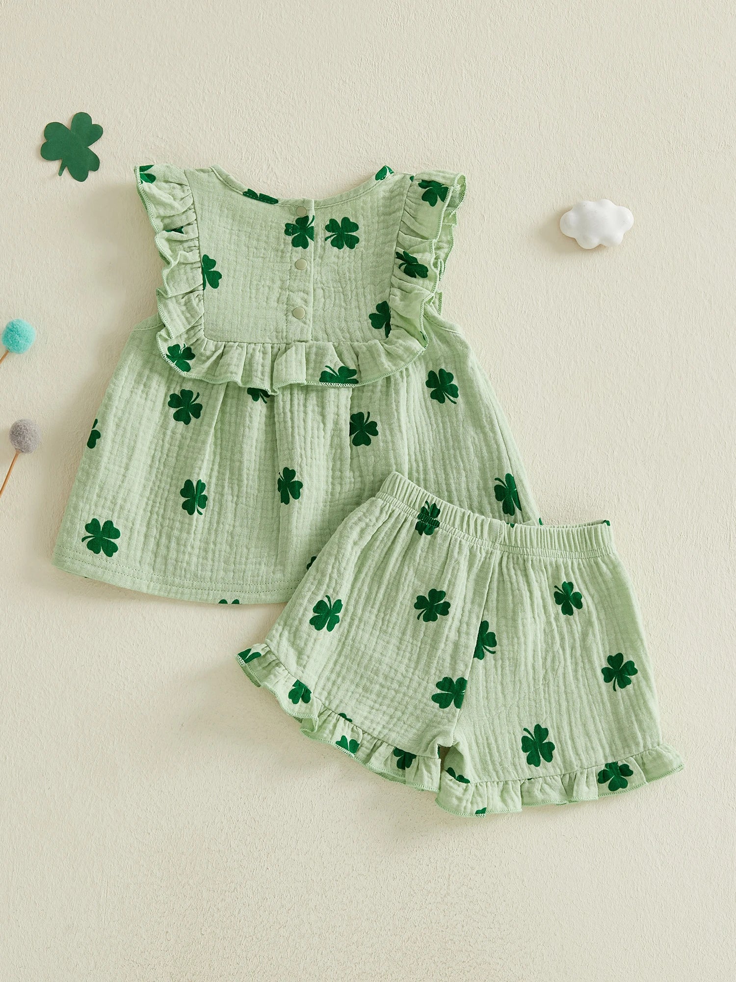 Baby Toddler Girls 2Pcs Irish Outfit Sleeveless Clover Shamrock Print Ruffle Top Shorts Set St. Patrick's Day