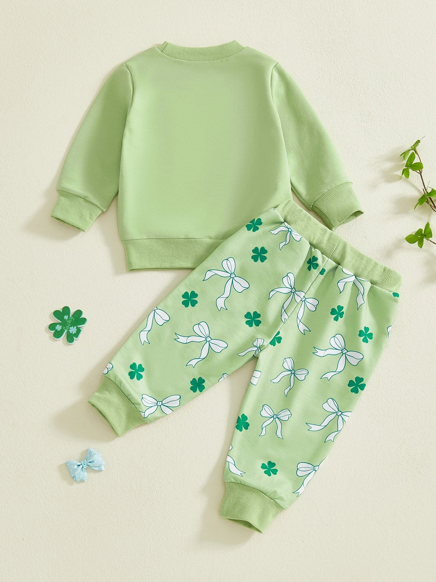 Baby Toddler Girls 2Pcs Little Charmer St. Patrick's Day Long Sleeve O Neck Letter Bow Embroidery Top Bow Clover Print Pants Jogger Set