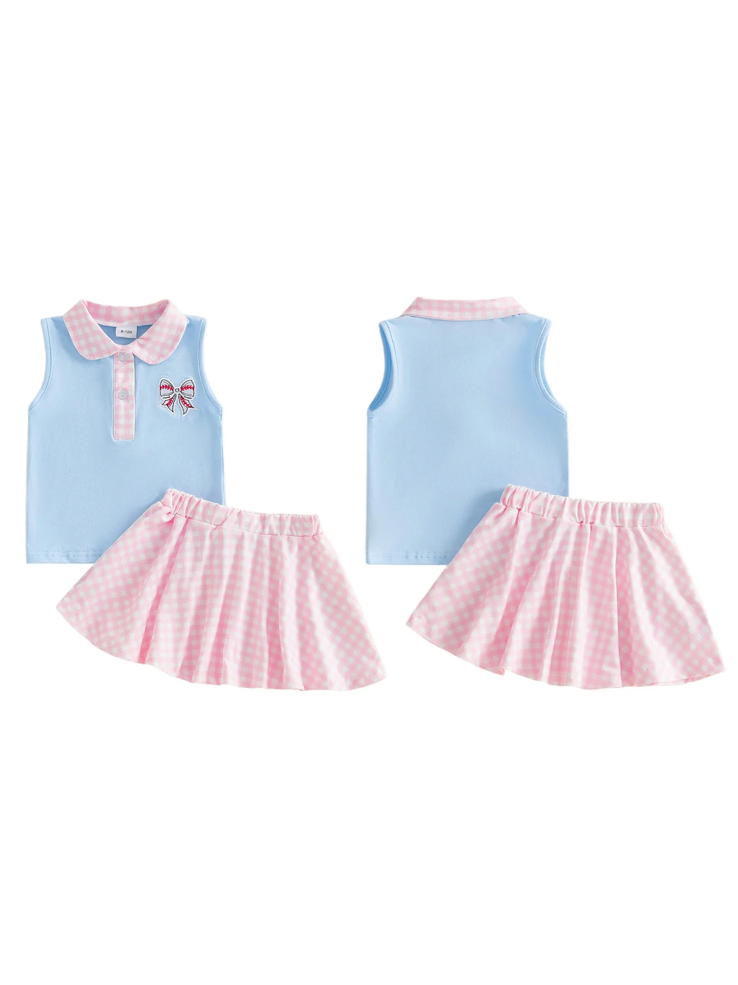Baby Toddler Girls 2Pcs Outfit Bow Embroidery Sleeveless Turn Down Collar Tank Top and Elastic Waist Plaid Skirt Set